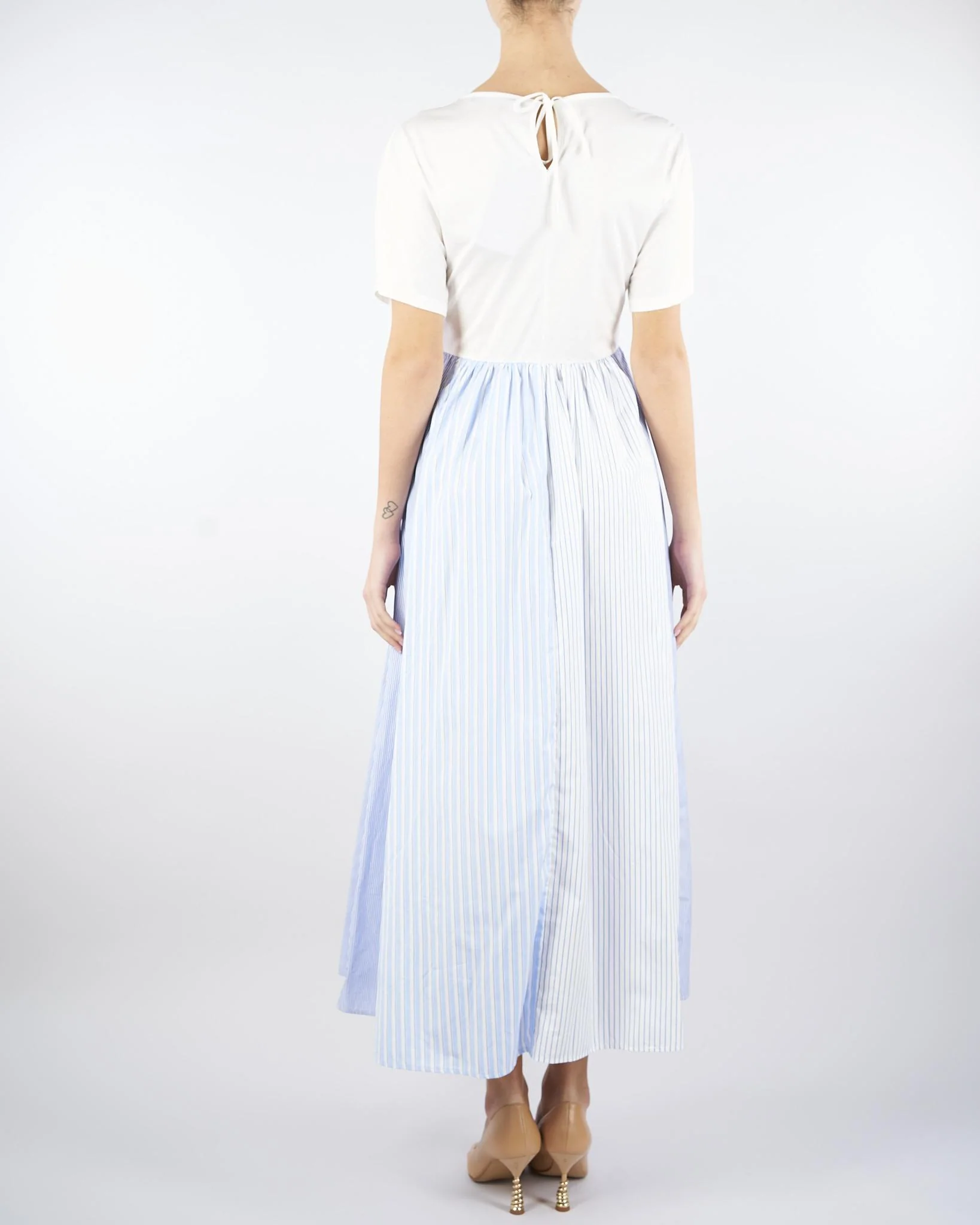 Abito lungo dal volume ampio, caratterizzato da top in jersey di cotone e gonna in popeline di cotone con tagli verticali decorativi e motivo arricciato in vita. Il modello presenta ampio scollo a V, maniche corte a kimono, tasche inserite nei fianchi e chiusura a goccia sul retro con laccetti.