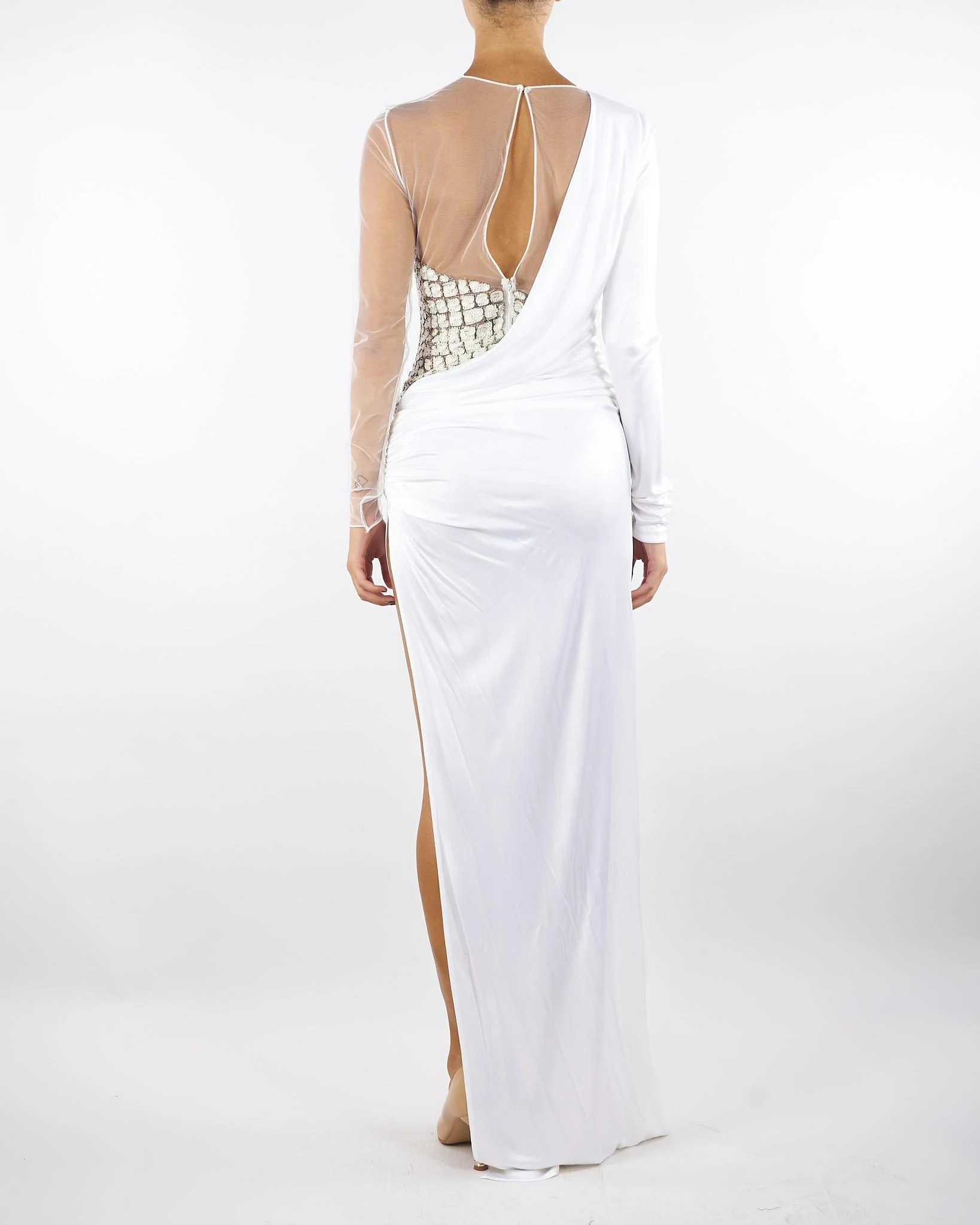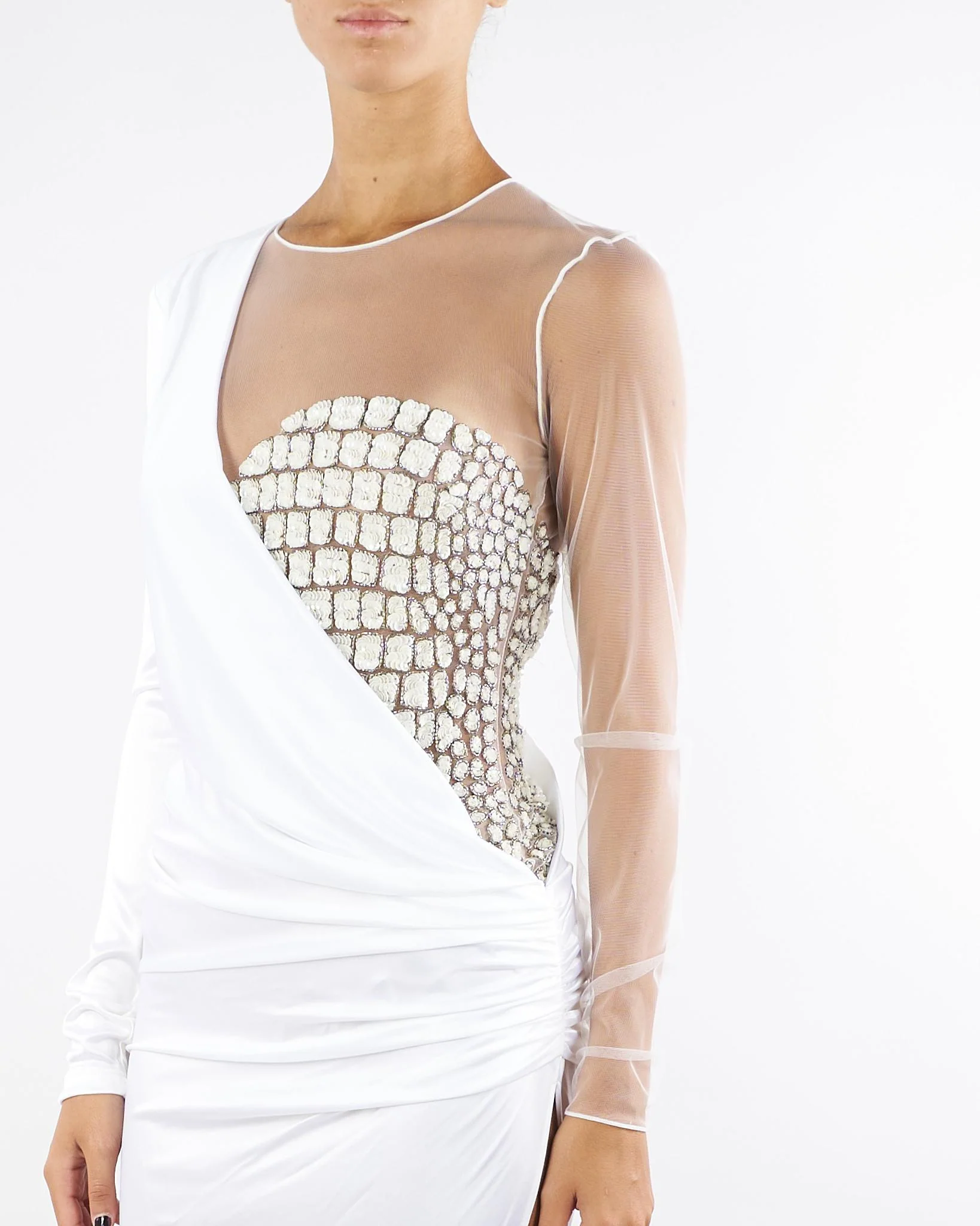 Abito da sera asimmetrico e dalla vestibilità aderente. Il vestito si distingue per il busto con manica realizzata in tulle, arricchito dal ricamo a mano con texture effetto cocco. La costruzione in jersey di viscosa lucida fluisce in un drappeggio laterale, che si apre in un ampio spacco sulla gonna.