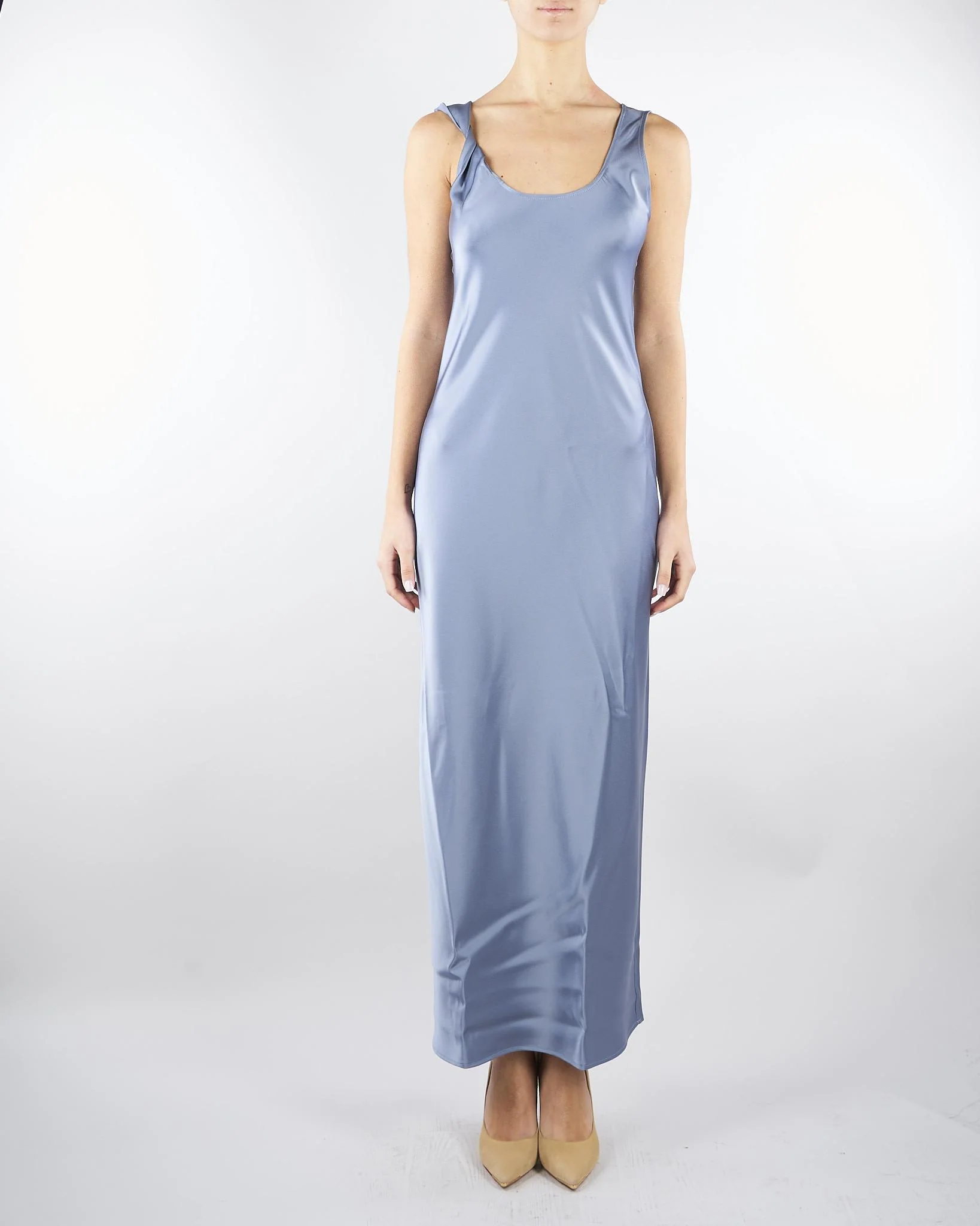L’eleganza del double satin, l’essenzialità di un abito dal taglio a canotta. Impossibile resistere al fascino di questo design, reso unico dal torchon sulla spalla che aggiunge un tocco dinamico.
