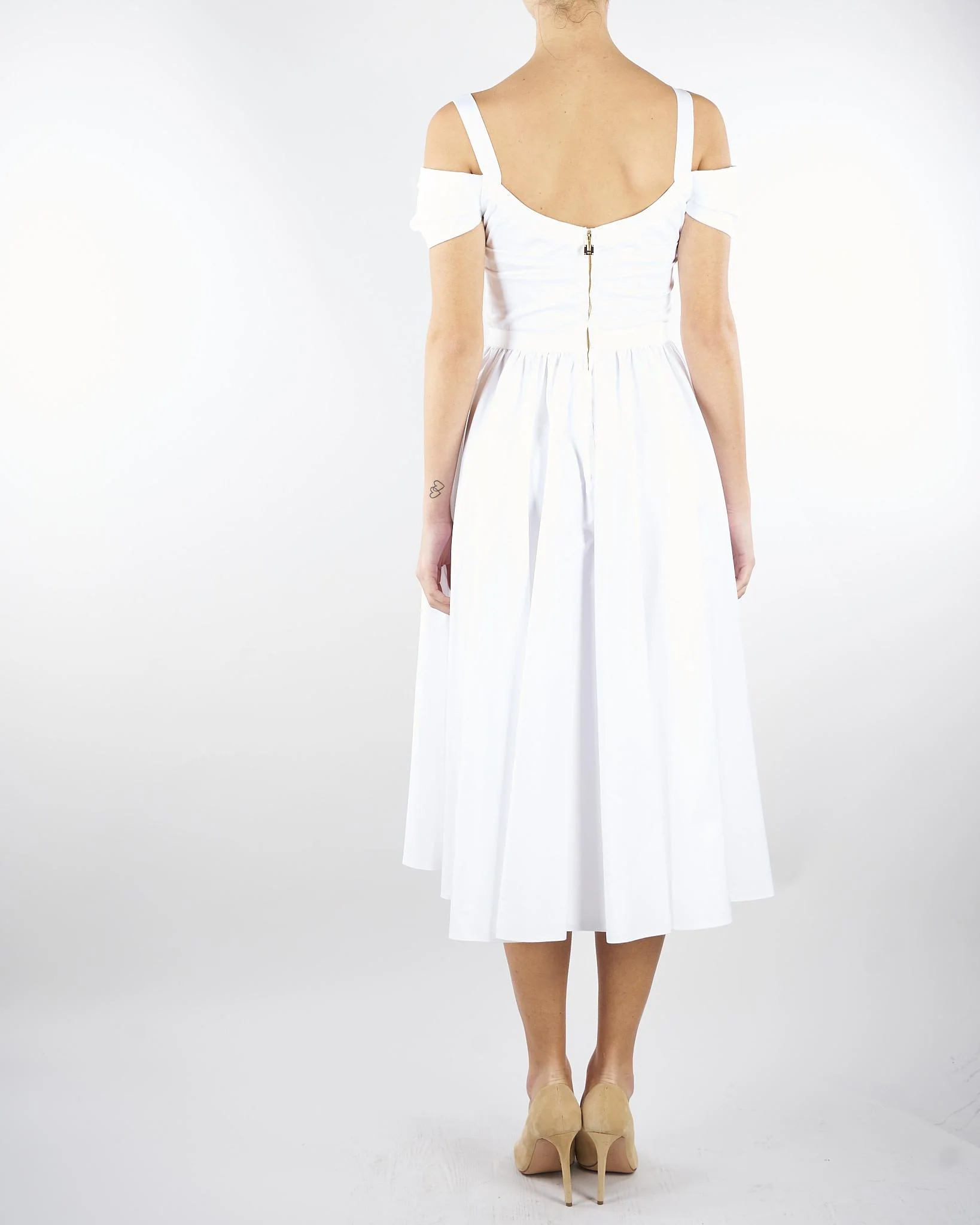 Abito in cotone stretch dalla vestibilità regular. Il vestito ha spalline, maniche corte e si distingue per l’ampia gonna a ruota che aggiunge movimento alla sua silhouette raffinata. Un dettaglio di luce con la collana in metallo dorato, posizionata sullo scollo e amovibile.