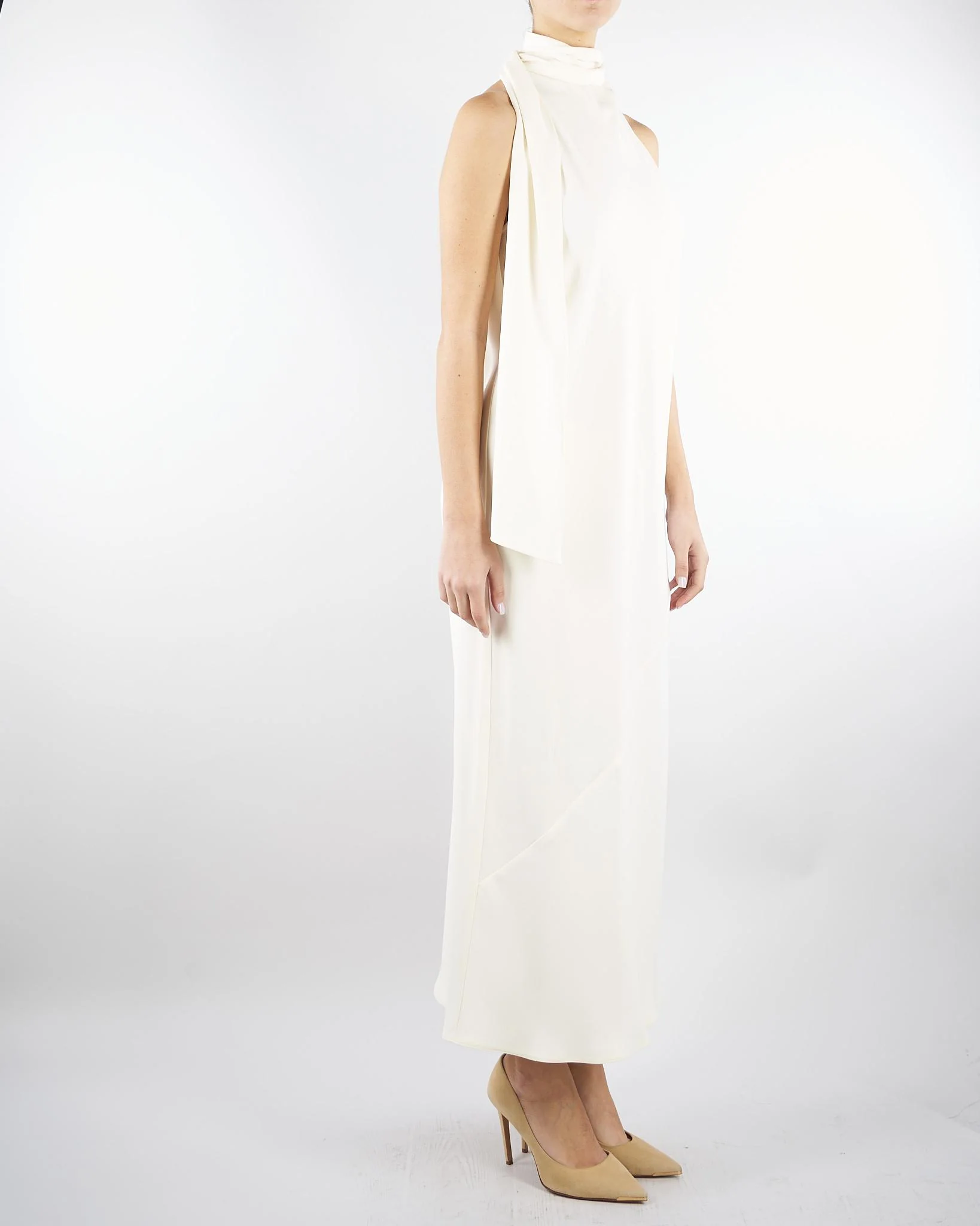 Lungo e fluente, l’abito in envers satin è protagonista delle occasioni speciali, grazie alla sua silhouette essenziale e allo scollo con fusciacca da annodare a piacere. Fit regolare. Scollo leggermente rialzato con sciarpa da annodare. Chiusura con bottone sulla spalla sinistra.