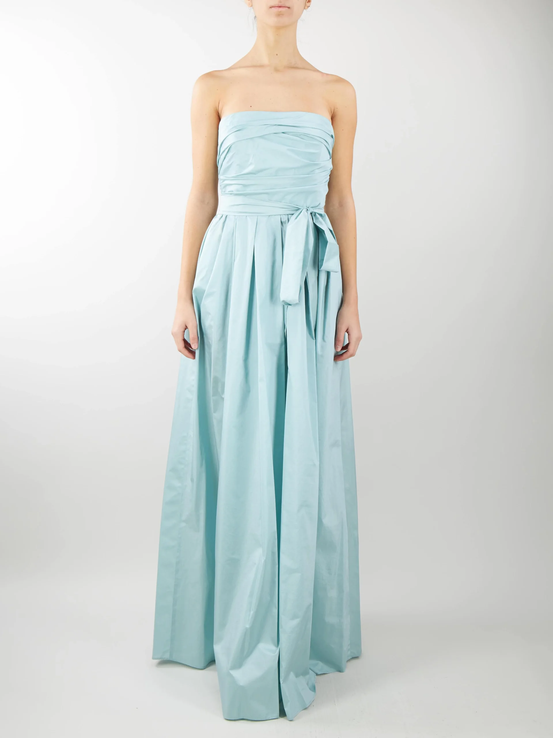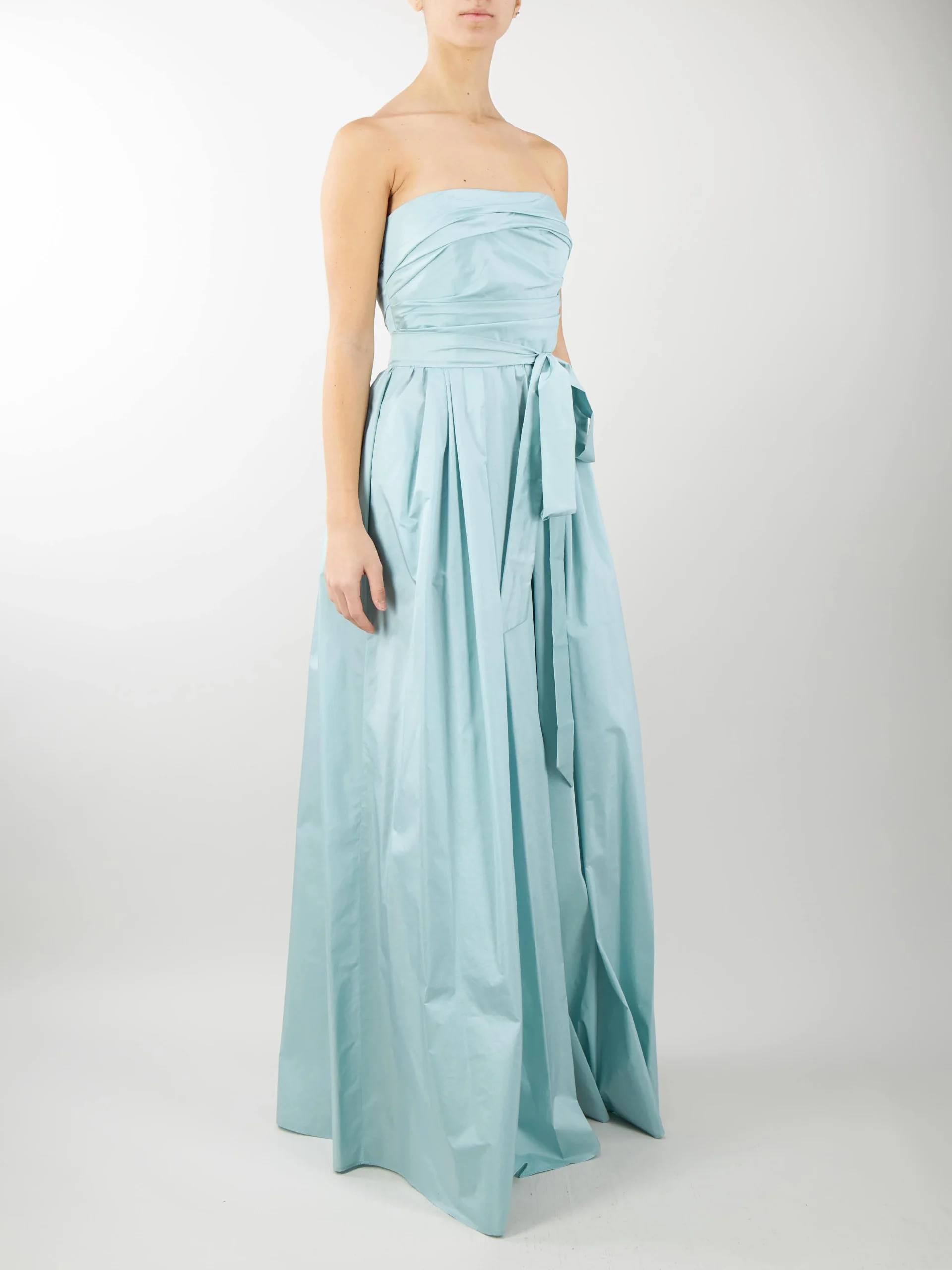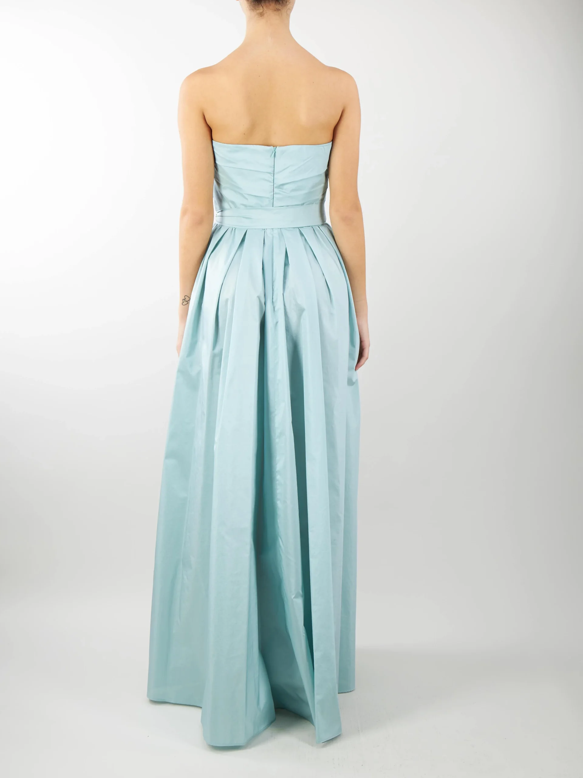 Abito bustier in pregiato taffetà di mista seta, caratterizzato da un motivo drappeggiato d’ispirazione couture e cintura abbinata ad evidenziare il punto vita. Modello dalla linea elegante e femminile. Taglio in vita con motivo a pieghe e tasche inserite nei fianchi. Chiusura invisibile sul retro