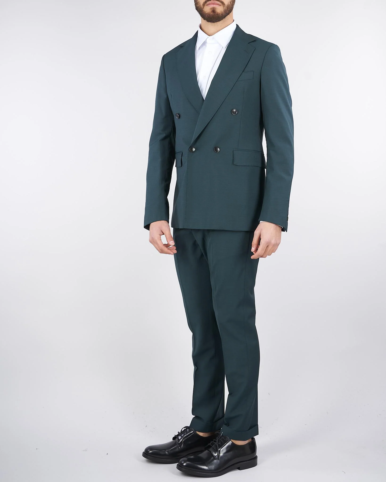 Abito in fresco lana di Ungaro. Modello doppiopetto con rever a specchio, tasche a filo con pattina sul davanti e taschino sul petto. Chiusura centrale con bottoni. Doppio spacco sul retro. Pantalone slim, tasche francesi laterali e tasche a filo sul retro. Fondo con risvolto. Chiusura con bottone. Vestibilità regular.