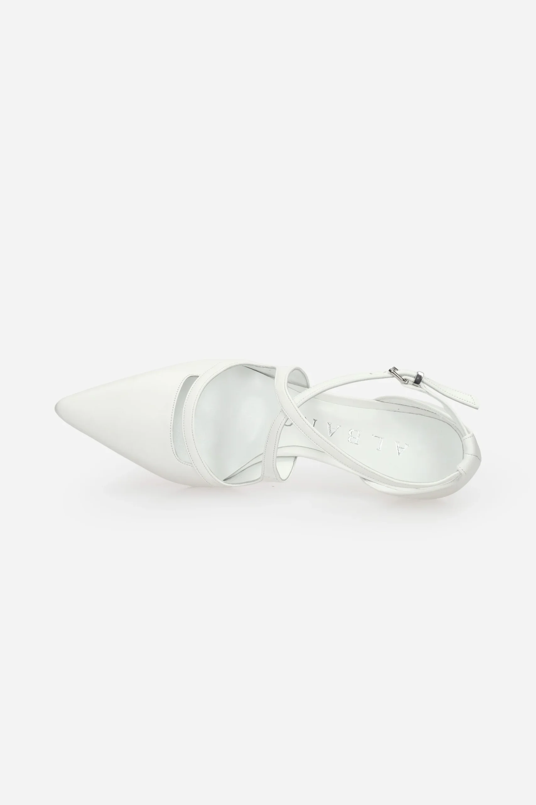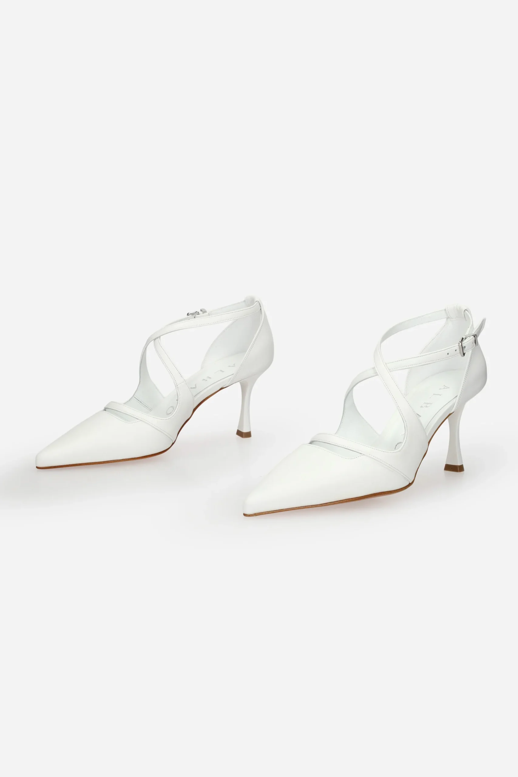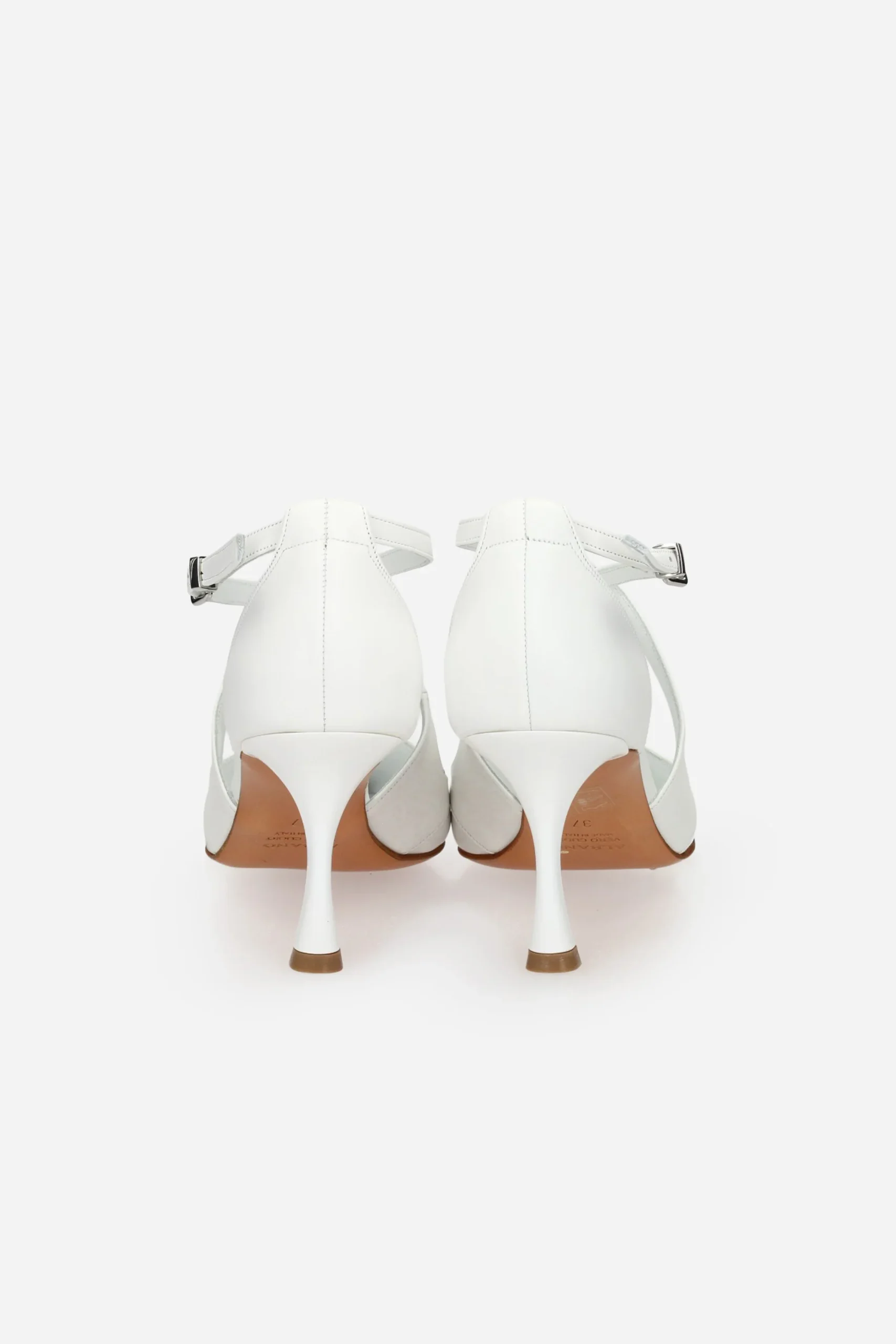 Presenta fasce ad incrocio davanti e cinturino al tallone con fibbia regolabile, plantare in pelle.