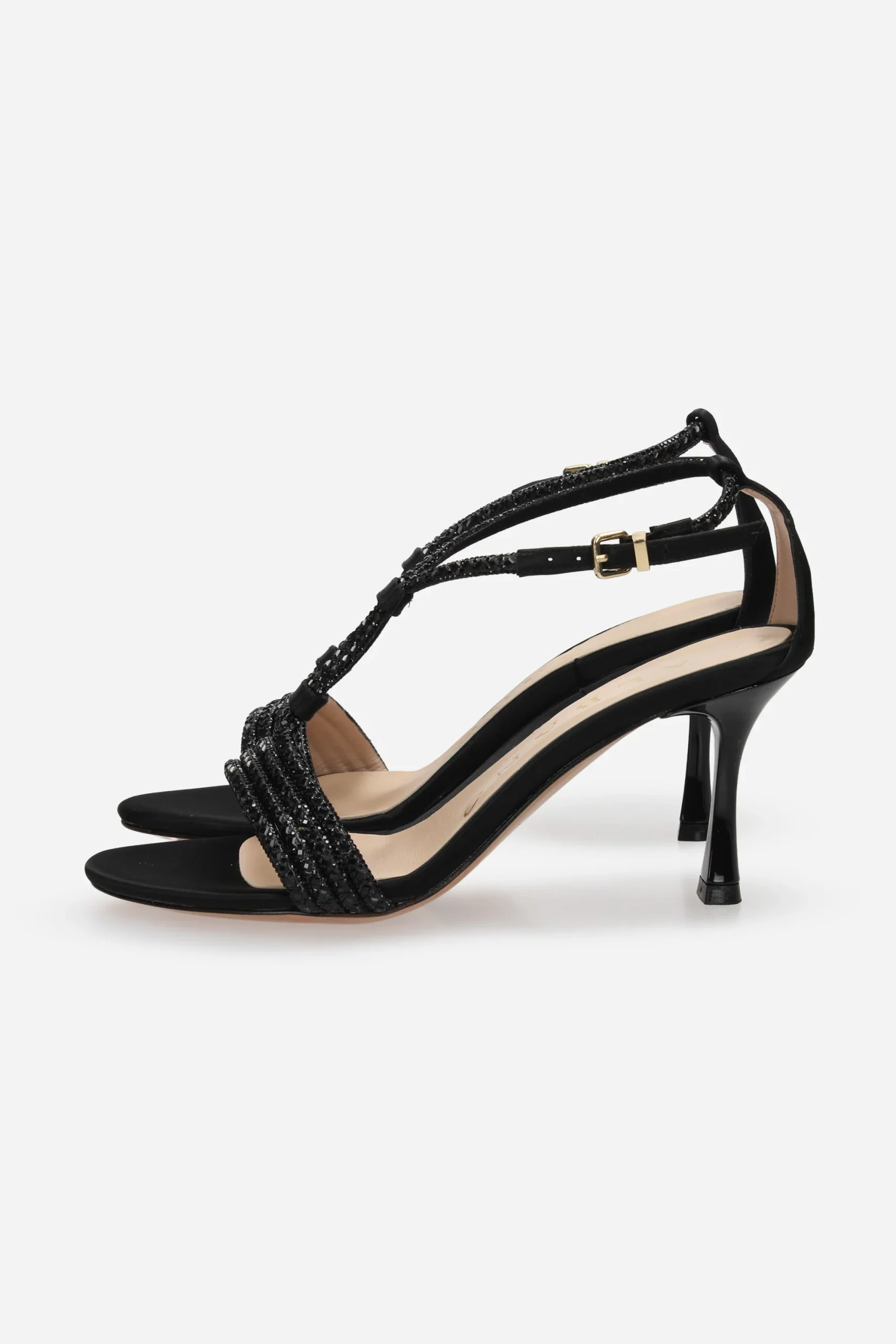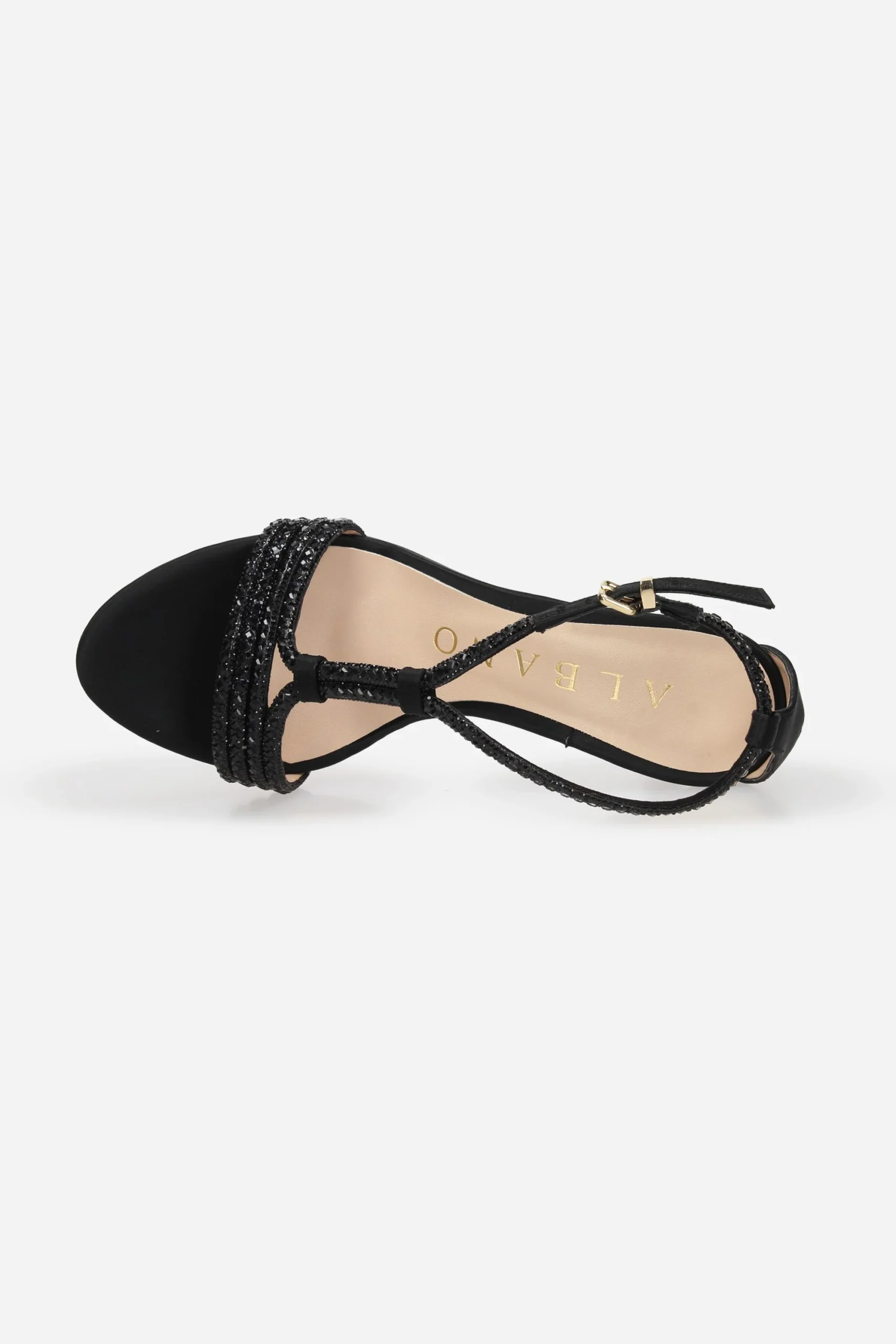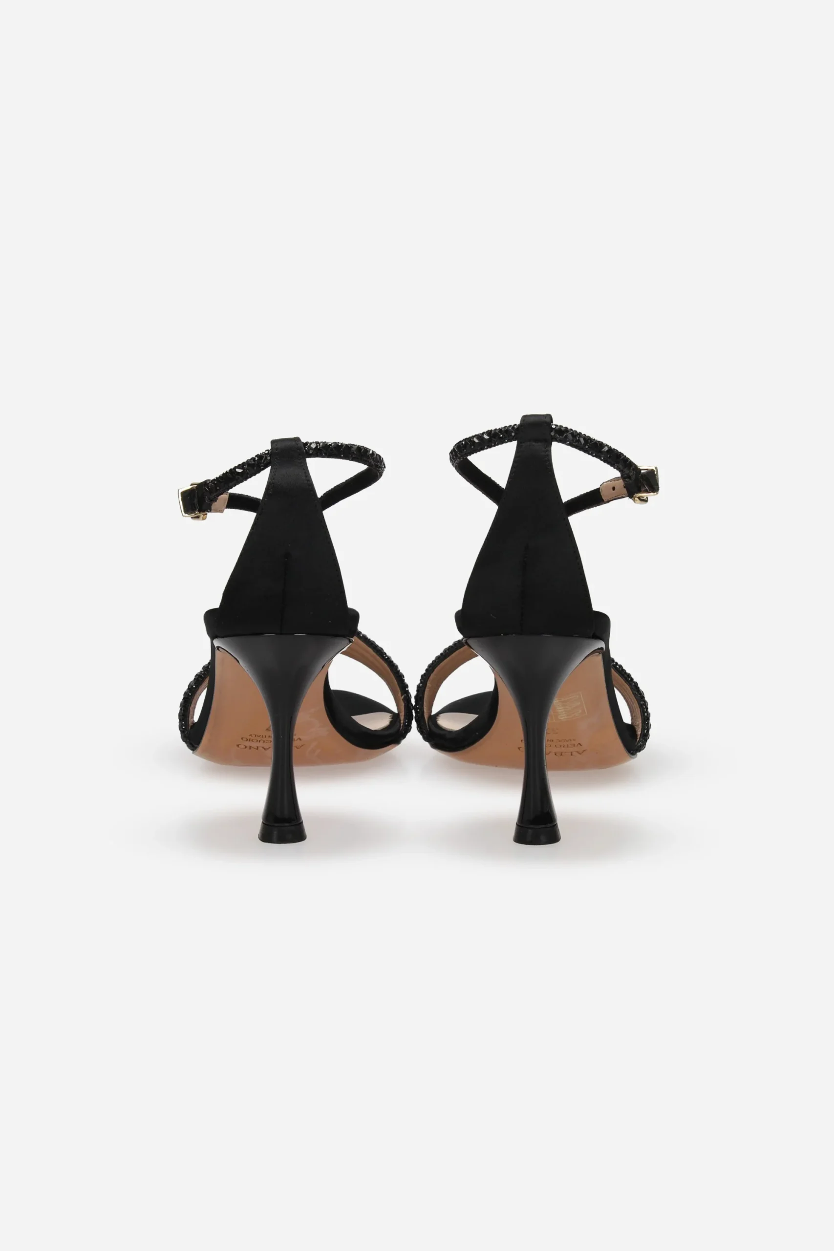 Presenta fasce sul davanti e sul collo del piede con strass, retro del tallone chiuso e cinturino con fibbia regolabile, plantare in pelle.