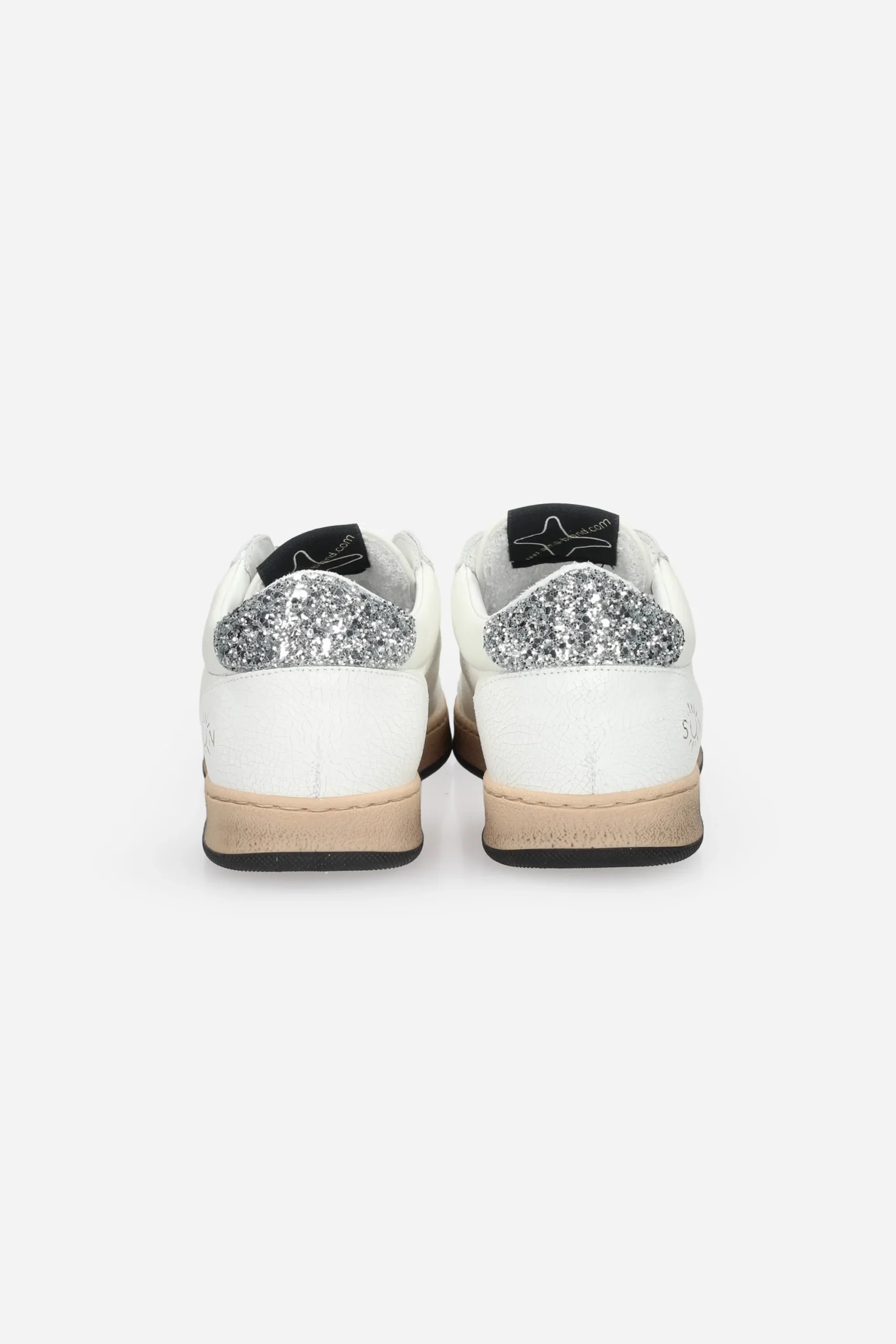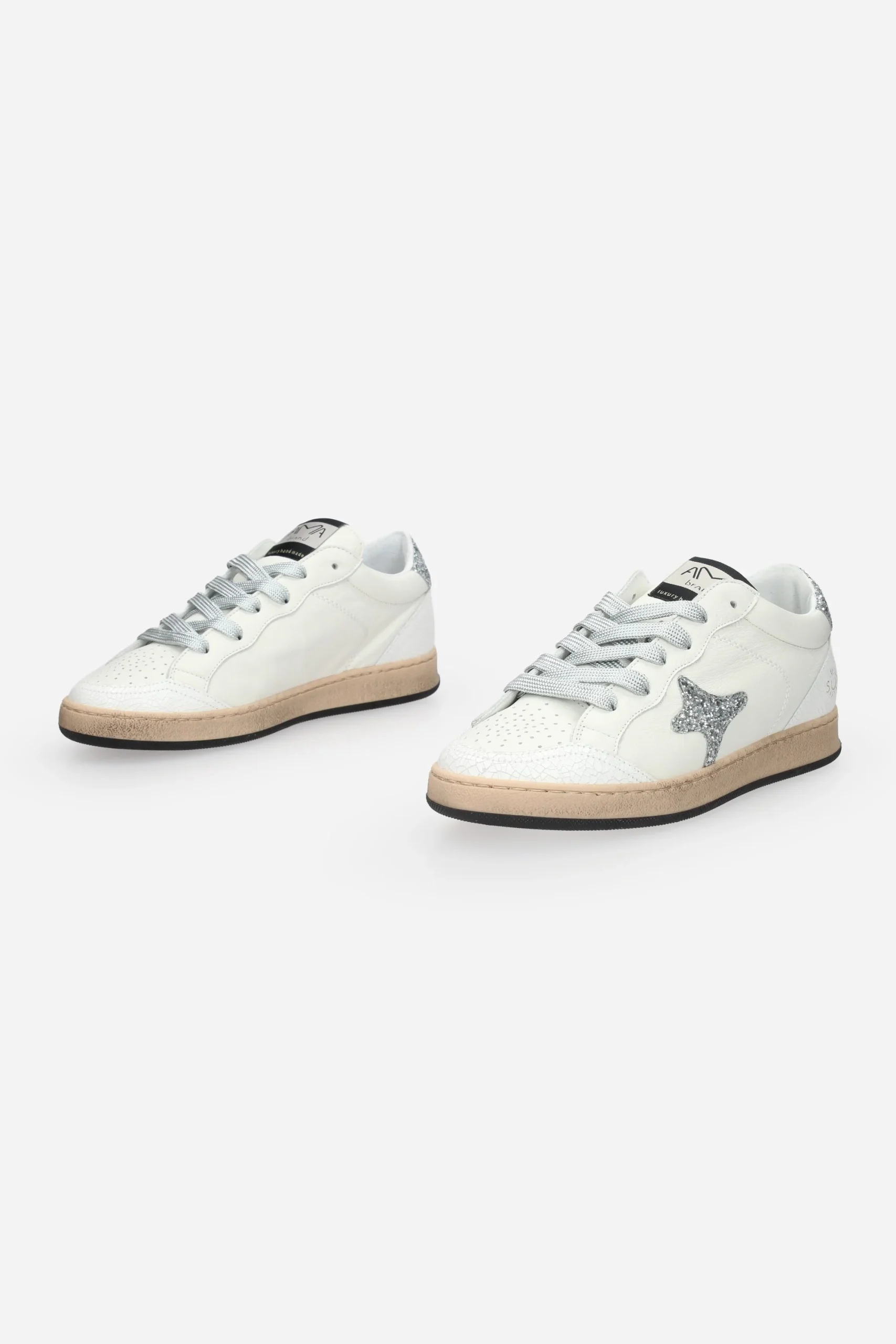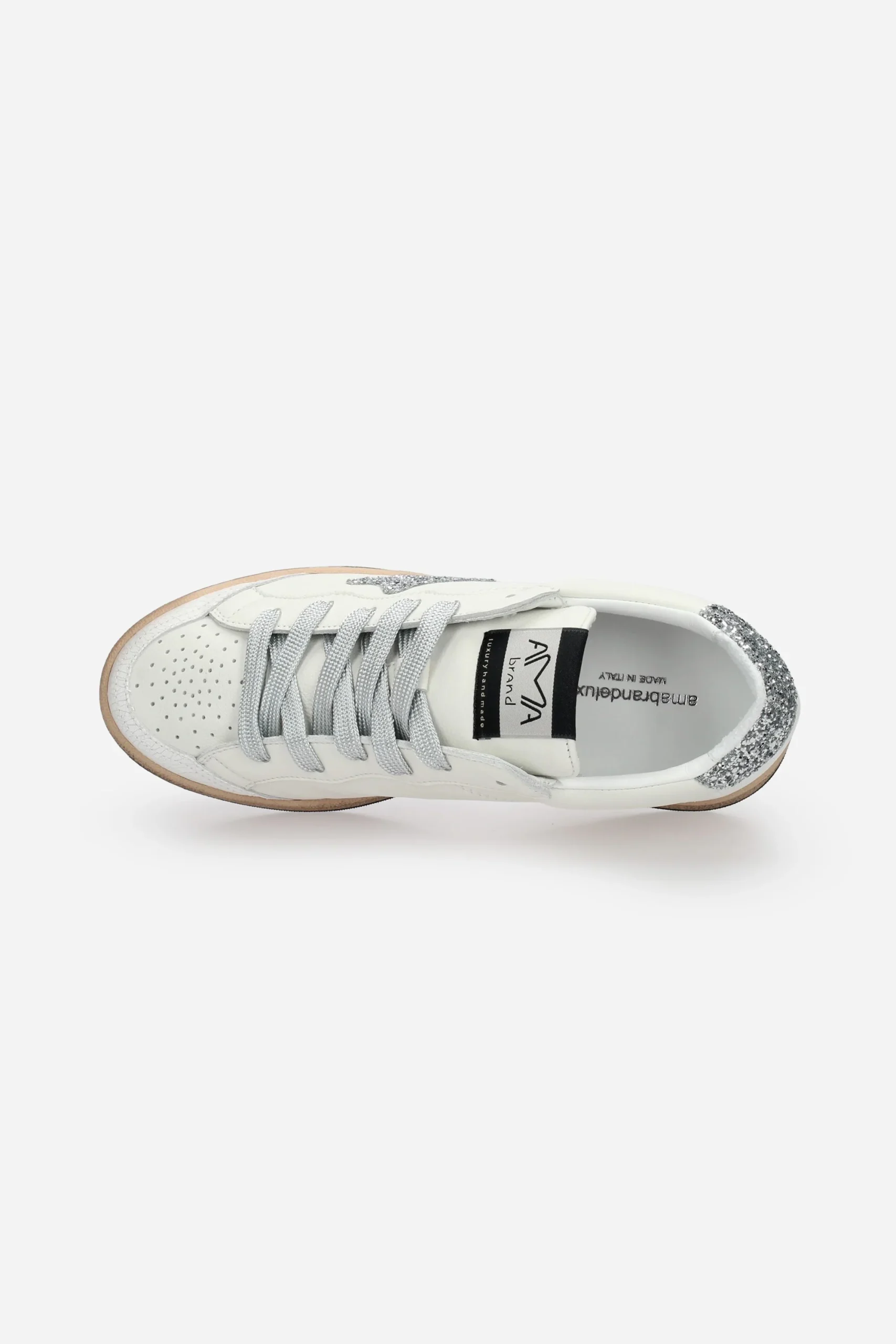 La sneakers è realizzata in pelle e pelle martellata con dettagli glitter.