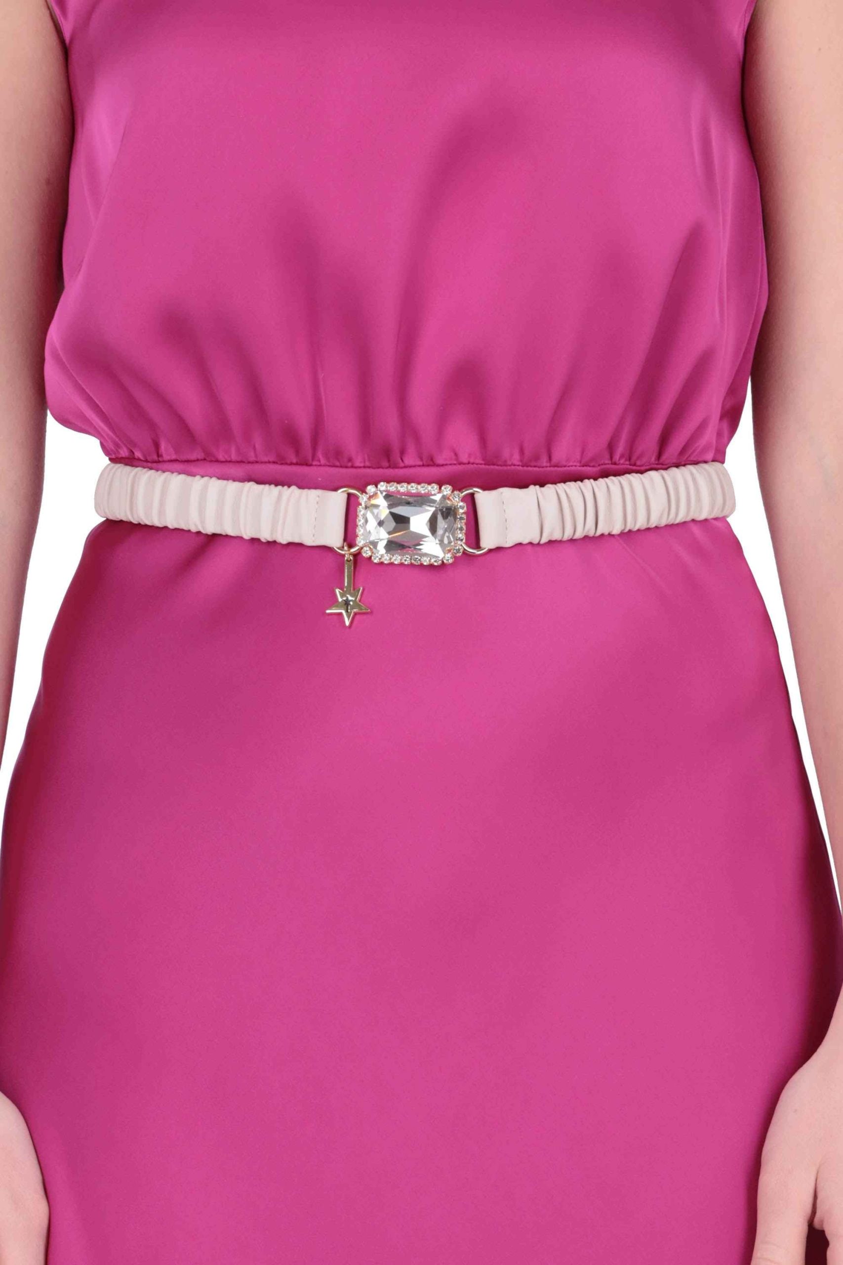 La cintura è realizzata in ecopelle con elastico e fibbia con applicazione di strass, con charms con logo.