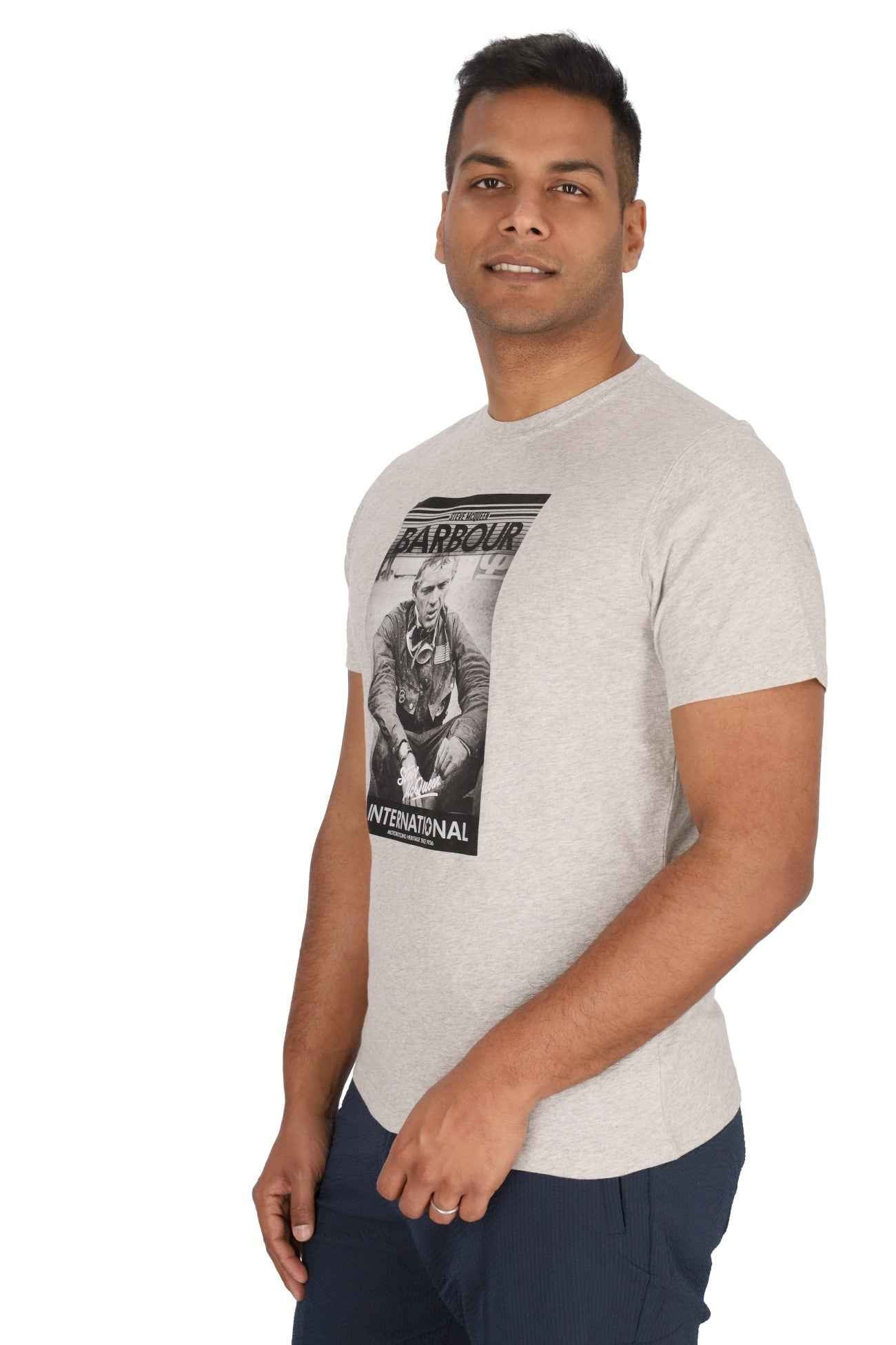 Presenta una stampa di un’immagine d’archivio di Steve McQueen sul petto.