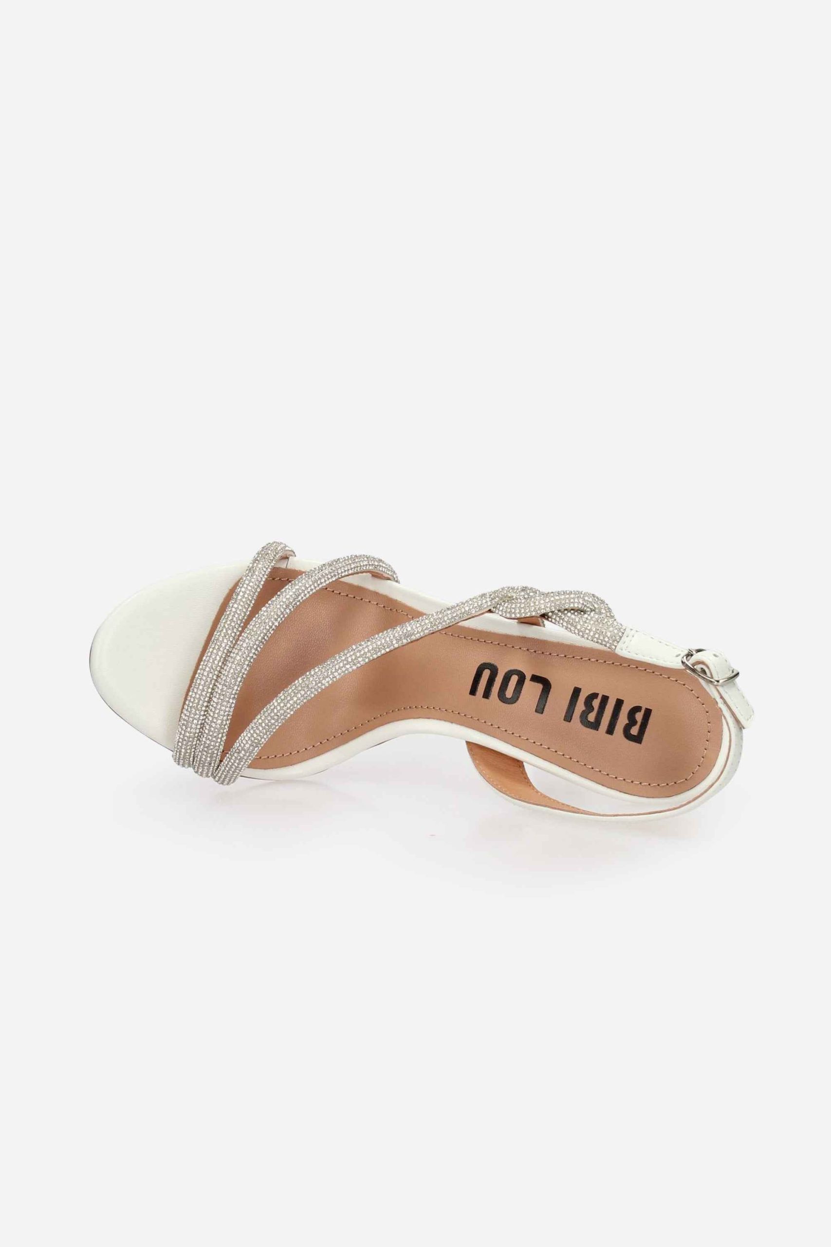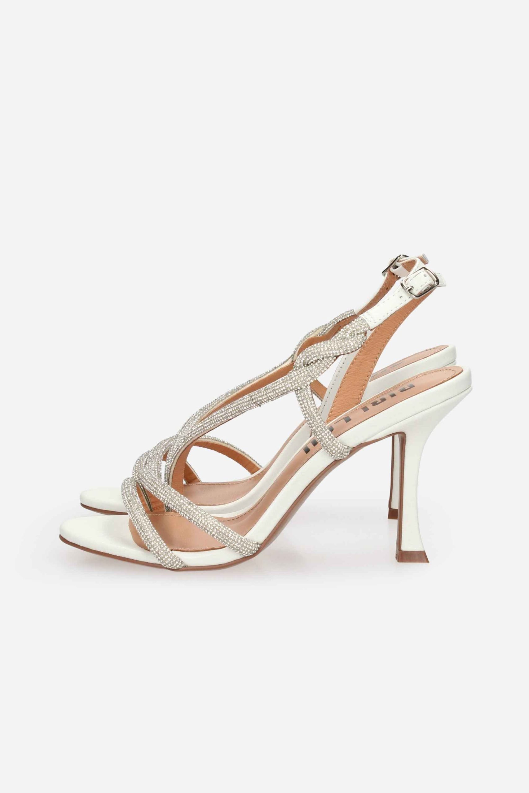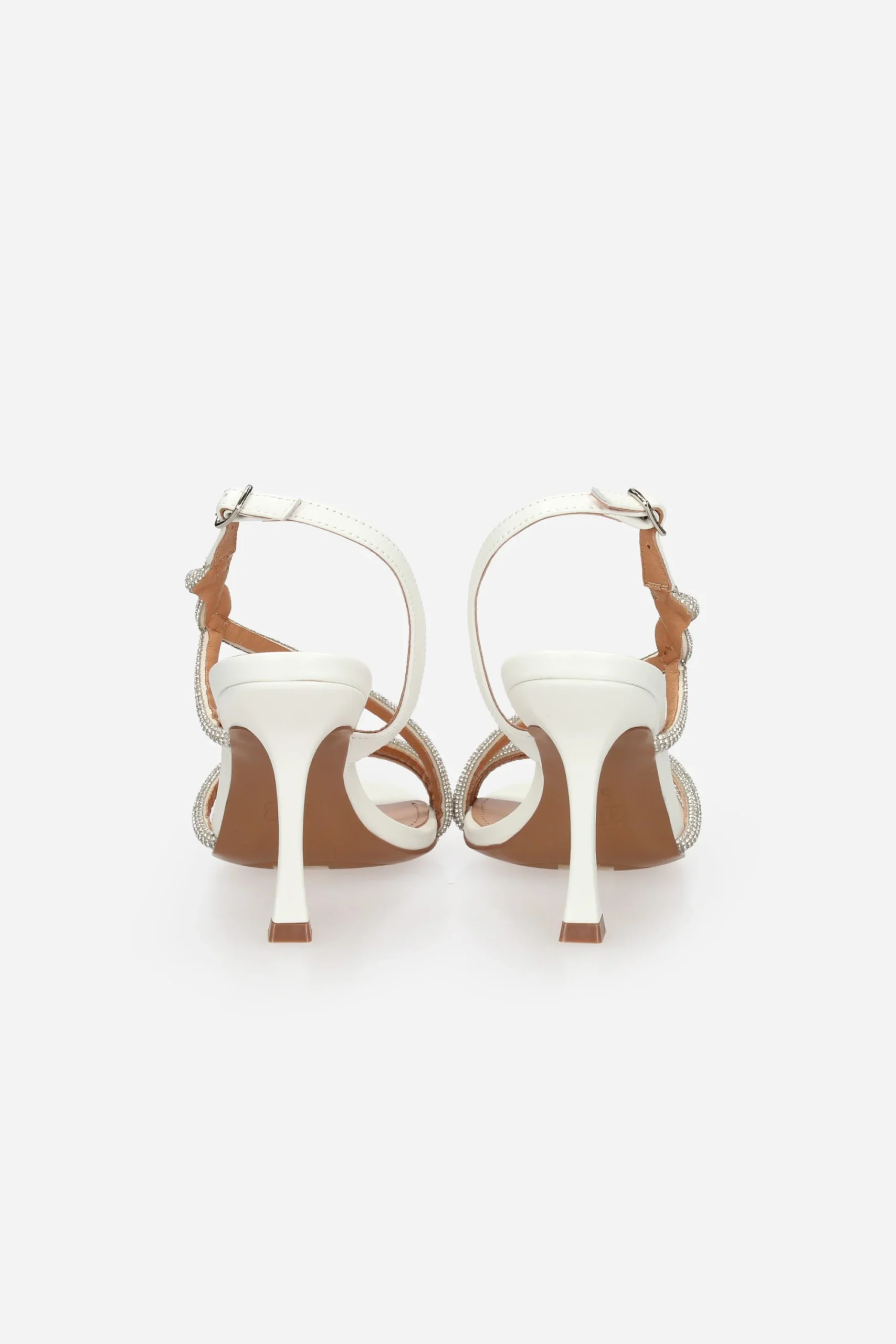 Presenta fasce sul davanti interamente in strass, cinturino al tallone con fibbia regolabile e plantare in pelle.