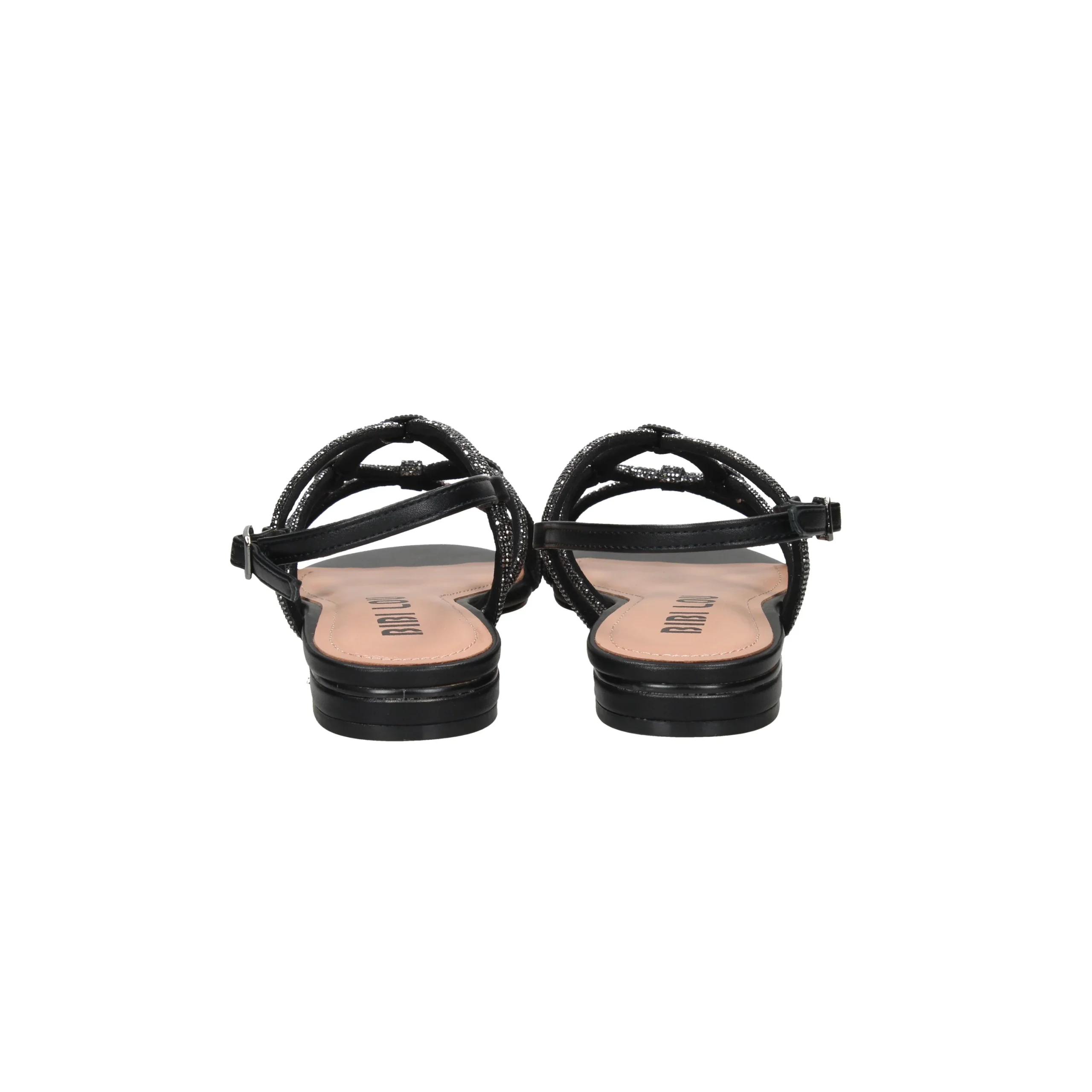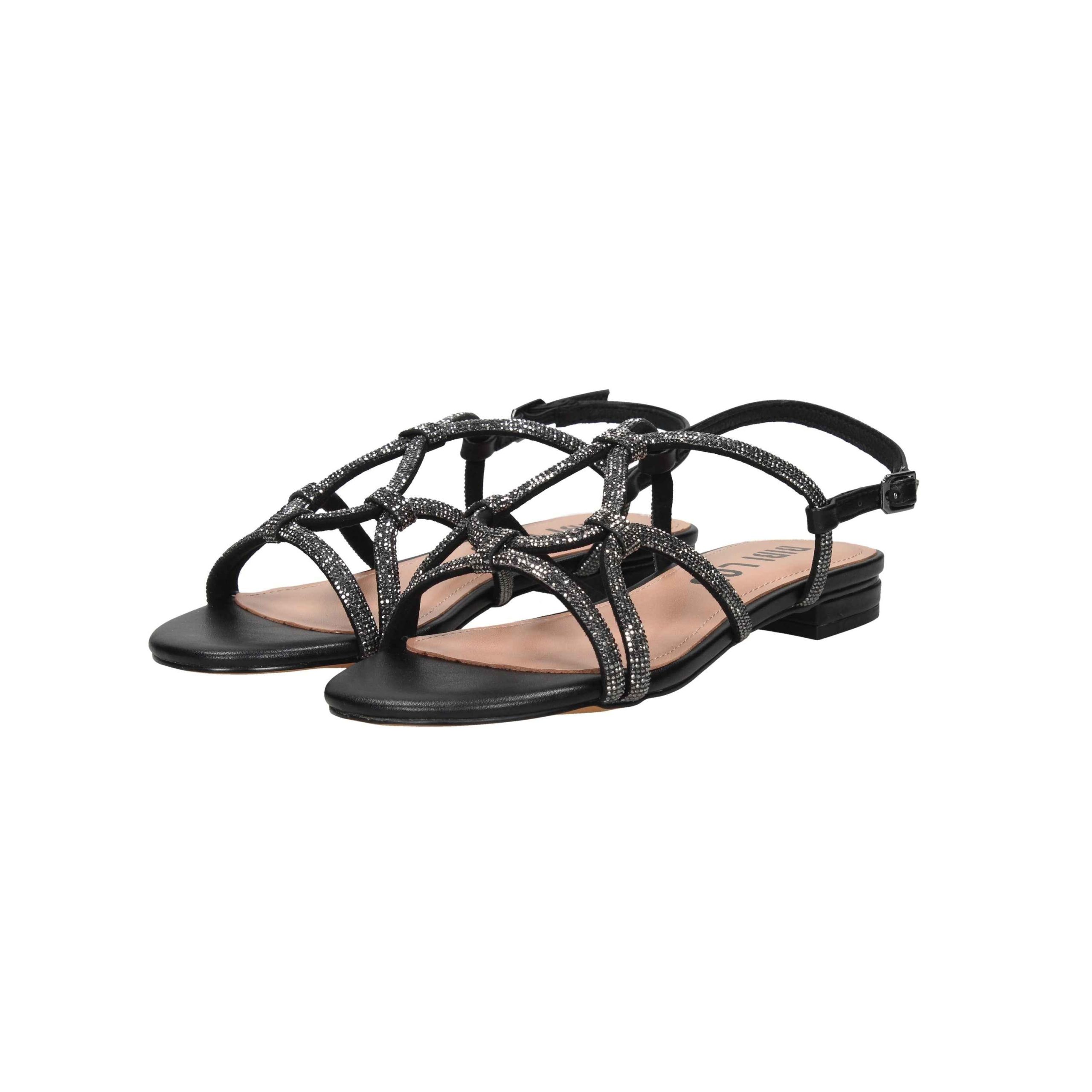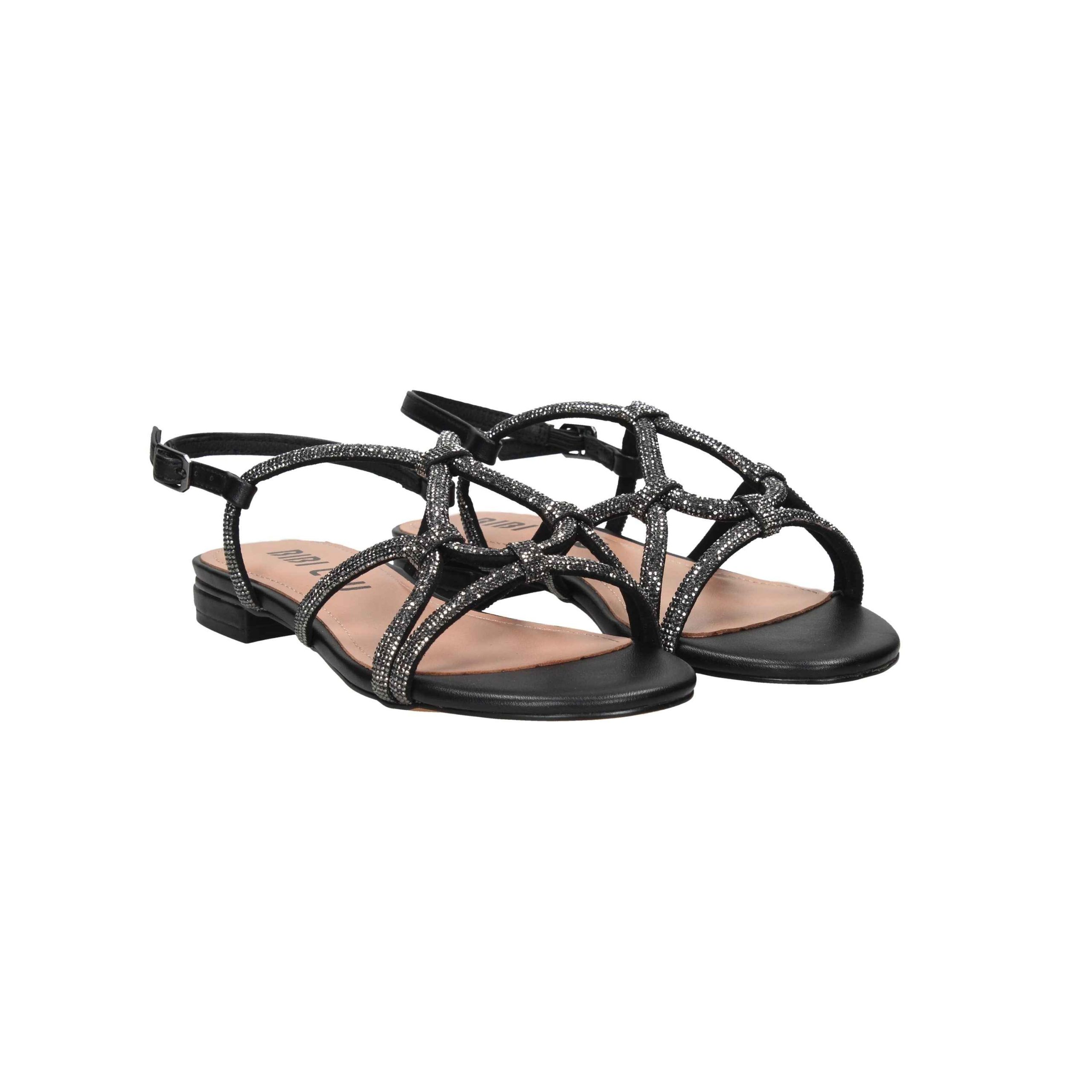 Presenta incrocio sul davanti interamente in strass, cinturino al tallone con fibbia regolabile e plantare in pelle.