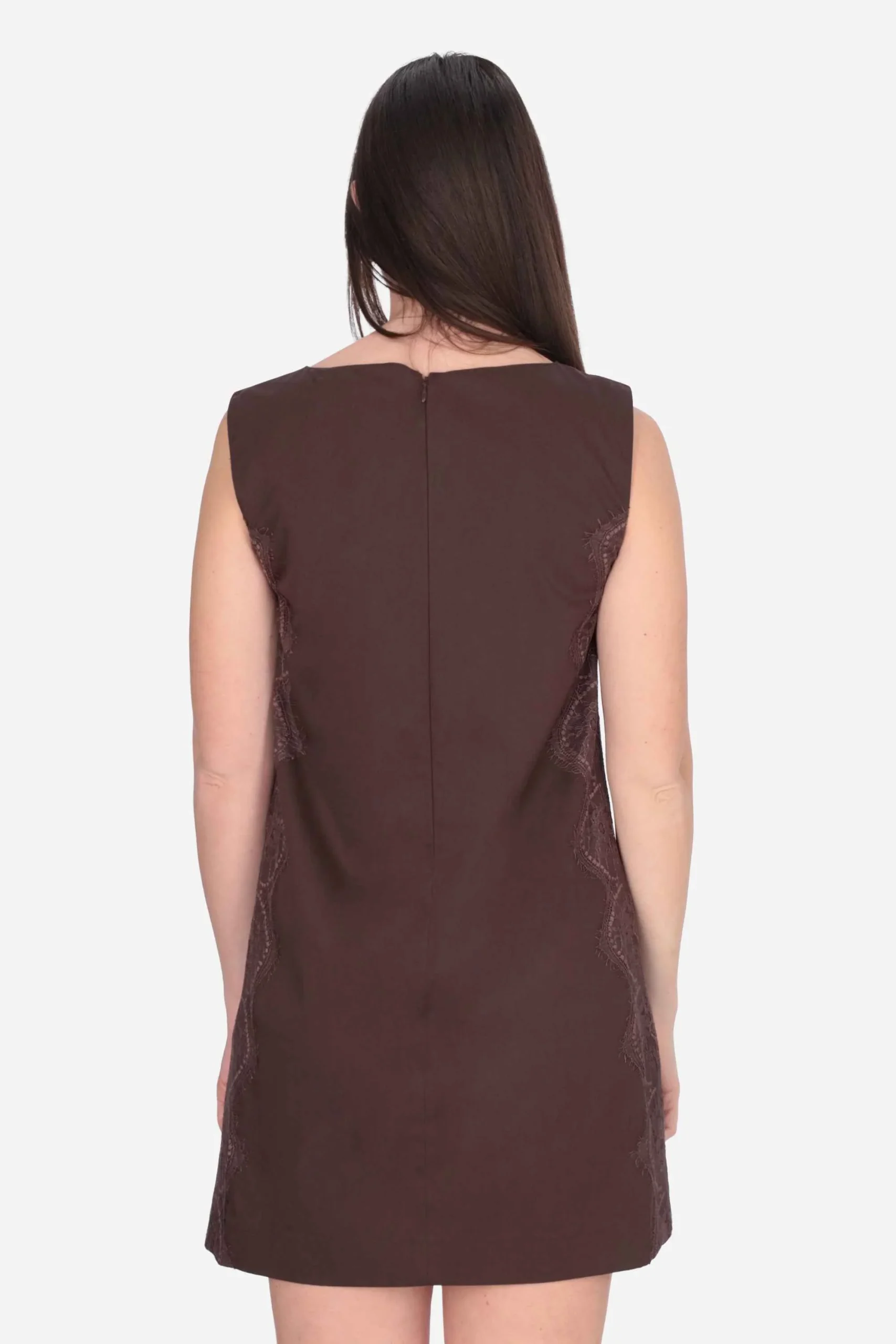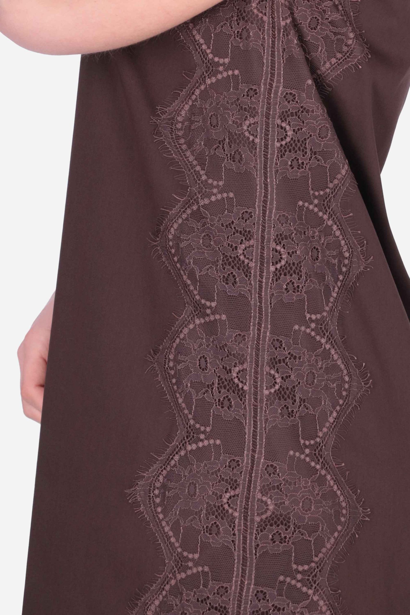 Presenta dettaglio in pizzo smerlato in tono coloro sui fianchi, chiusura sul retro, scollatura a barca e sorretto da spalline.