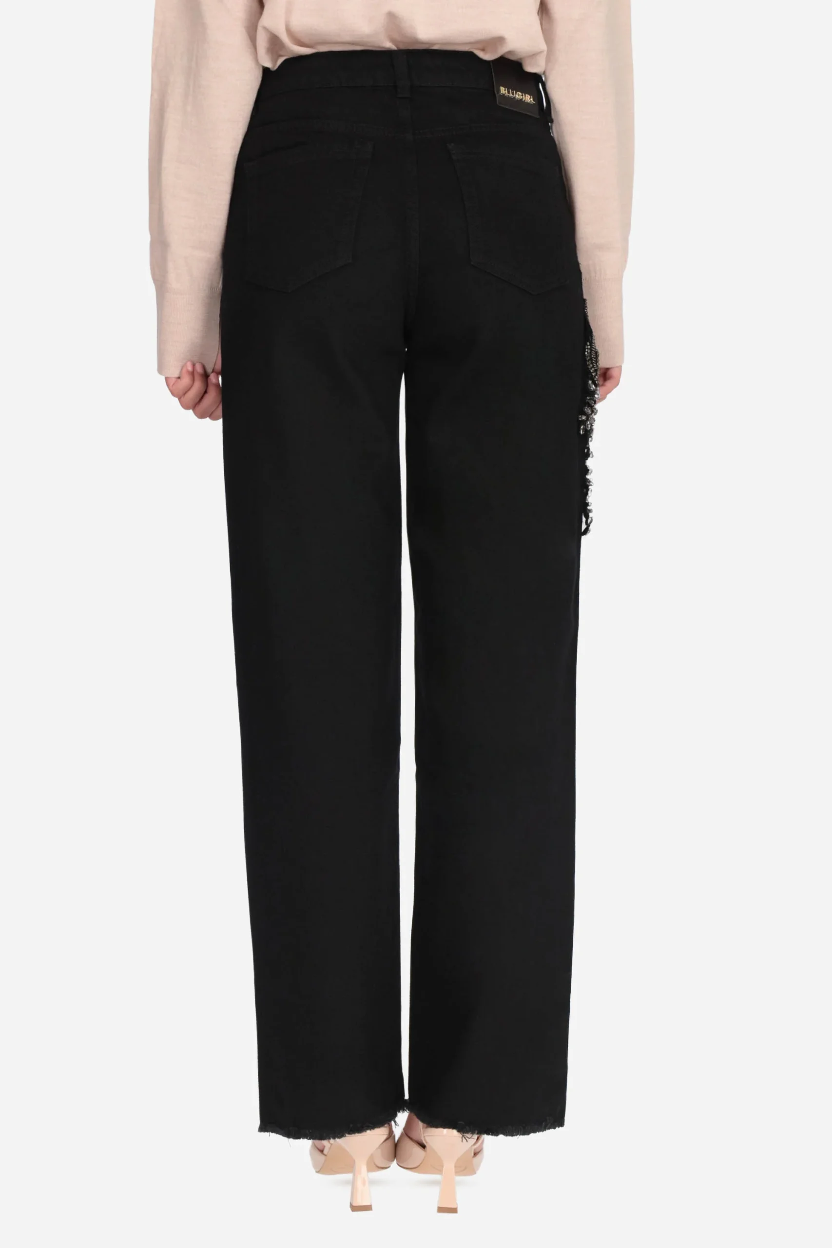 Il jeans è realizzato in denim con patch ricamato con applicazione di strass.