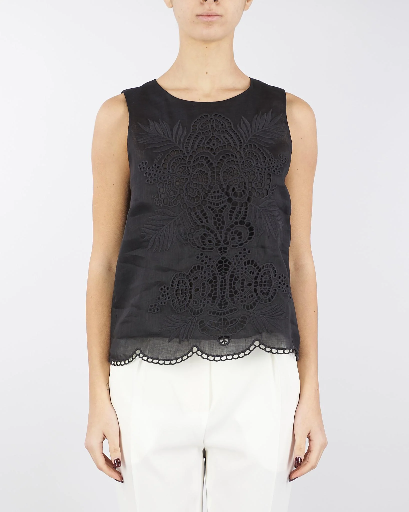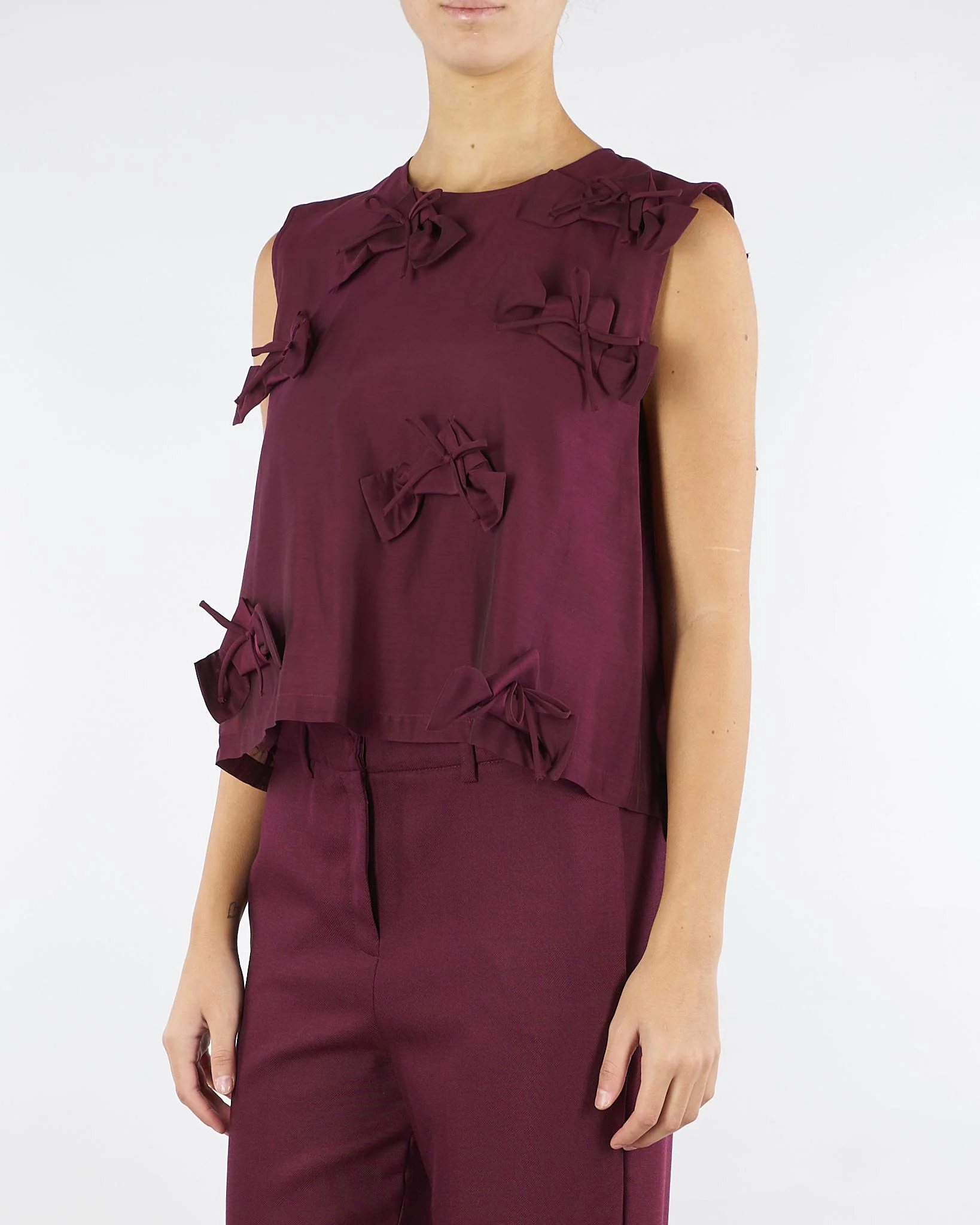 La nuova stagione porta con sé un fiorire di eleganti bluse dal taglio essenziale, con fiocchi applicati in un gioco di volumi tridimensionali. Da sperimentare su pantaloni fluidi e slingback per un outfit da vera protagonista. Blusa in voile di cotone e seta organzata. Fit dritto. Scollo stondato con goccia posteriore. Modello smanicato. Fiocchi applicati all over.