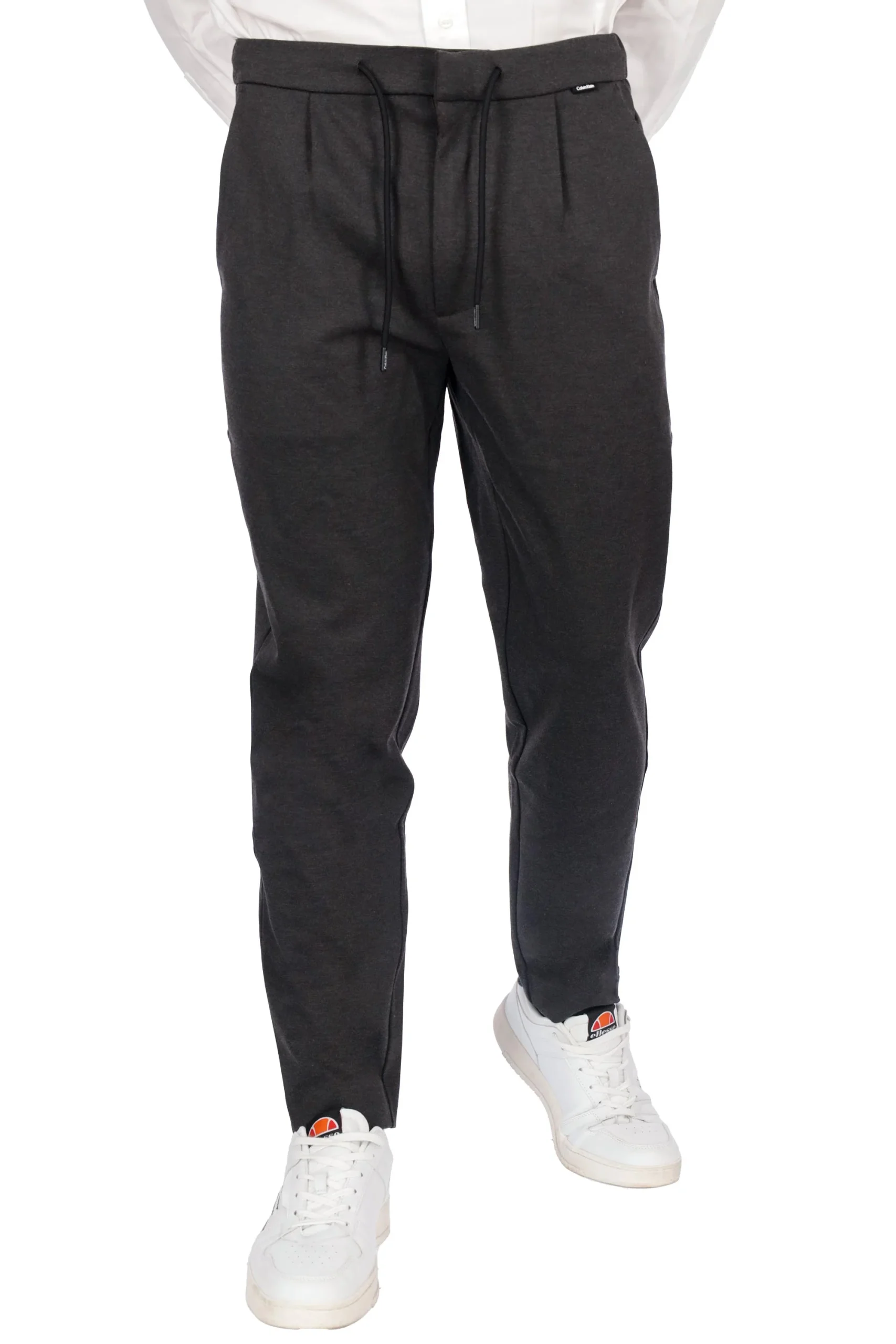 Presenta chiusura con zip e bottone, coulisse ed elastico in vita, pinces sul davanti, tasche a filetto sul davanti e patte sul retro.