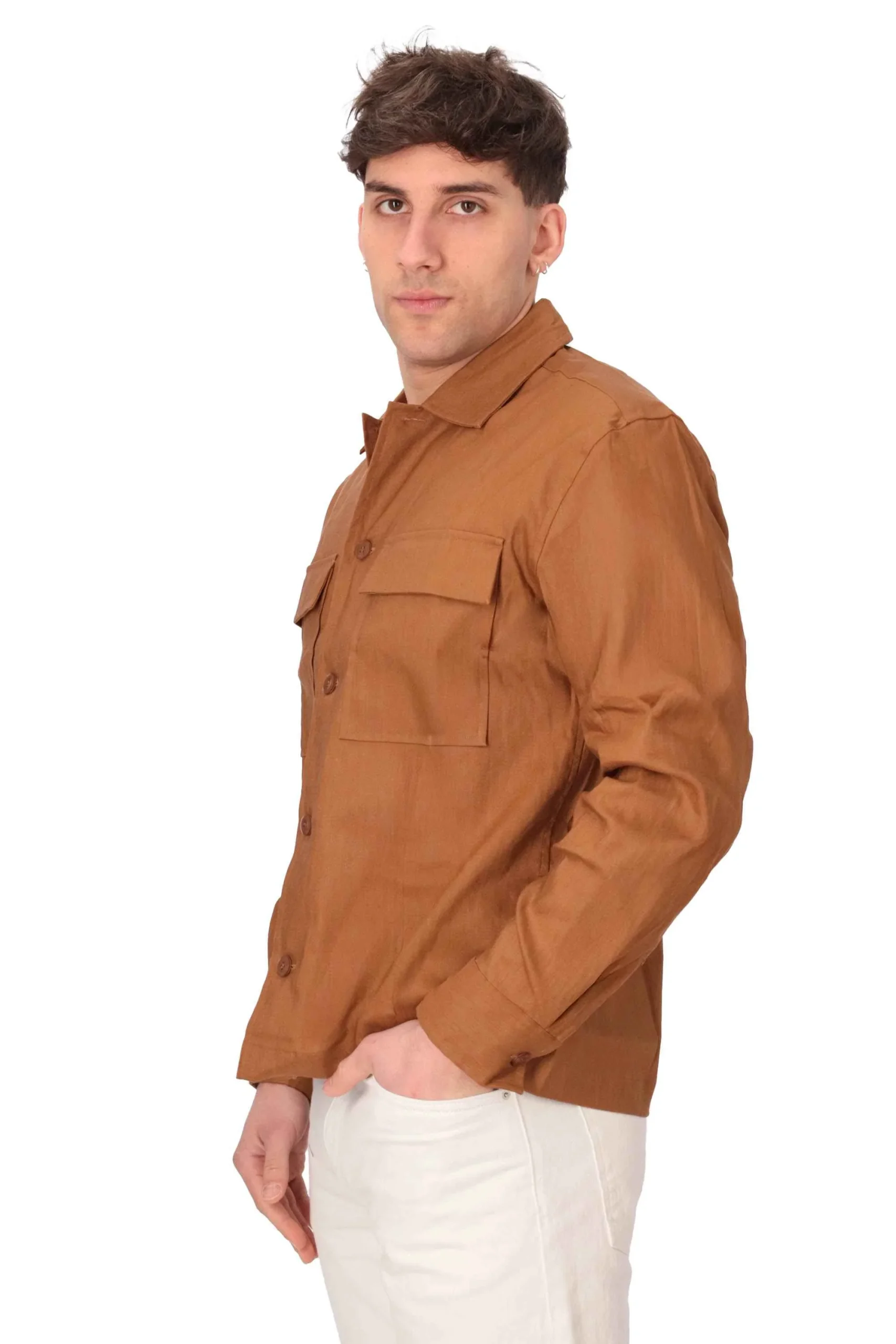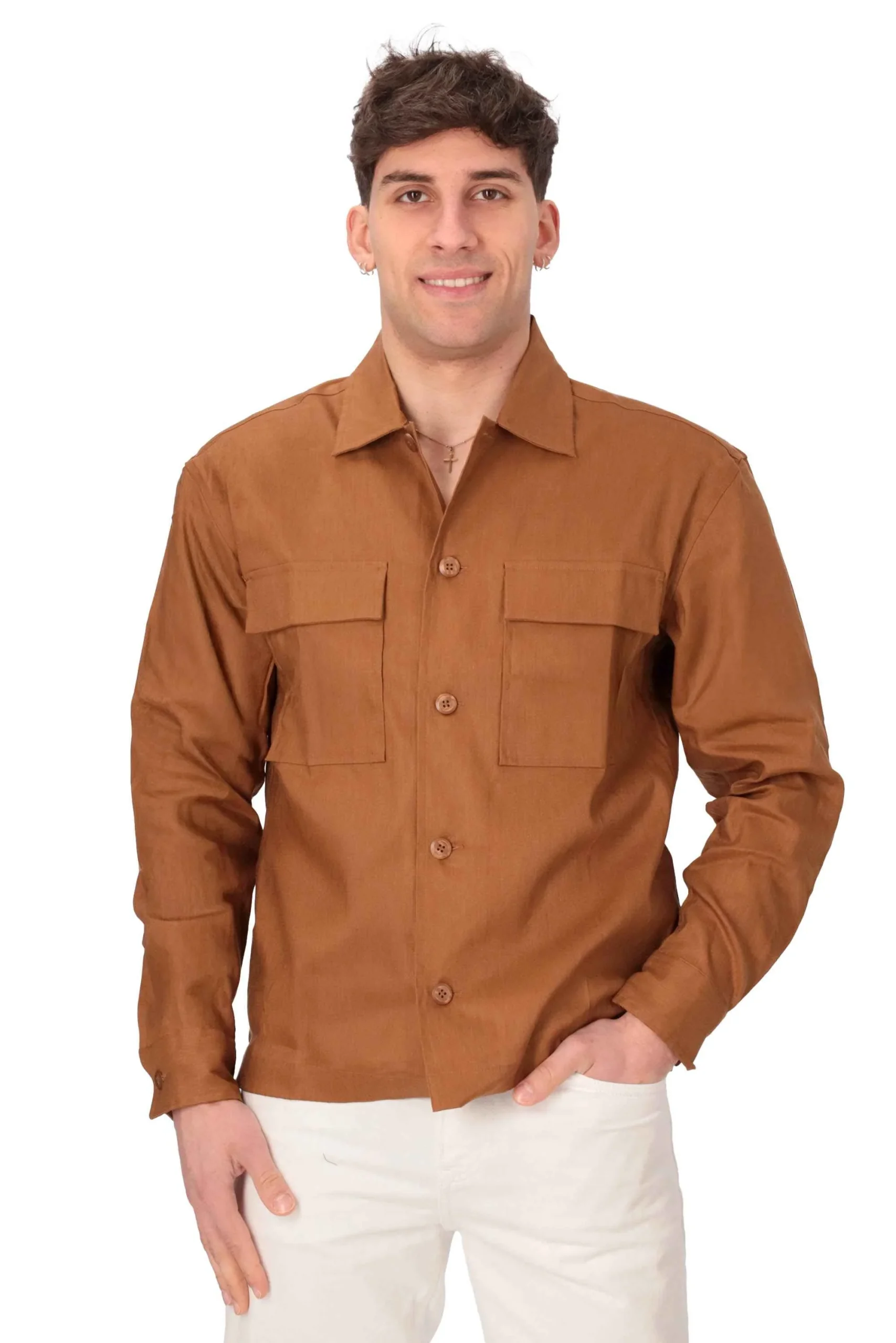 Presenta chiusura con bottoni, colletto classico e tasconi sul petto con patta .