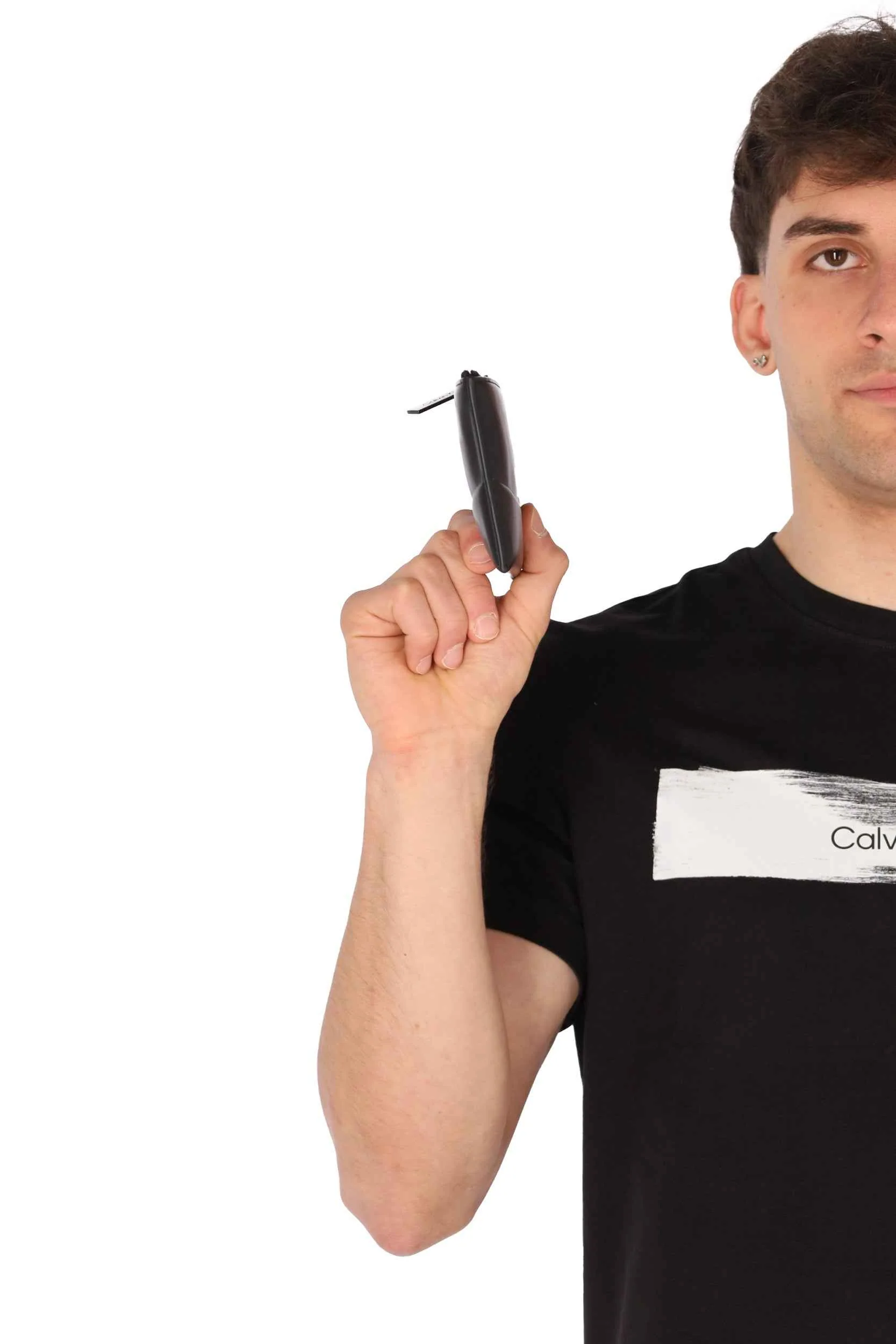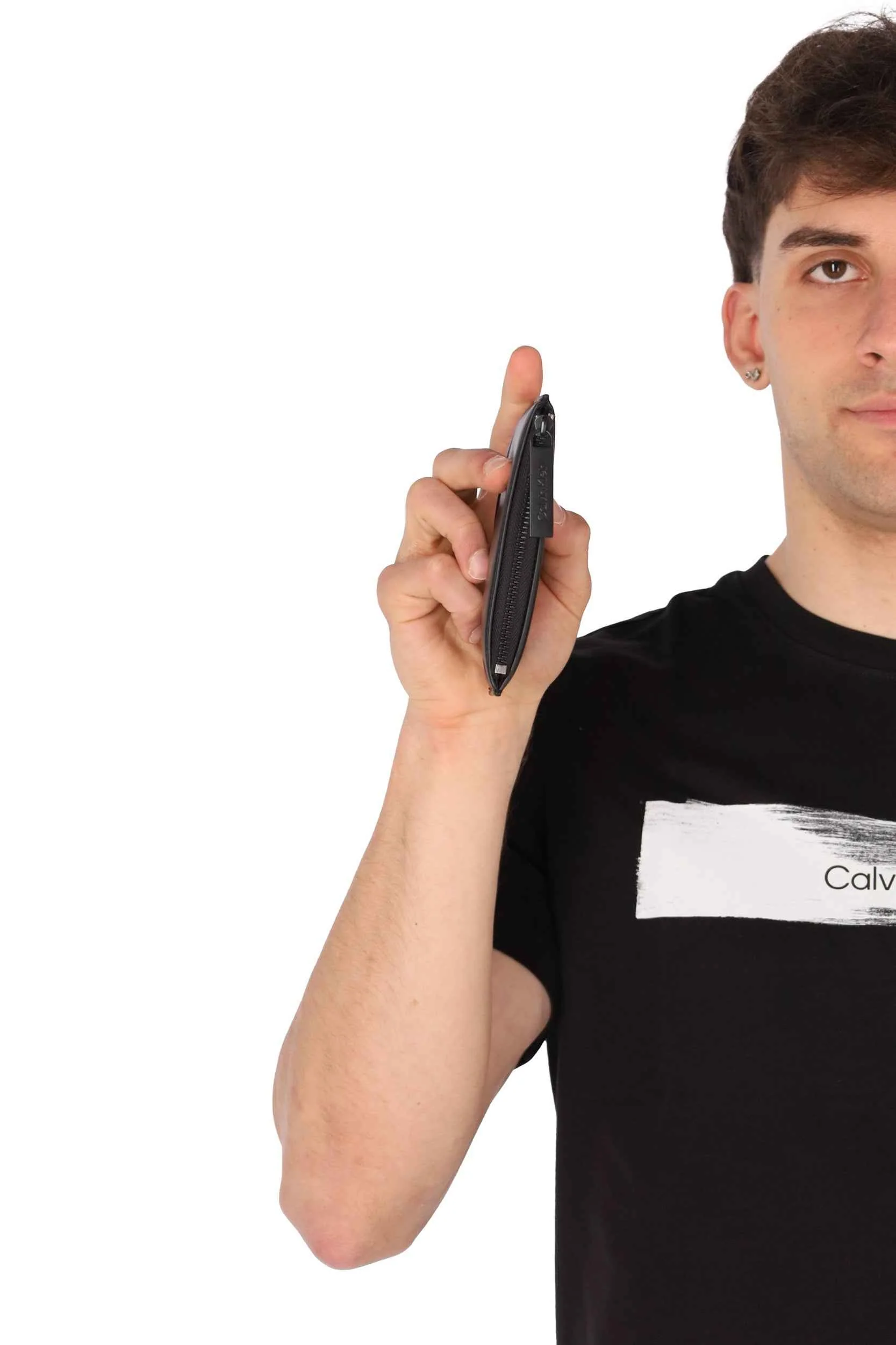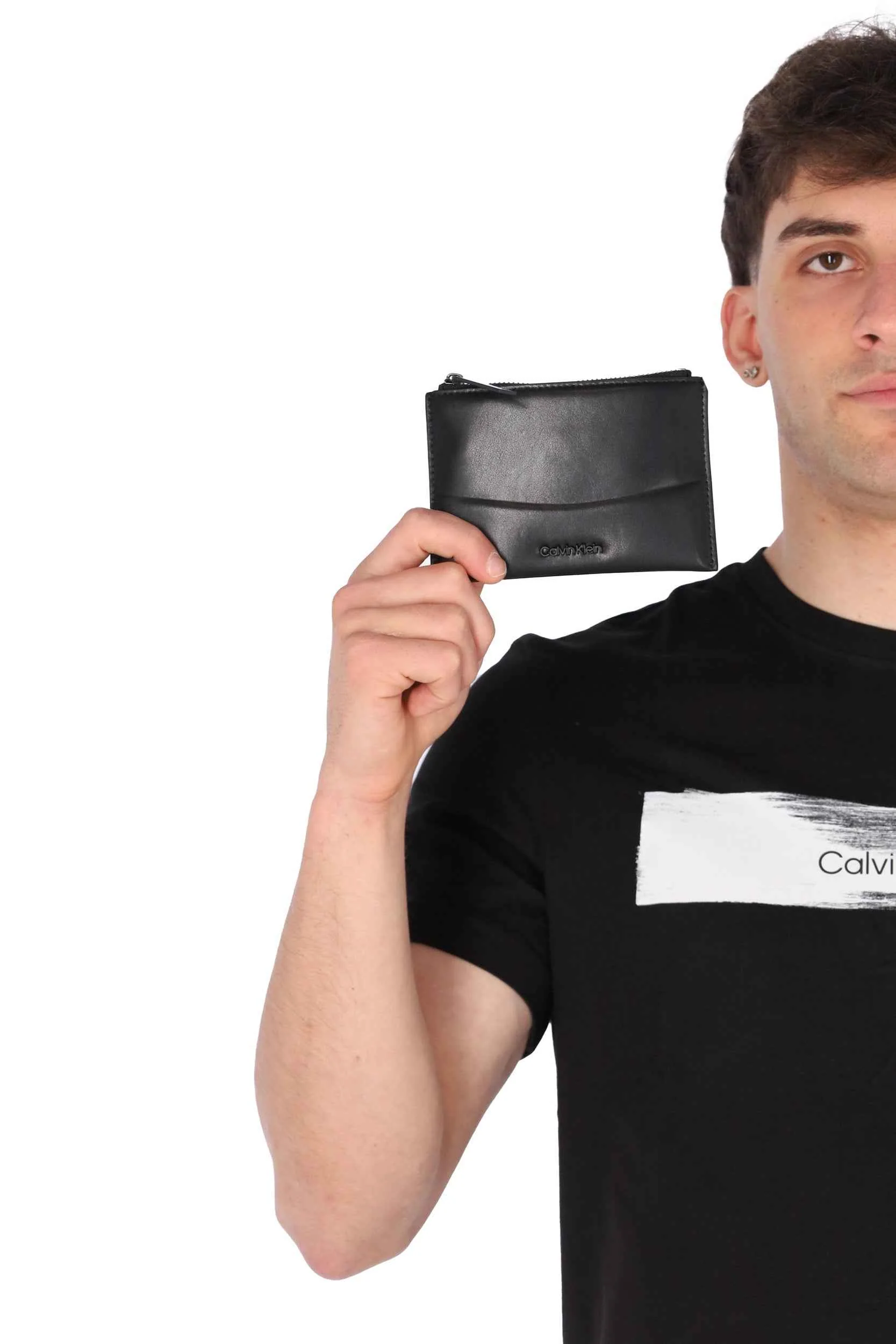 Il portamonete è realizzato in pelle e poliuretano, con zip sulla parte superiore.