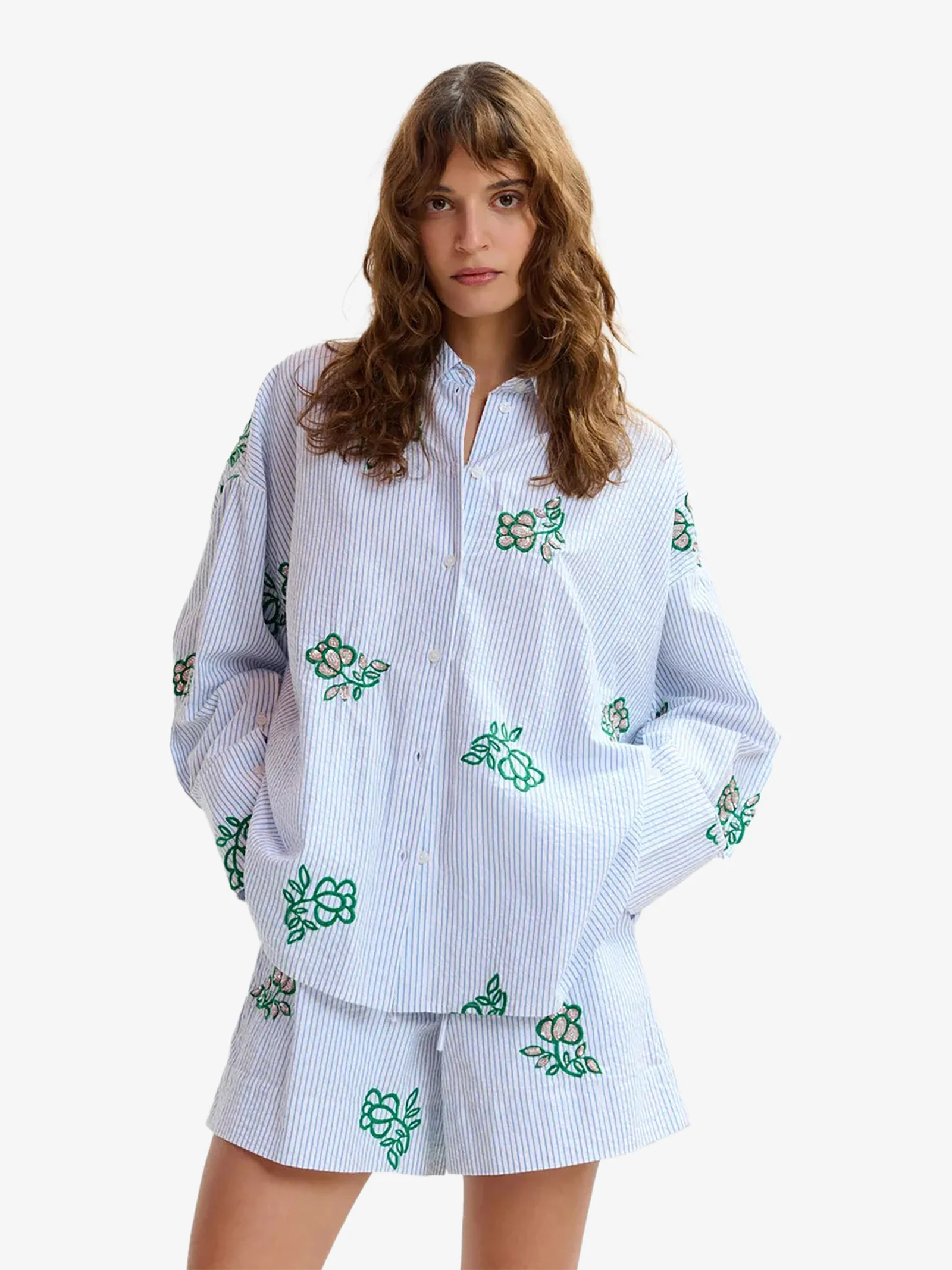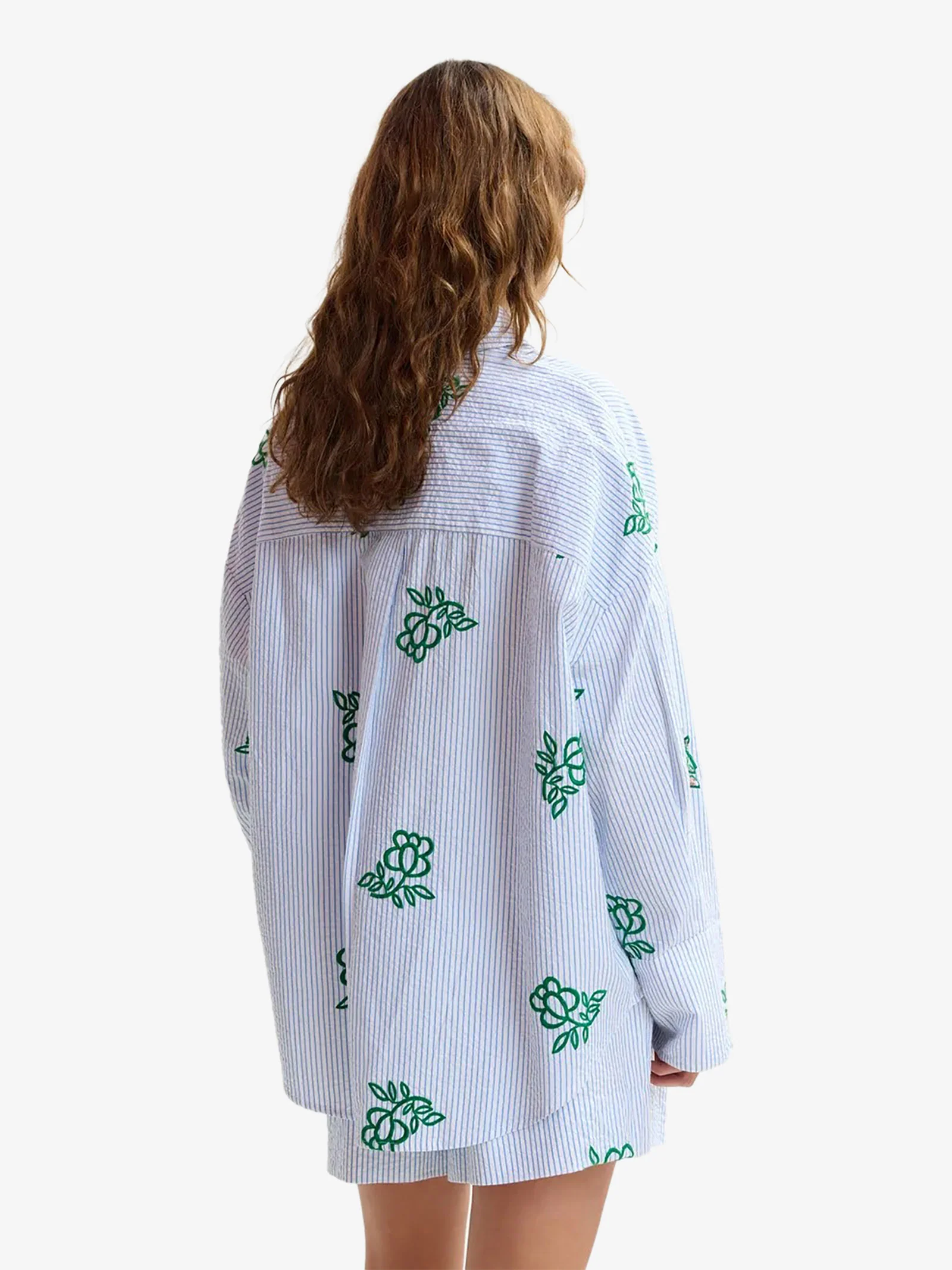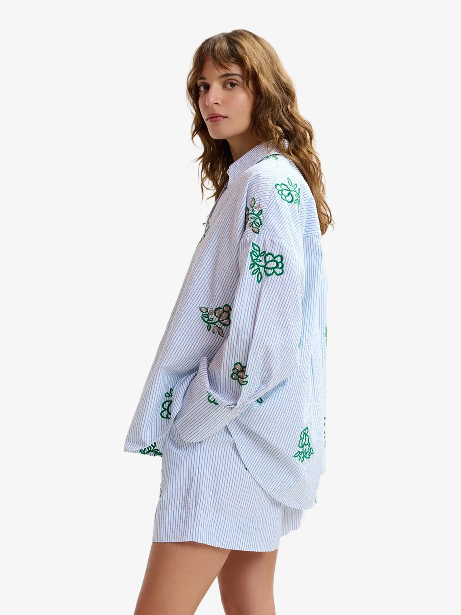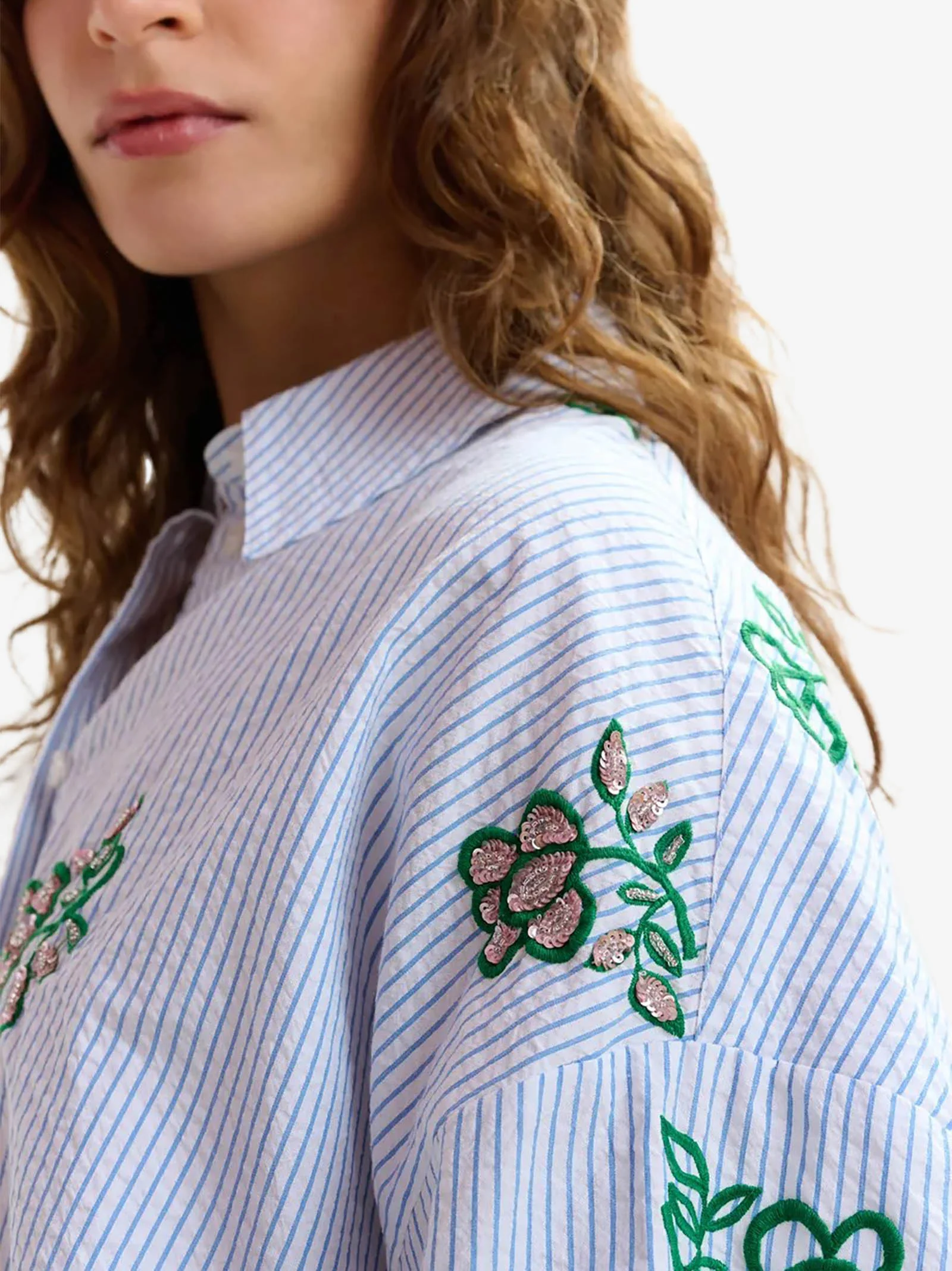 Dettagli: Realizzata in 100% cotone fresco e strutturato, questa camicia a righe sottili è concepita per una vestibilità oversize, con silhouette squadrata e spalle scese. L’orlo arrotondato, leggermente più lungo sul retro, aggiunge fluidità, mentre i delicati ricami floreali con paillettes e perline conferiscono un sorprendente tocco di glamour. Abbottonala per un taglio sartoriale deciso o lasciala slacciata per esibire un’eleganza semplice e disinvolta.