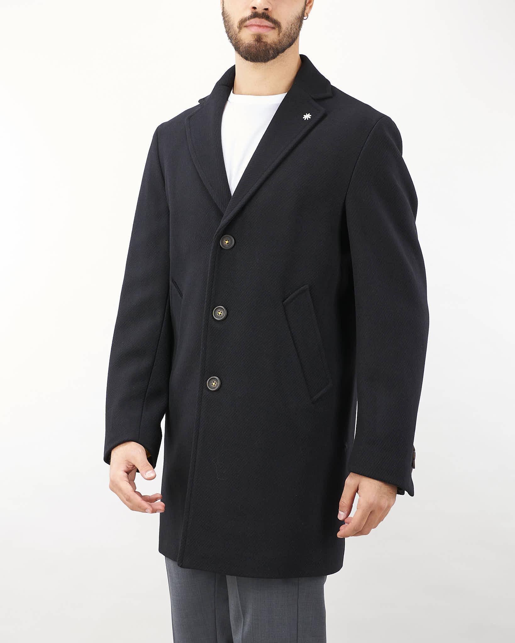 Cappotto in misto lana di Manuel Ritz. Modello monopetto con rever. Tasche a filo laterali, spacco sul retro. Chiusura centrale con 3 bottoni. Spilla iconica sul rever.