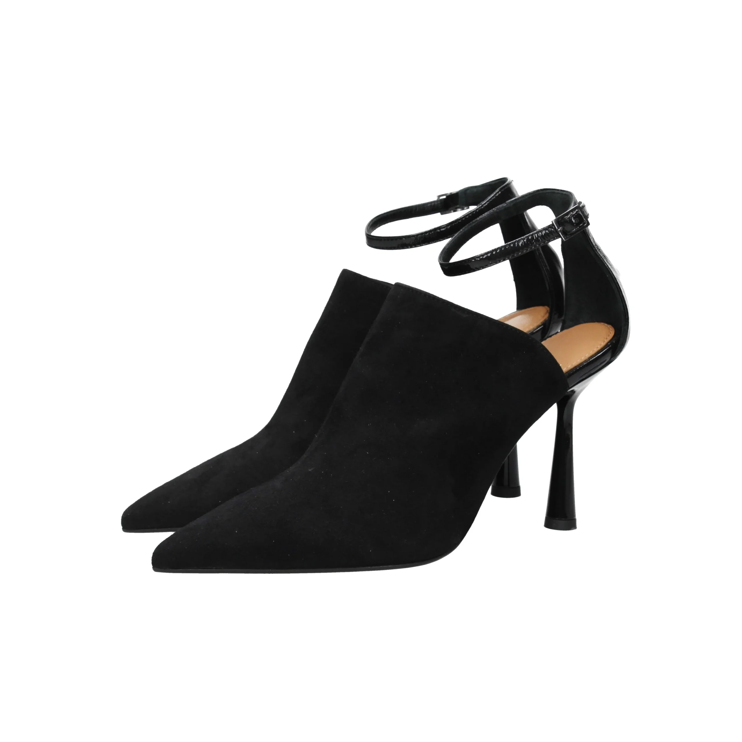 Tronchetto in camoscio, tacco alto 9cm, suola in gomma, con cinturini regolabili, interno foderato.