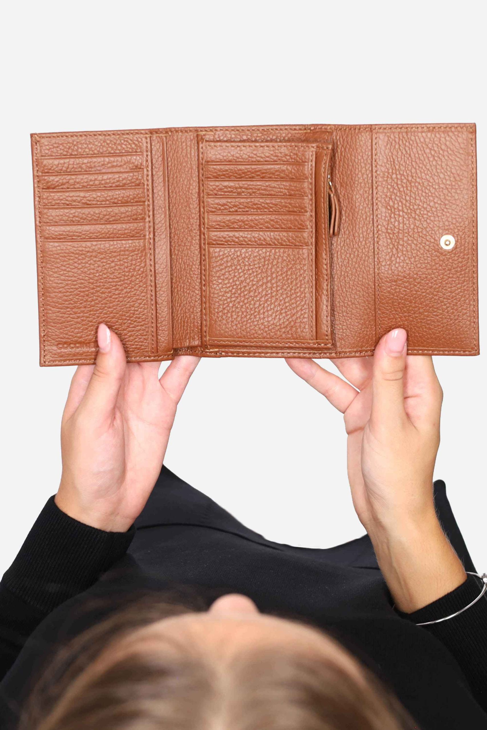 Presenta chiusura con bottone a pressione, tasca esterna per monete con zip e interno diviso in scomparti.