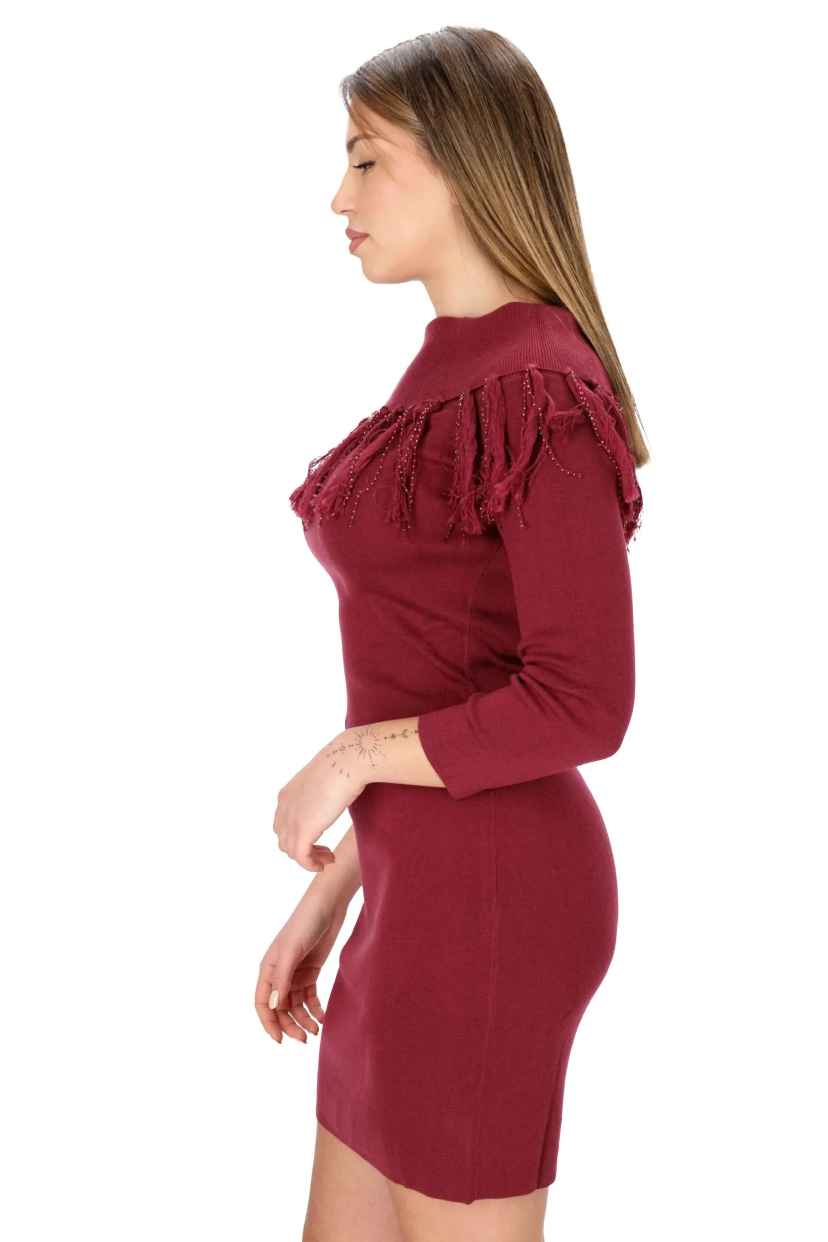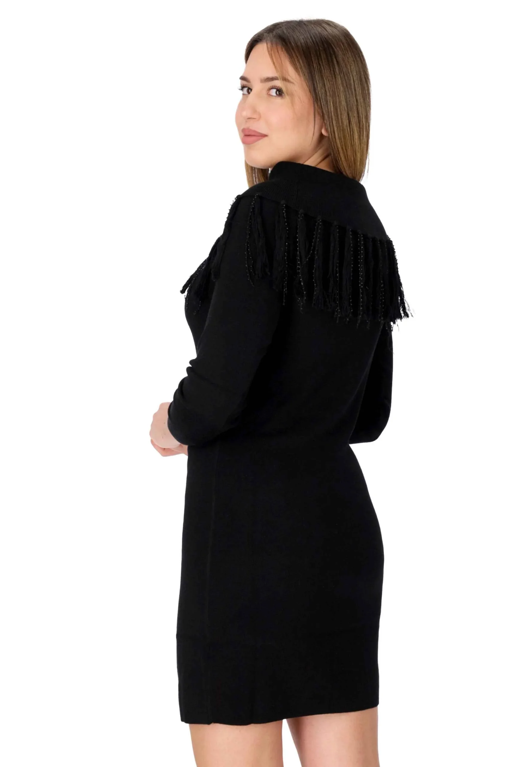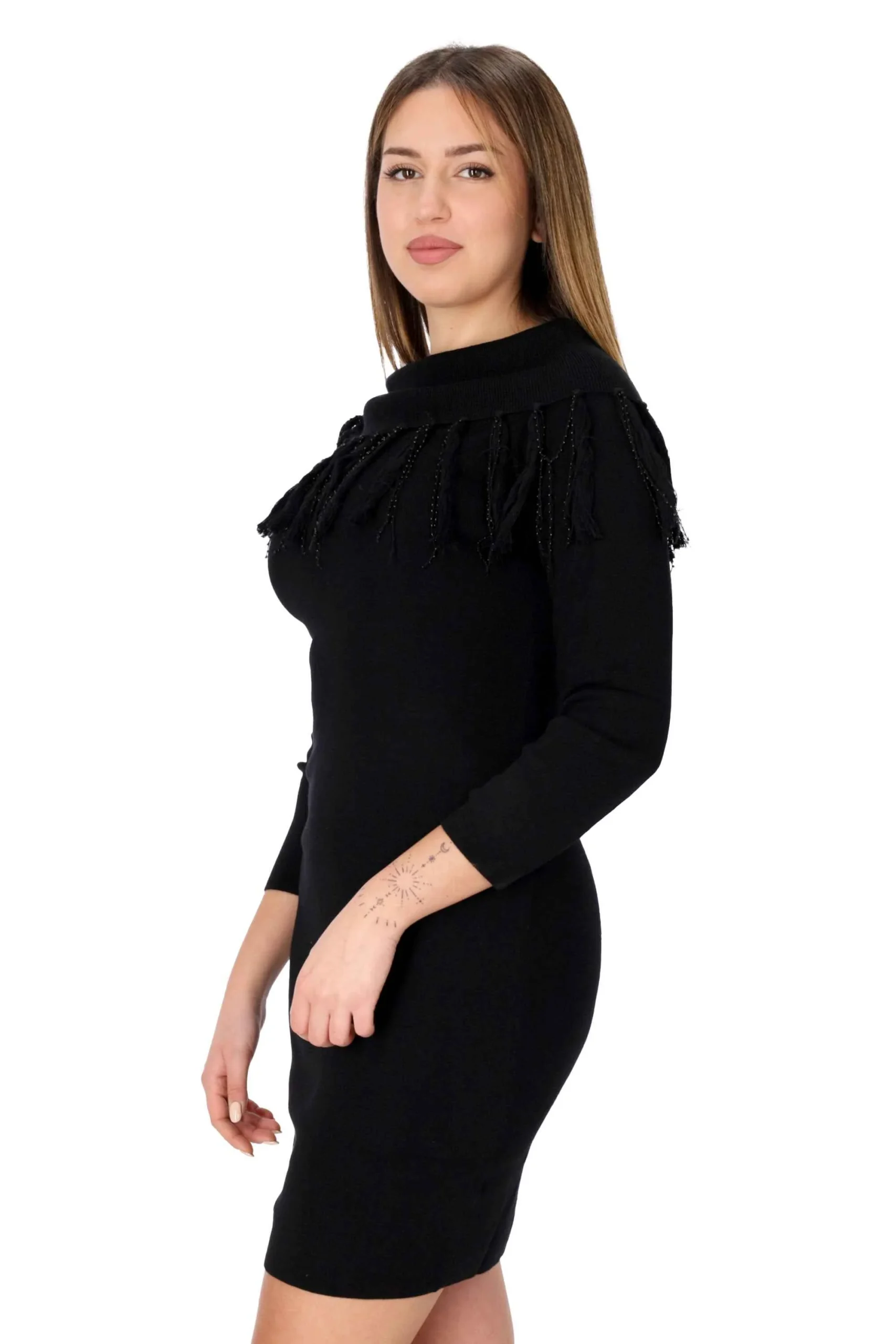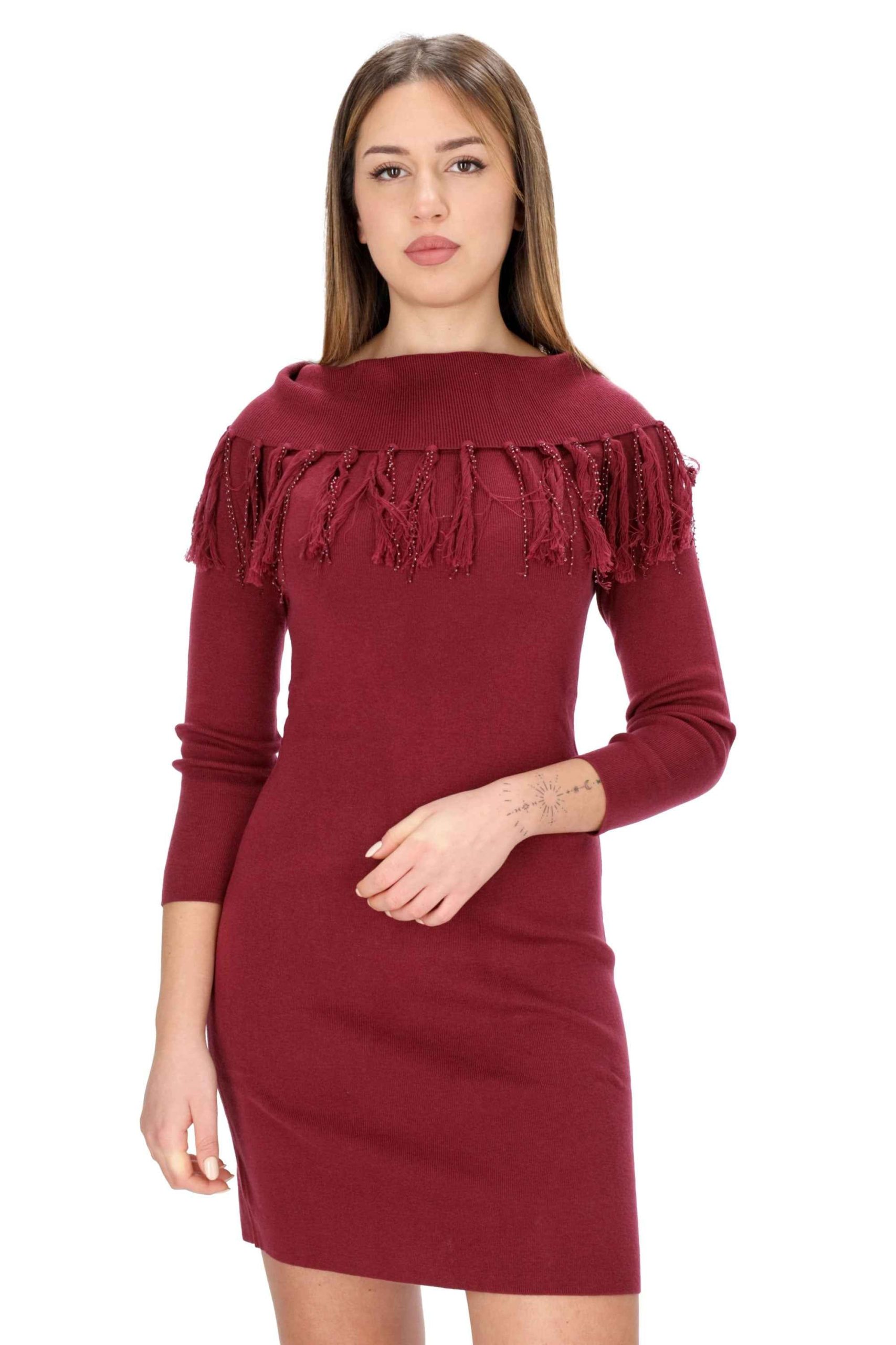 E’ un modello aderente, con collo a barca e orlo sfrangiato con applicazione di perline, maniche lunghe e bordi rifiniti a coste.