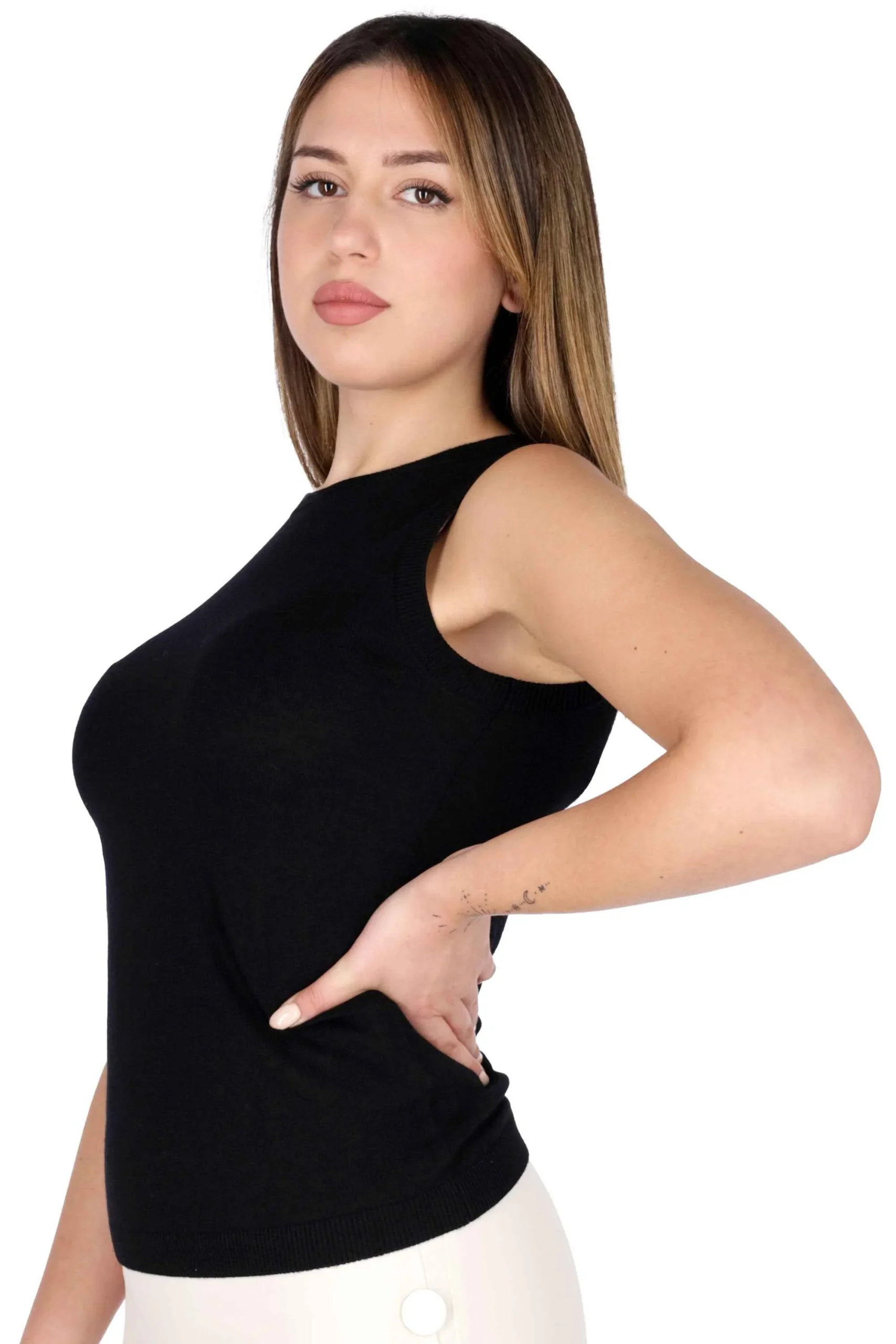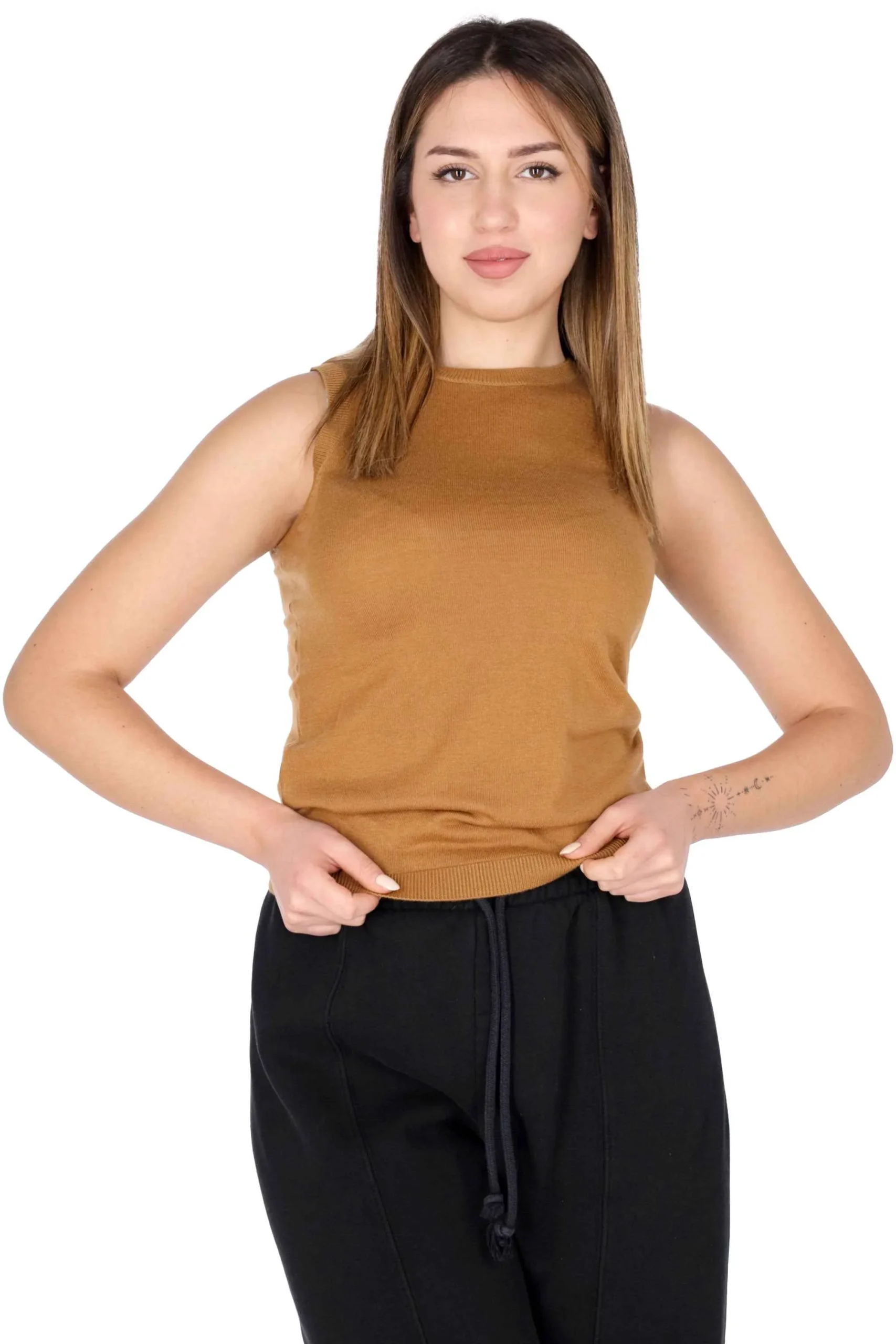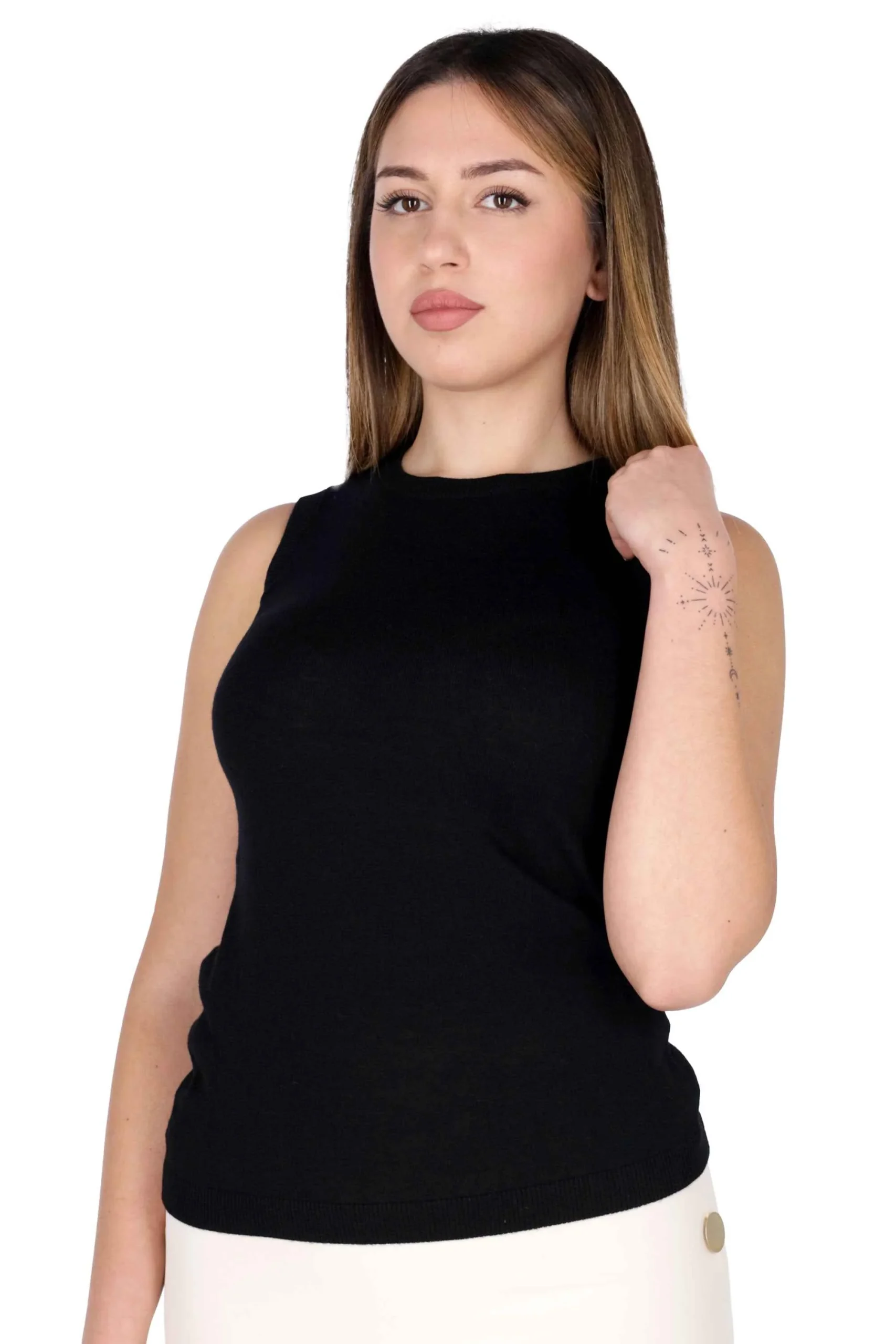 Presenta girocollo, smanicato e bordi rifiniti a costine.