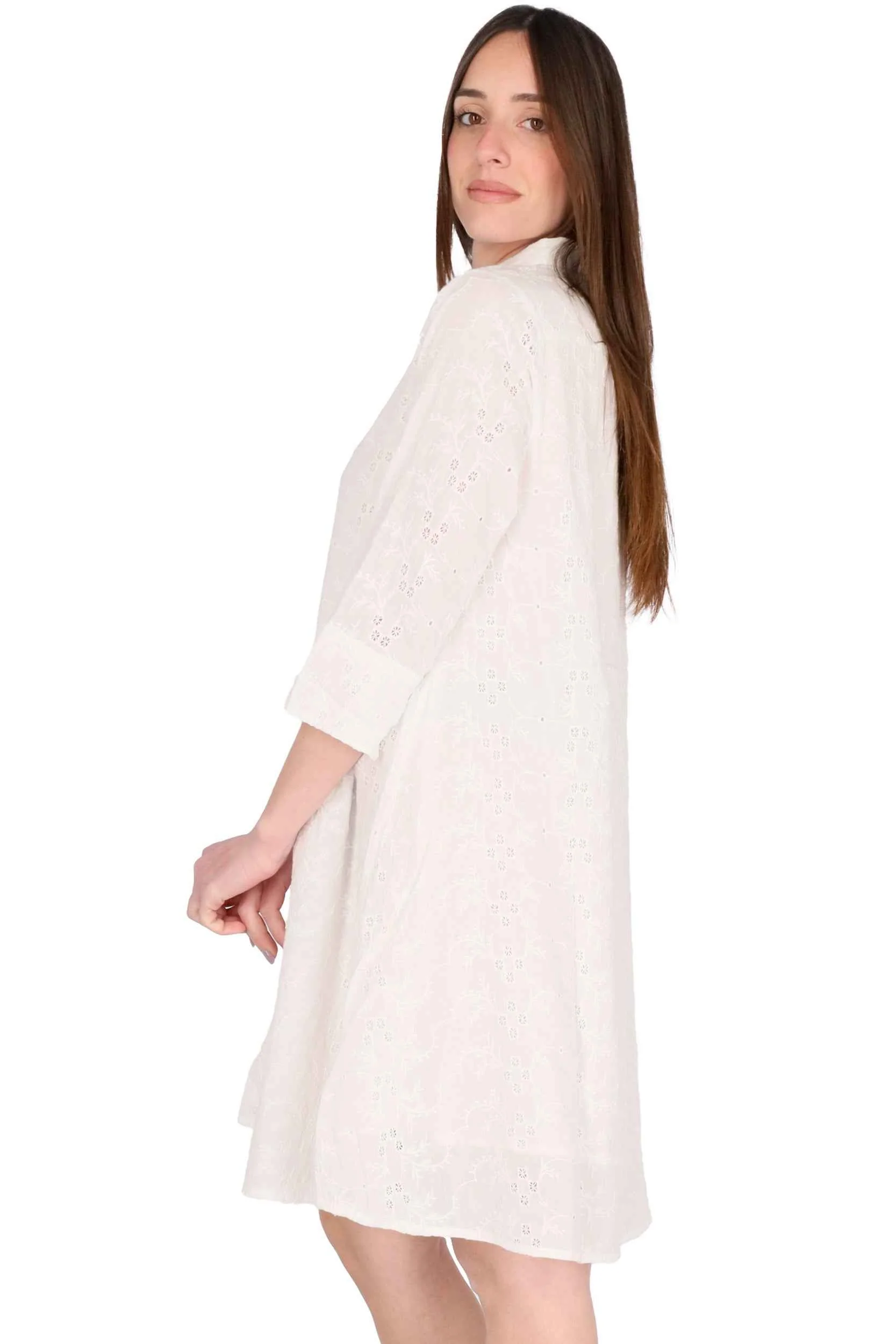 E’ un modello a camicia, con collo classico, maniche 3/4 e chiusura con bottoni sul davanti.