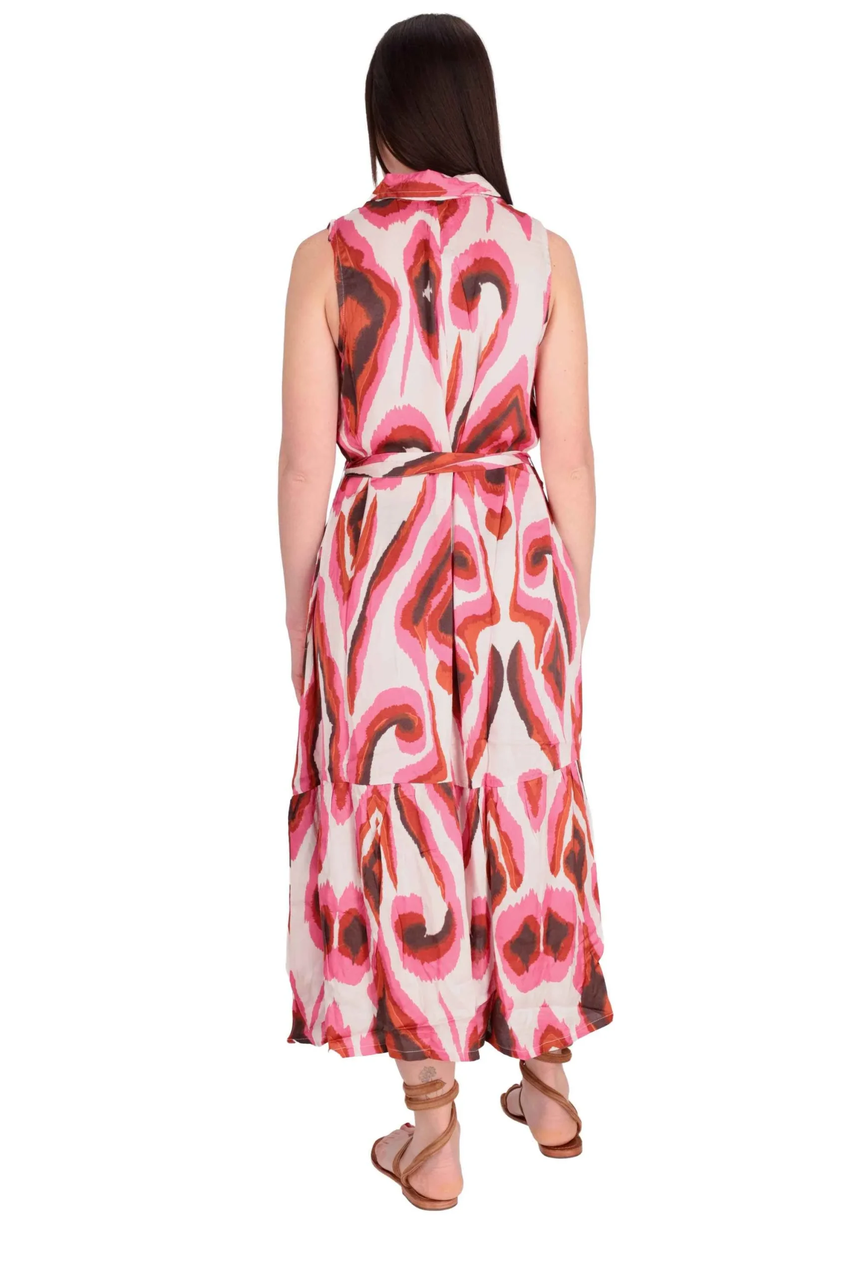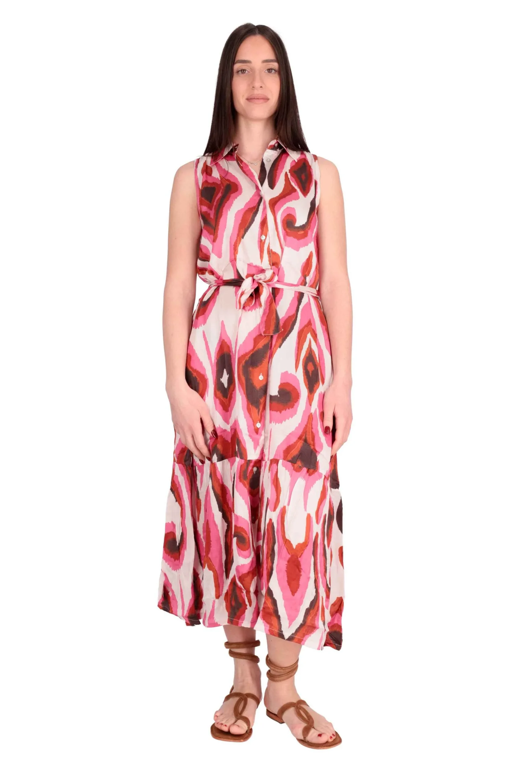 Presenta chiusura con bottoni, cintura in abbinamento per enfatizzare il punto vita e colletto classico.