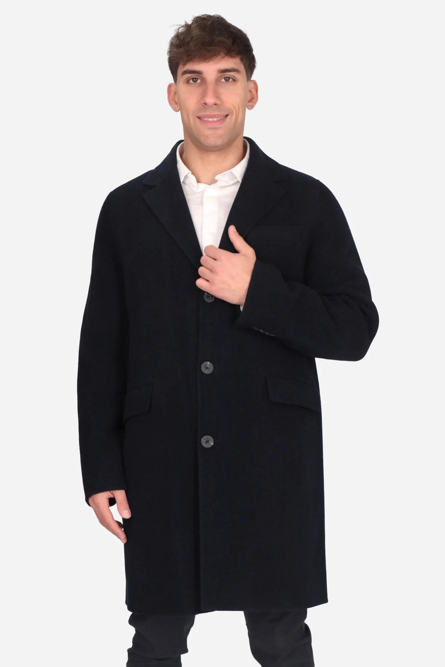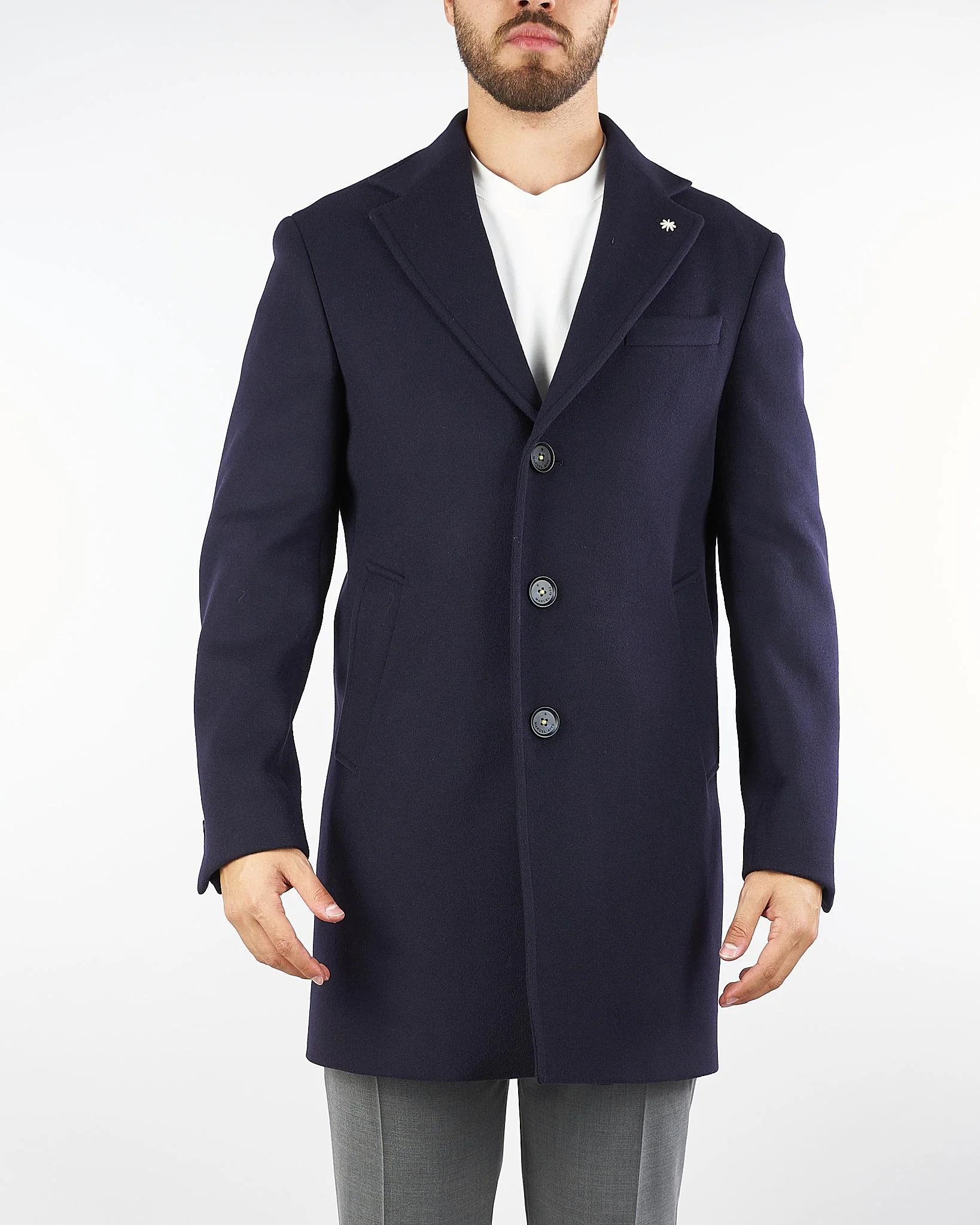 Presenta revers classico, chiusura con bottoni personalizzati, tasche con patte sui lati, taschino sul petto e bottoni sui polsini.