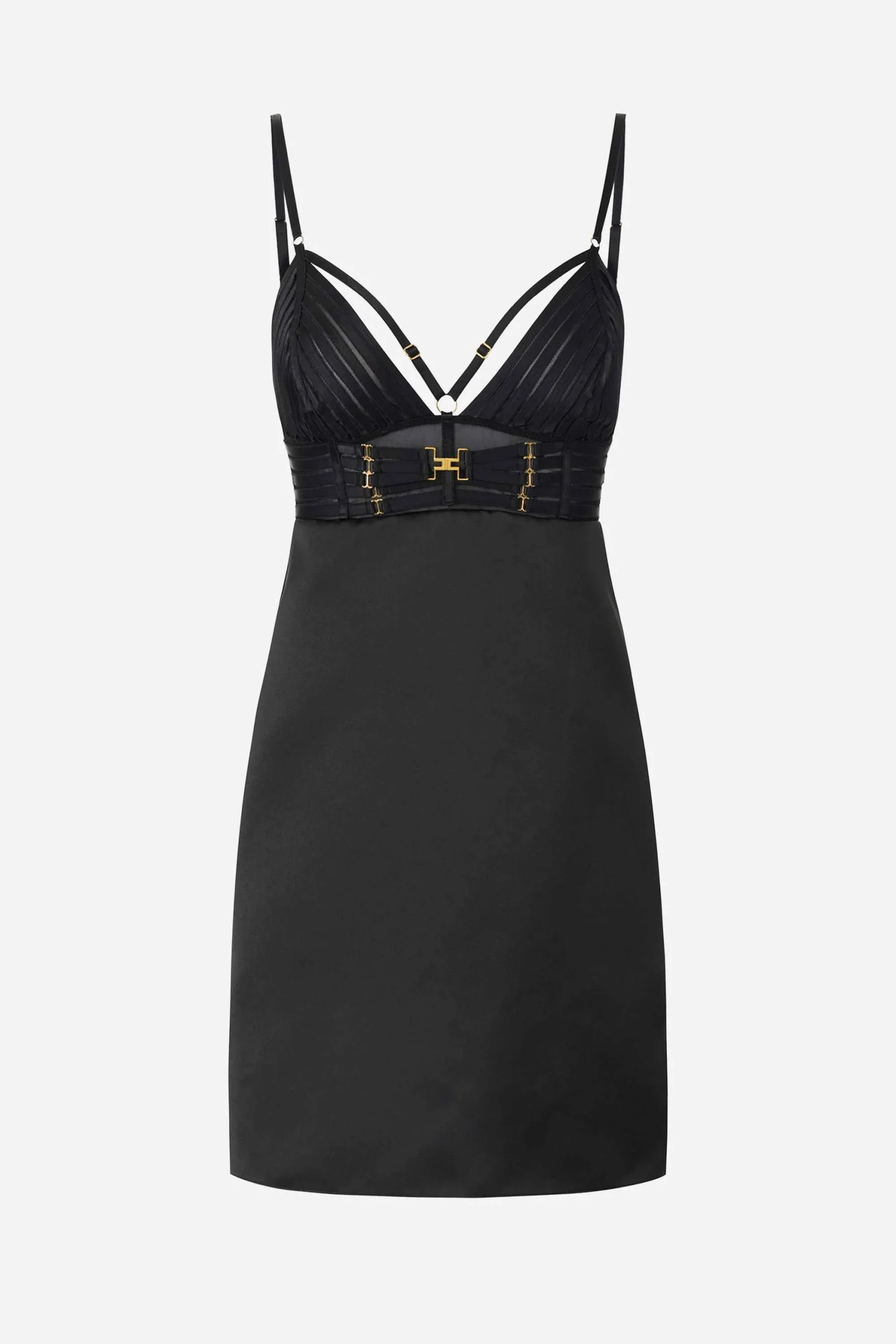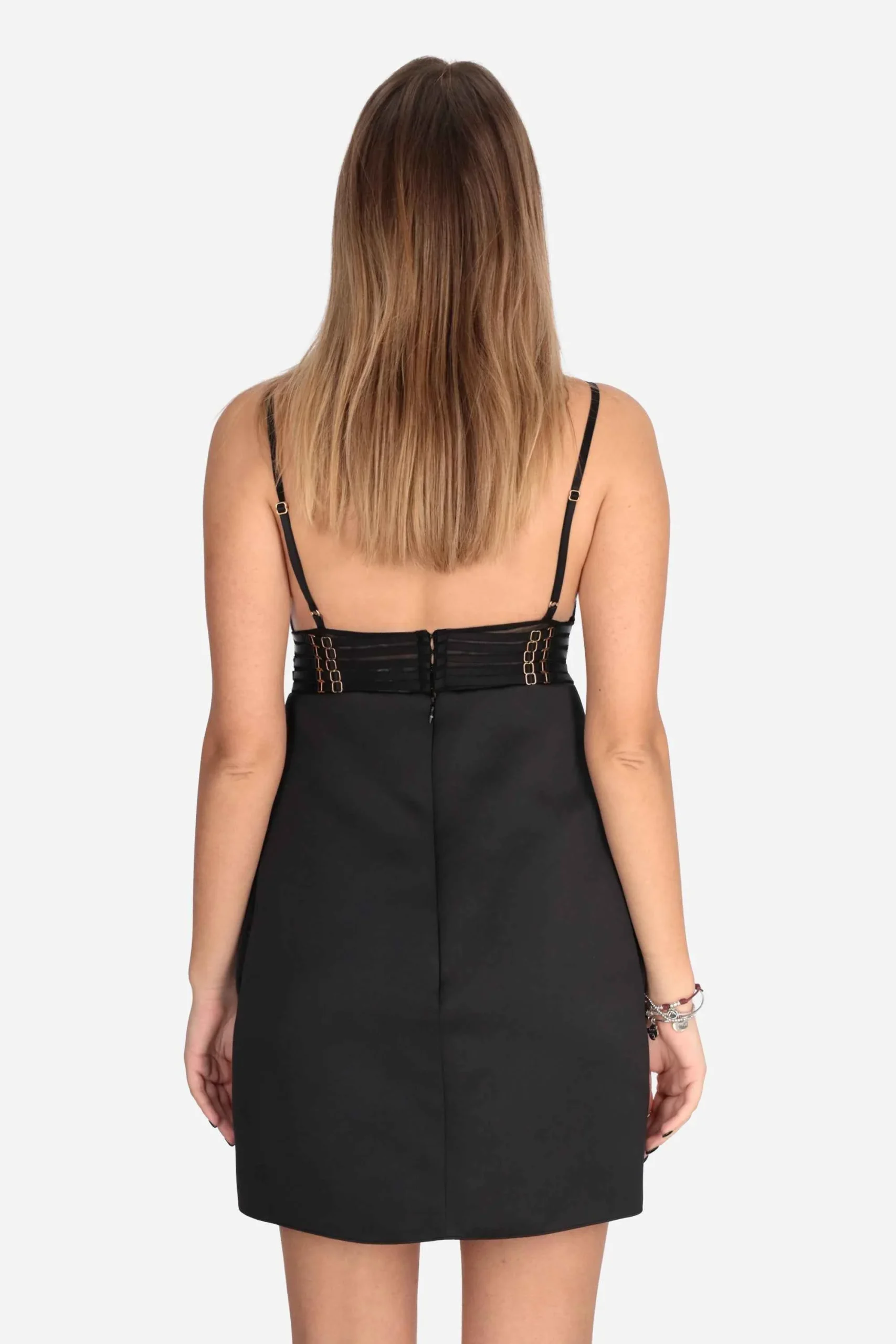 Presenta spalline sottili, busto arricchito da elastici di ispirazione lingerie, ricamati sulle coppe e sul busto, fodera in raso, zip invisibile sul retro..