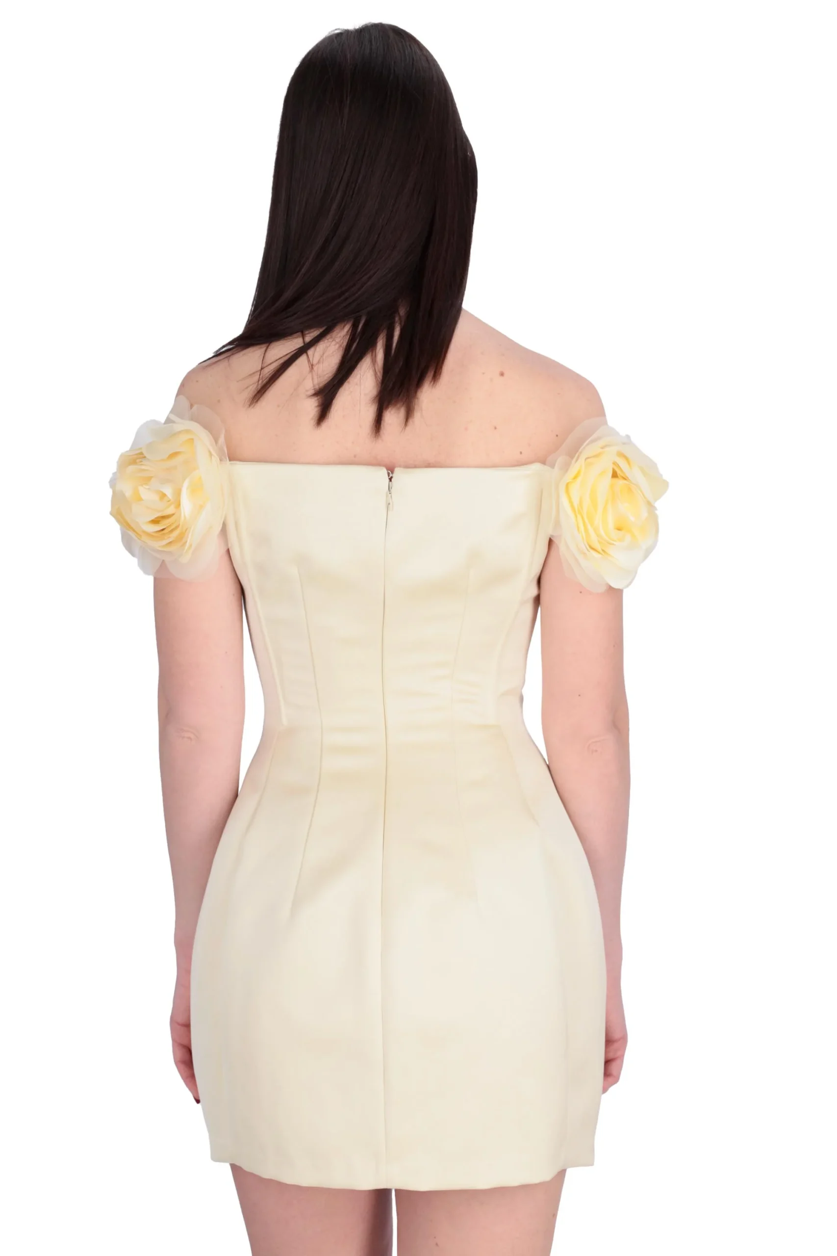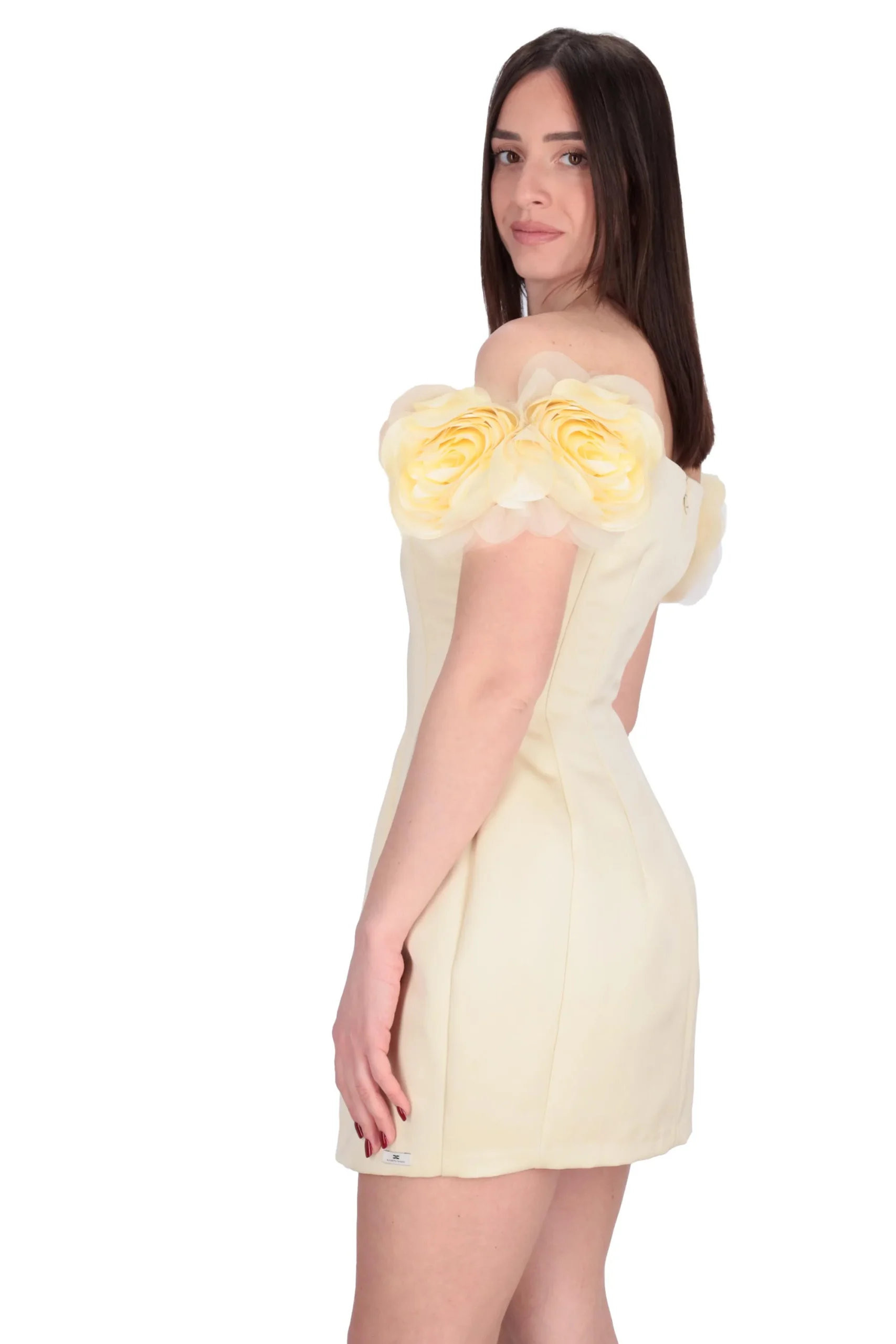 E’ un modello con spalle scoperte e costruzione interna con stecche, fiori applicati in tono a decorare le maniche, chiusura con zip invisibile sul retro.