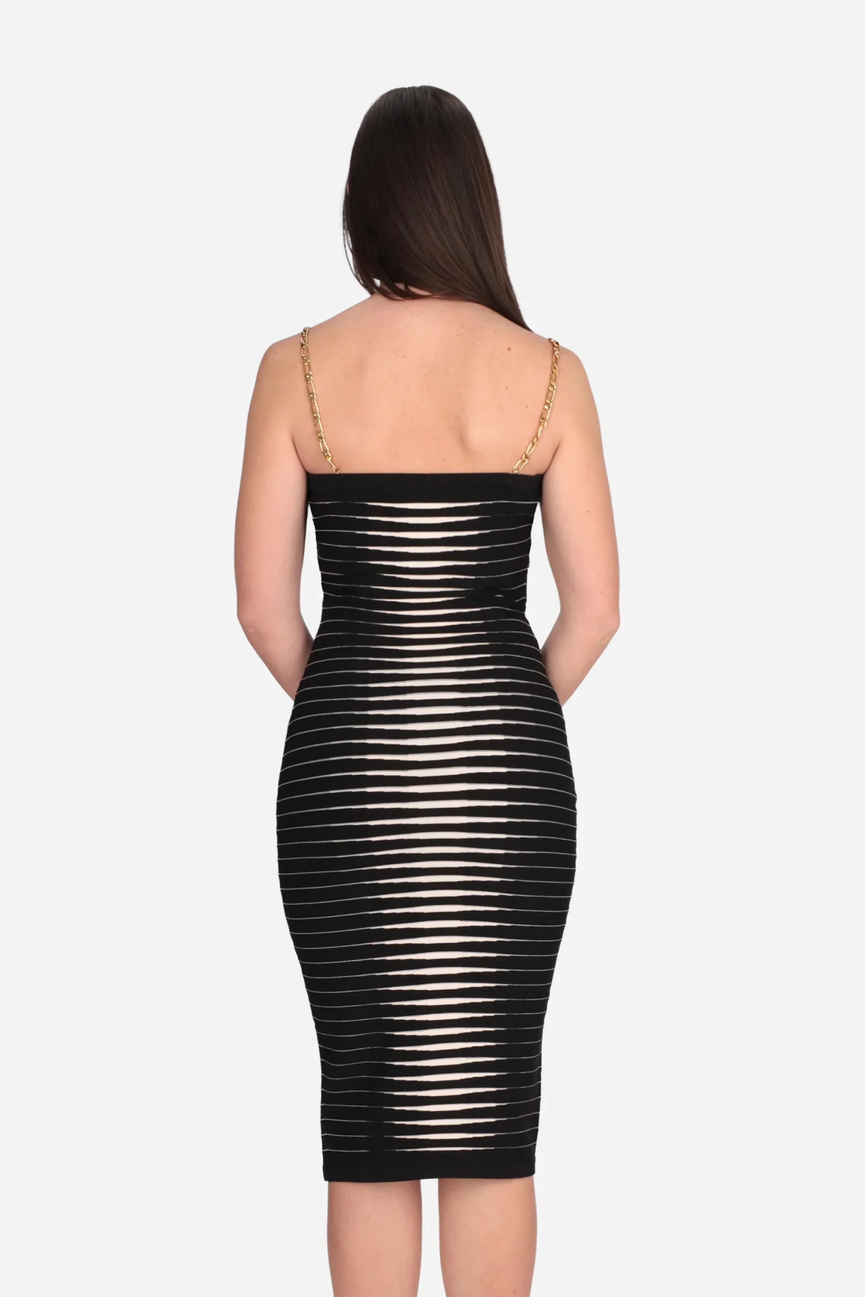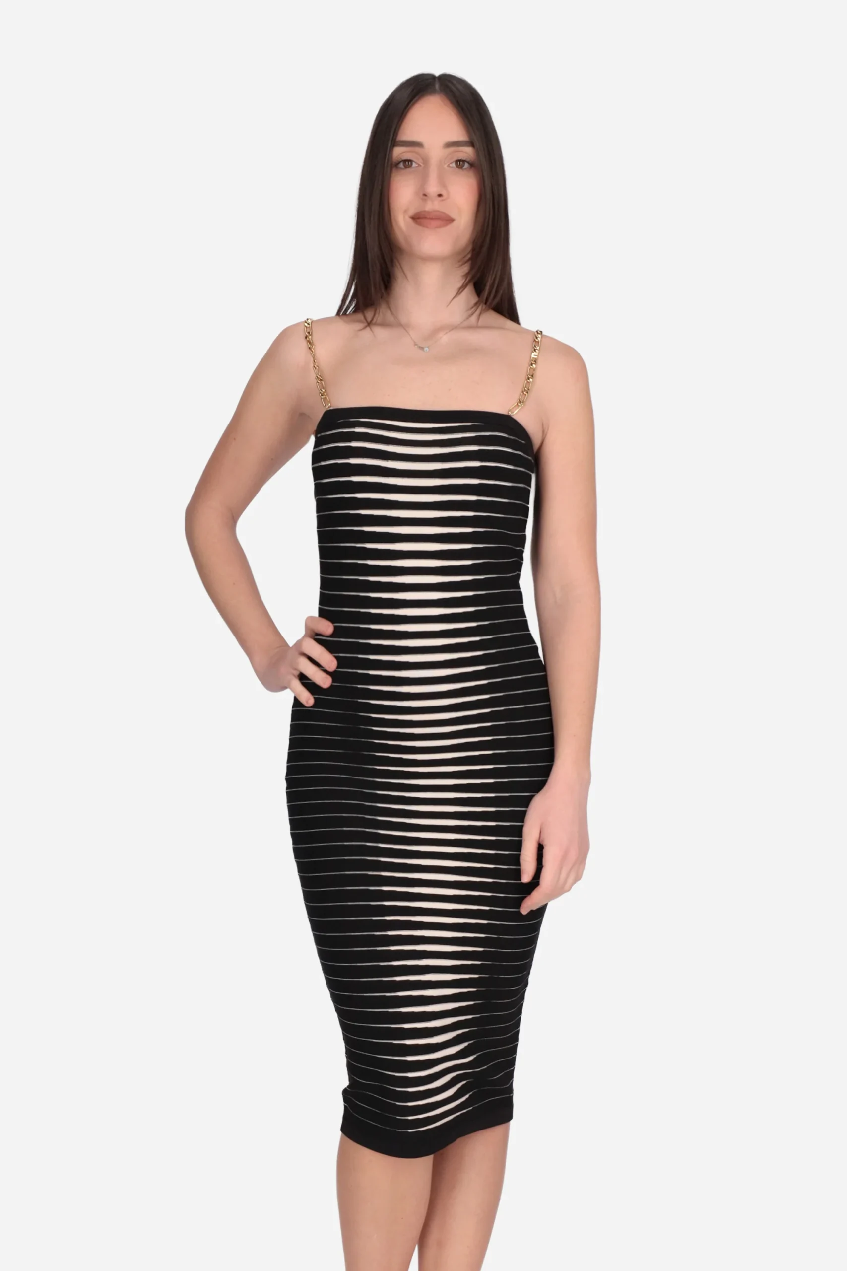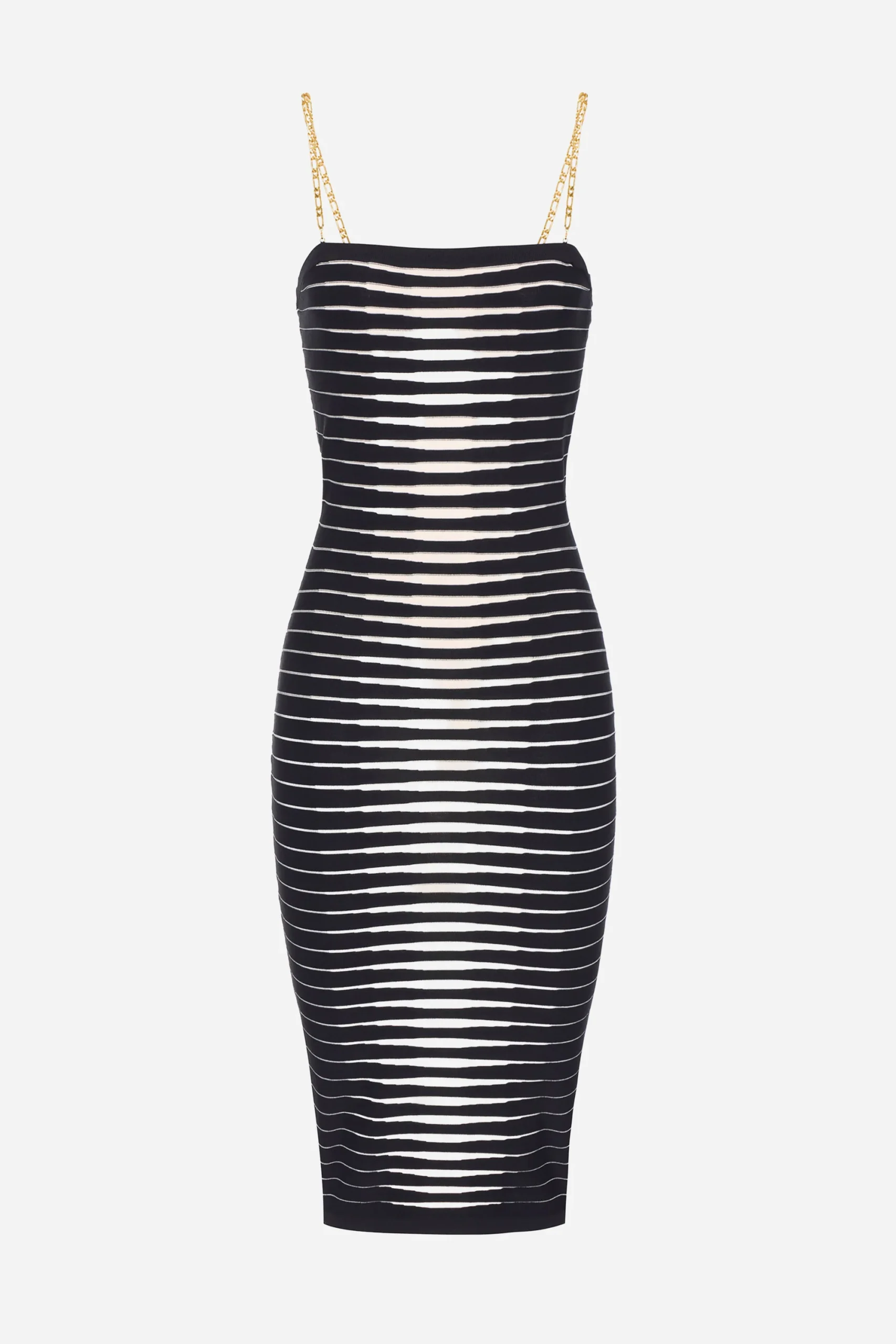 L’abito a tubino è realizzato in maglia con lavorazione jacquard che crea un pattern a righe dégradé, in colori a contrasto per un effetto zebra.