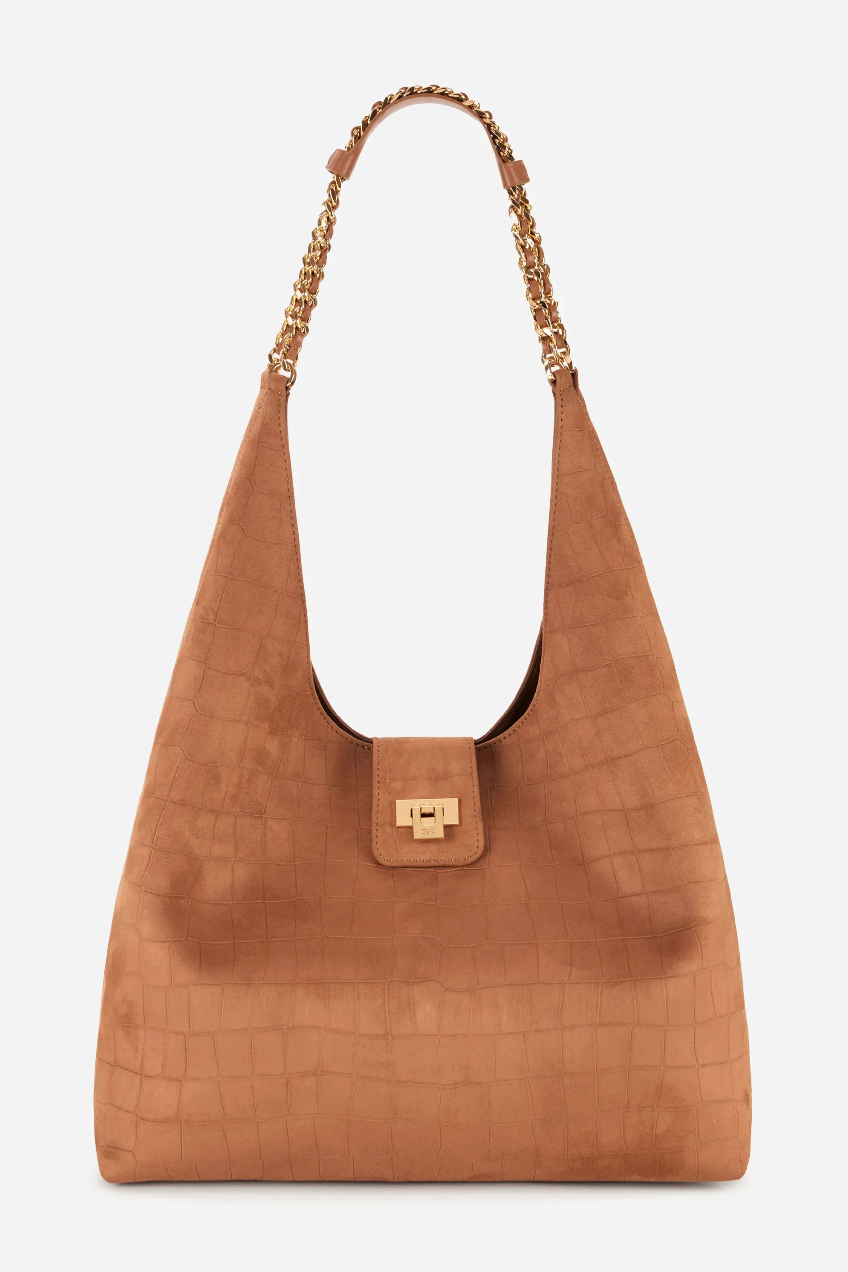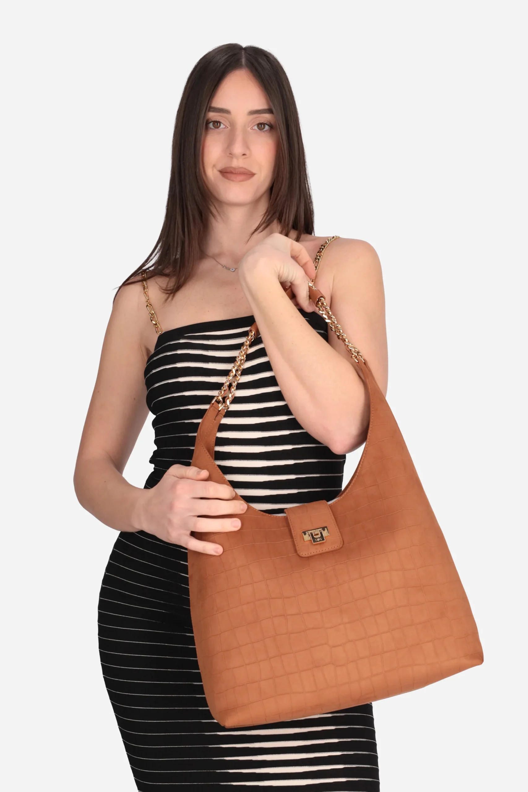 Presenta manici superiori con catena intrecciata in metallo dorato e chiusura con linguetta con placchetta con logo.