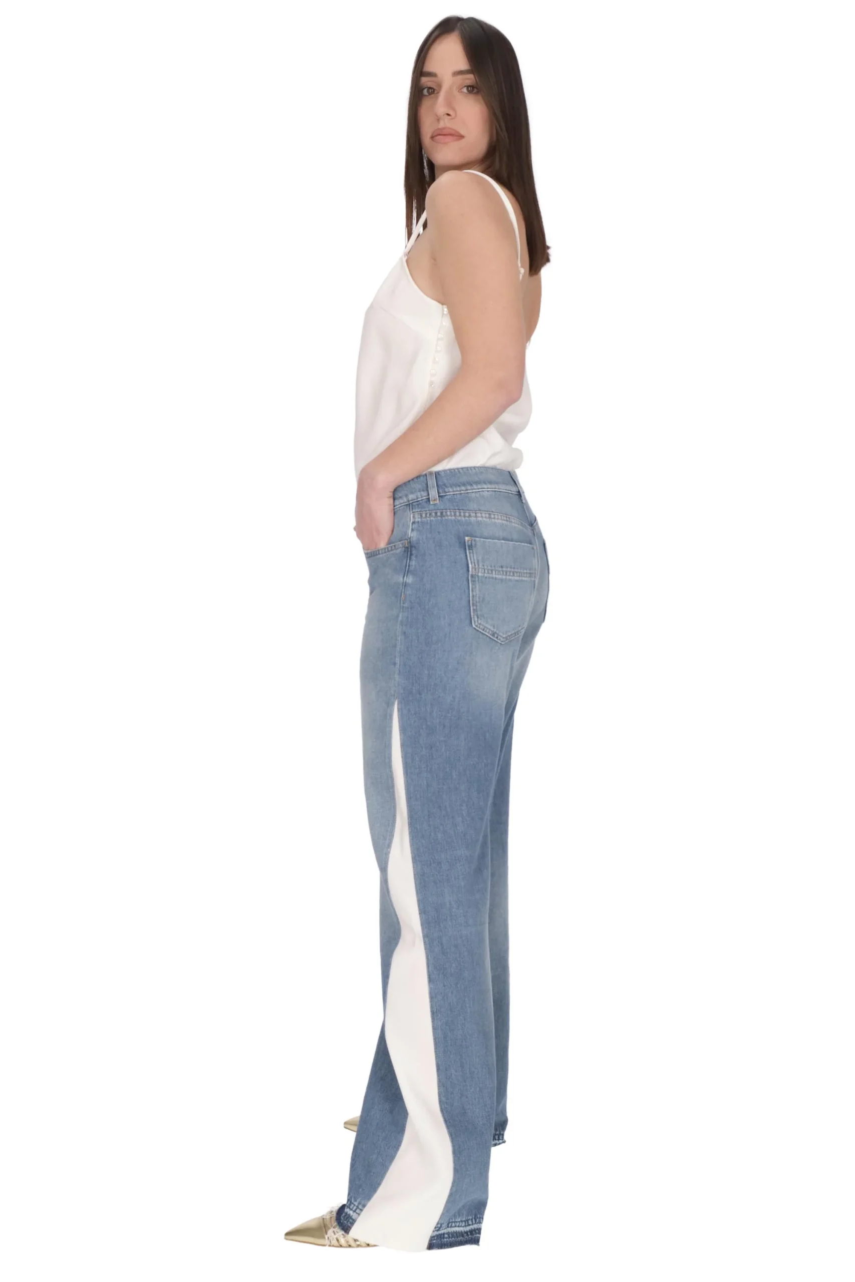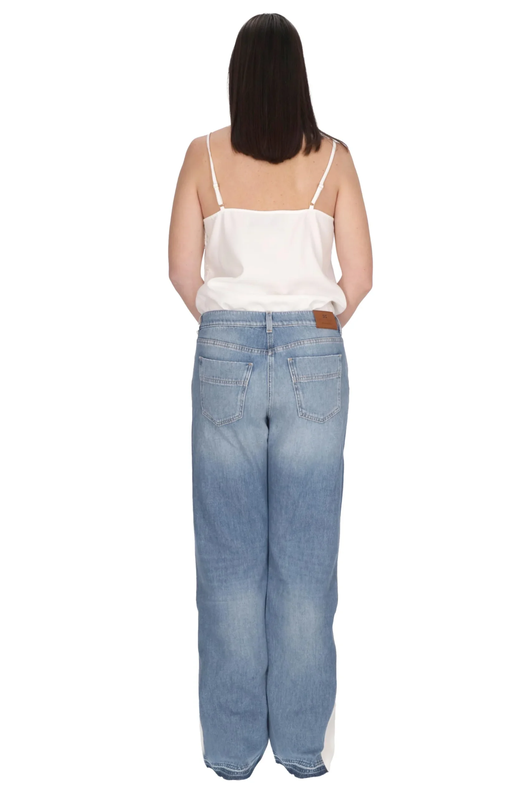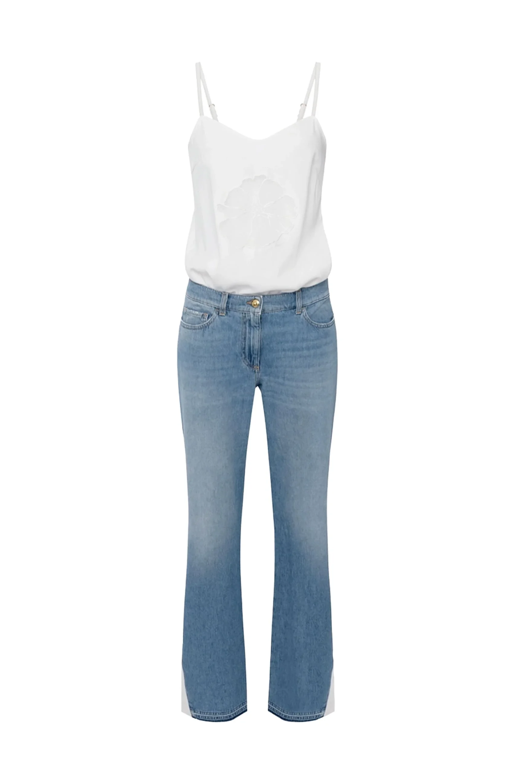 La tuta è realizzata in crêpe nella parte superiore e in denim al fondo.