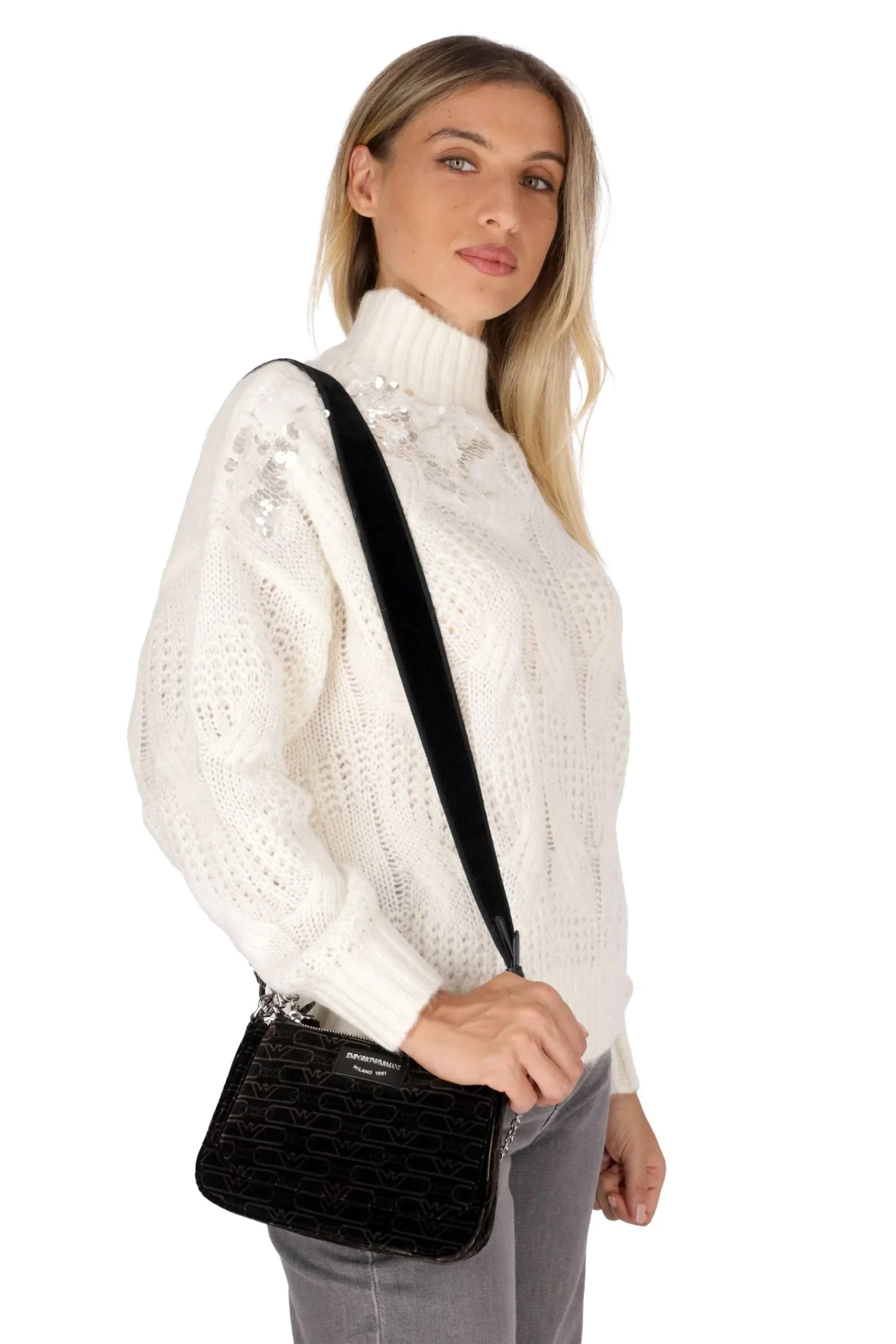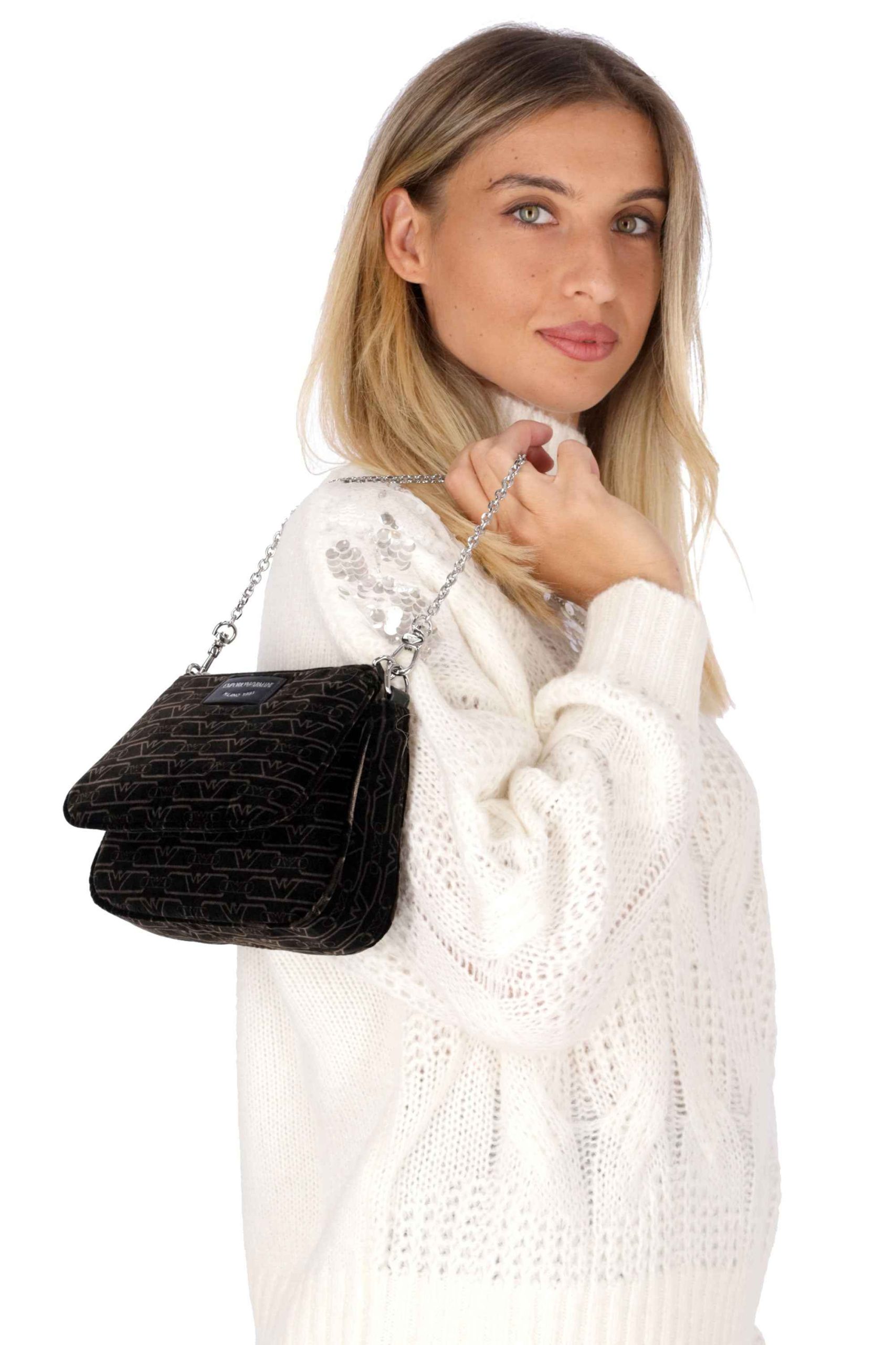 La borsa è realizzata in velluto, con logo sul davanti.