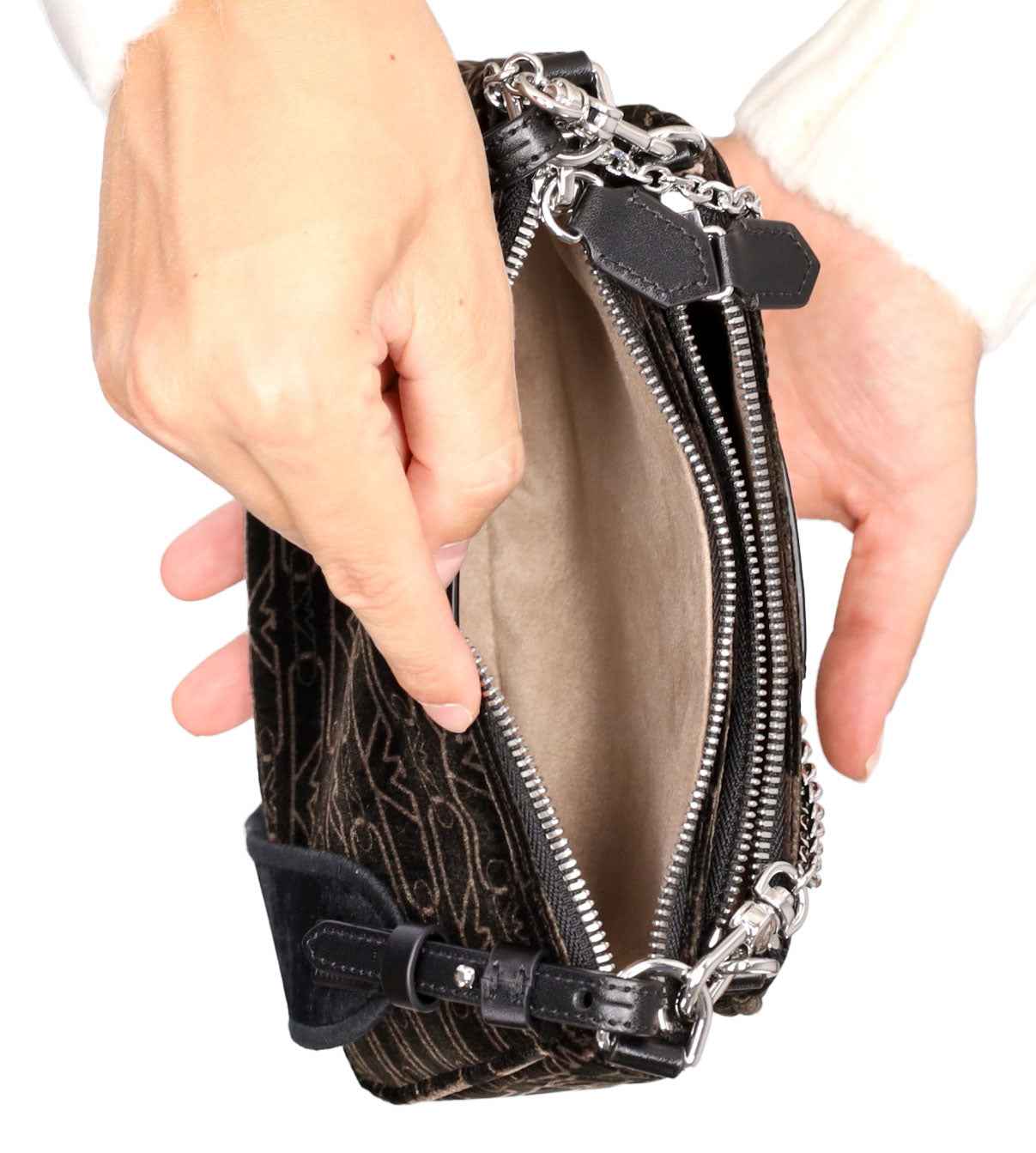 Presenta due scomparti separati uniti da moschettoni, tracollina in catena rimovibile, tracolla regolabile e rimovibile e chiusura con zip.