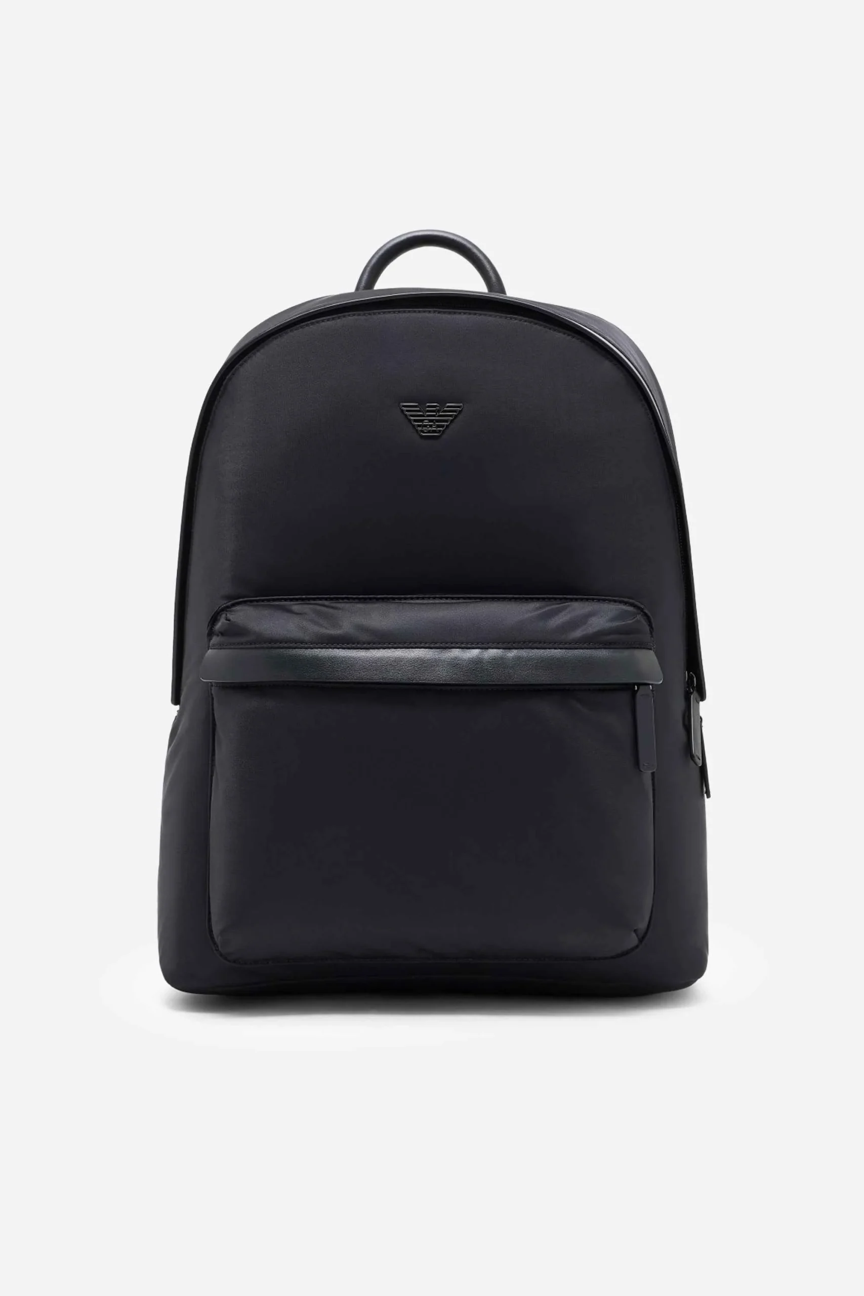 Lo zaino è realizzato in nylon riciclato con dettagli in pelle rigenerata e logo aquila sagomato in metallo sul davanti.