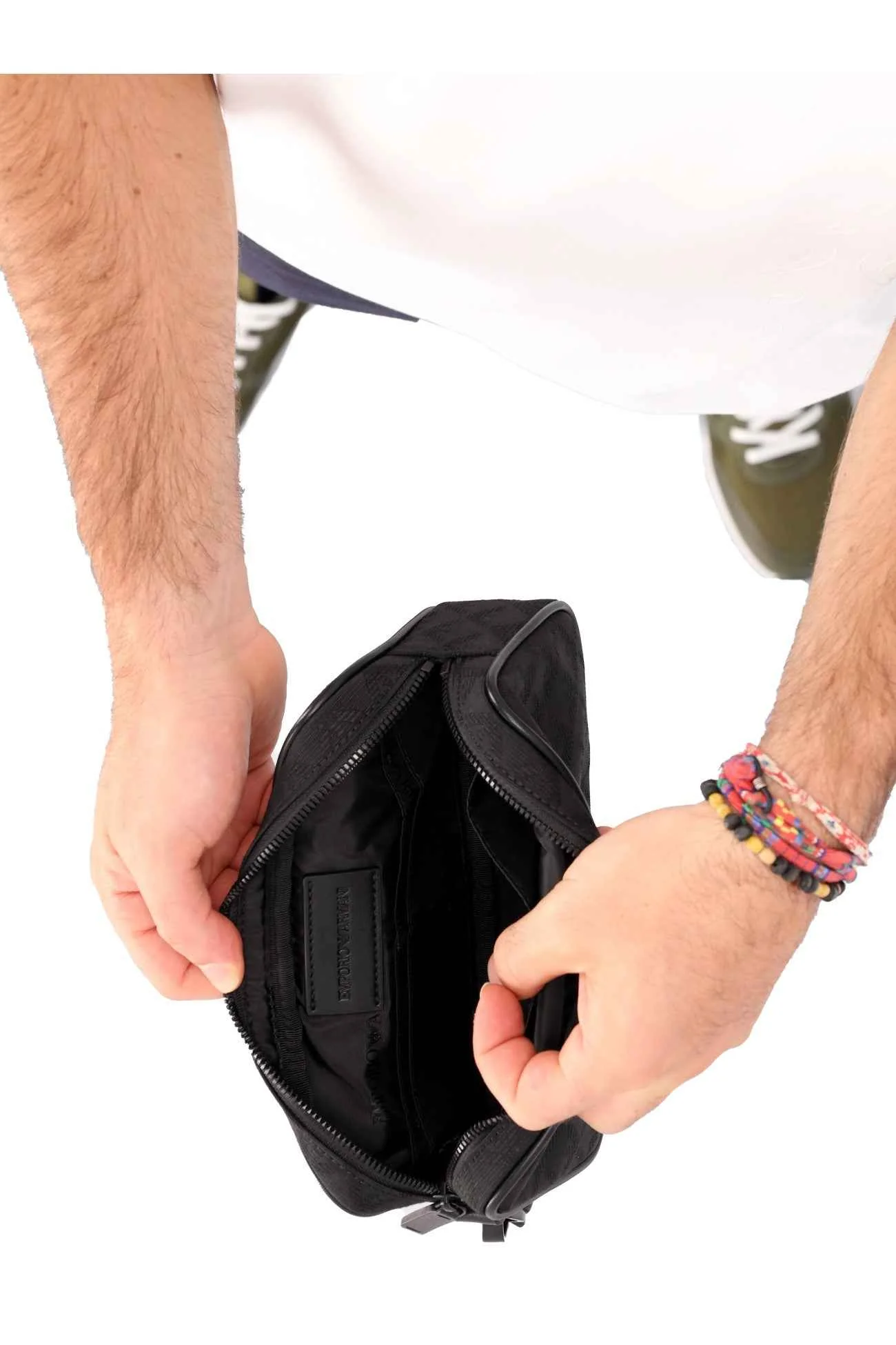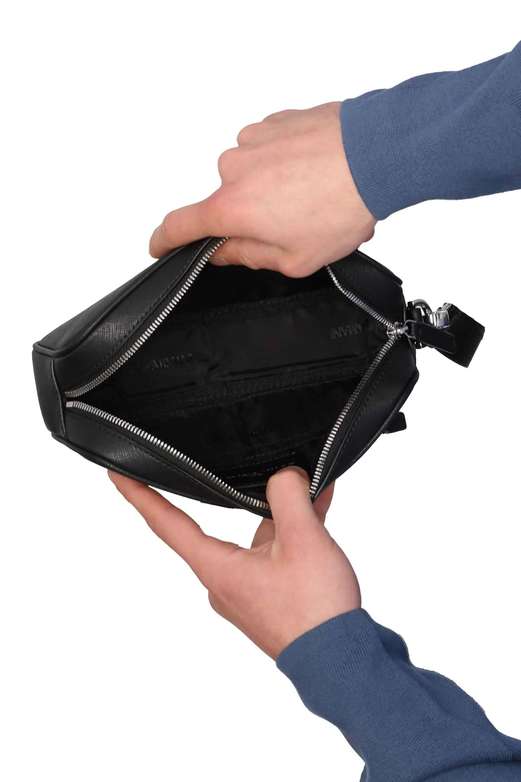 Presenta un manico da polso rimovibile, con chiusura zip e l’interno foderato.