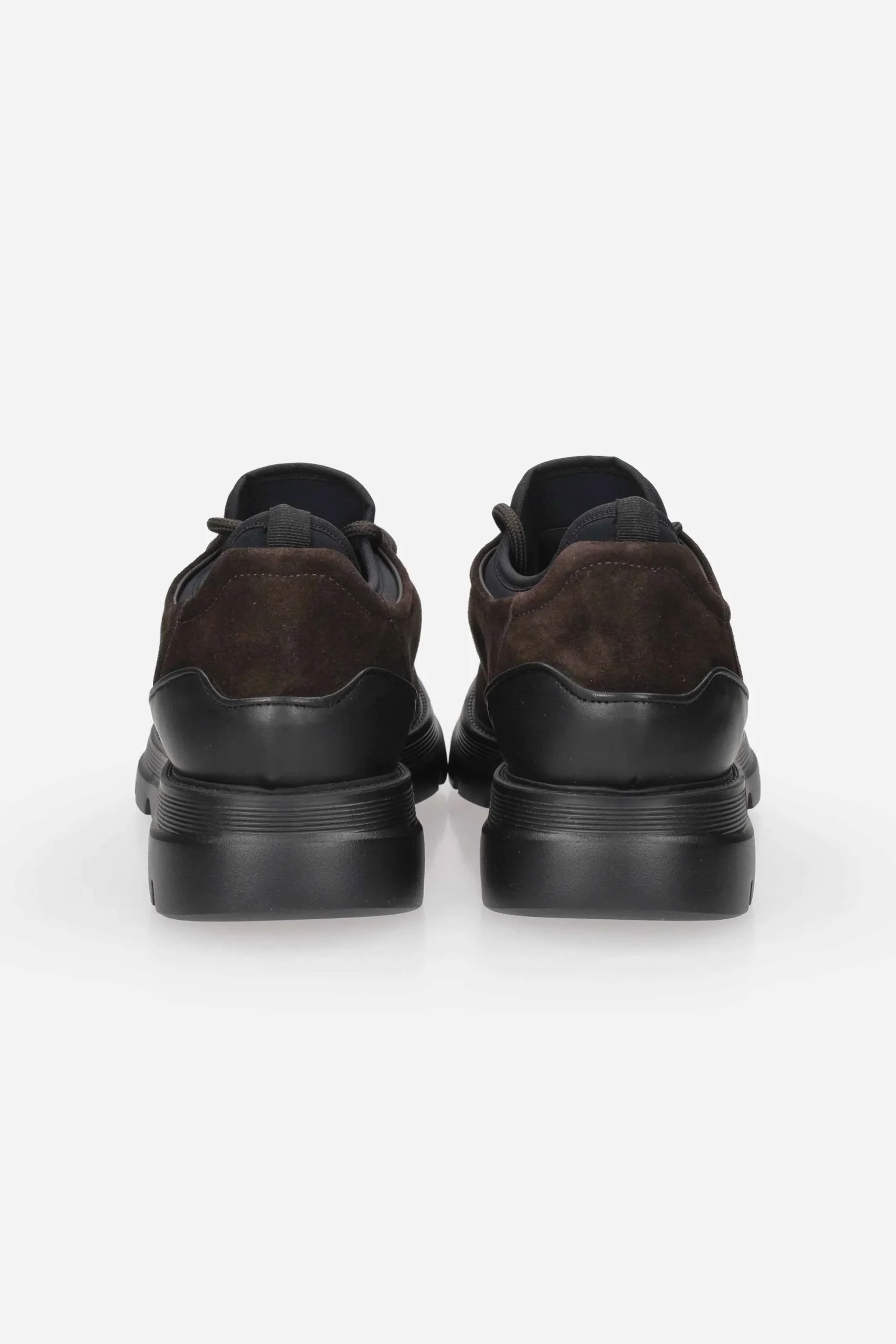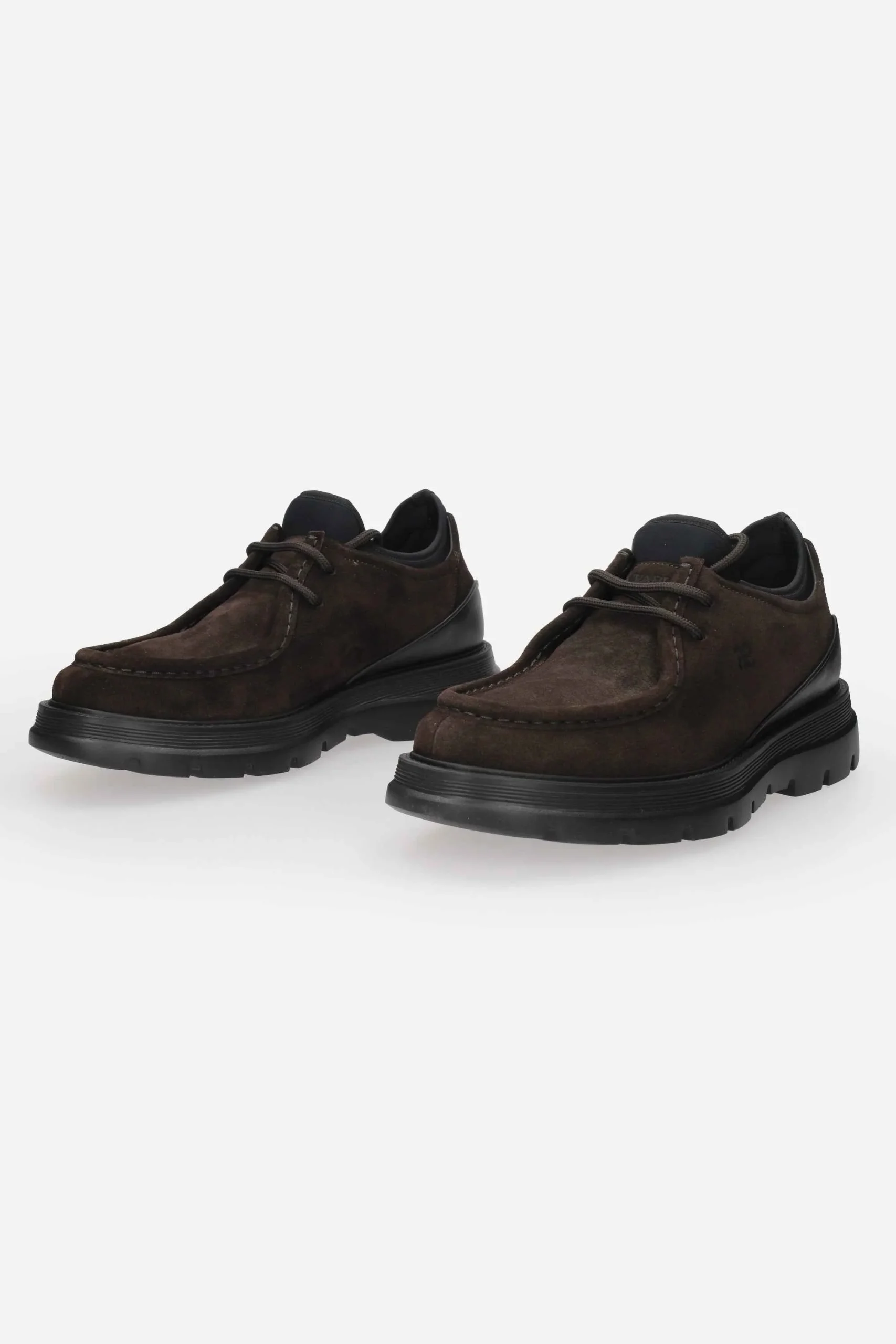 Stringata modello mocassino realizzato in camoscio e inserto in pelle sul retro.