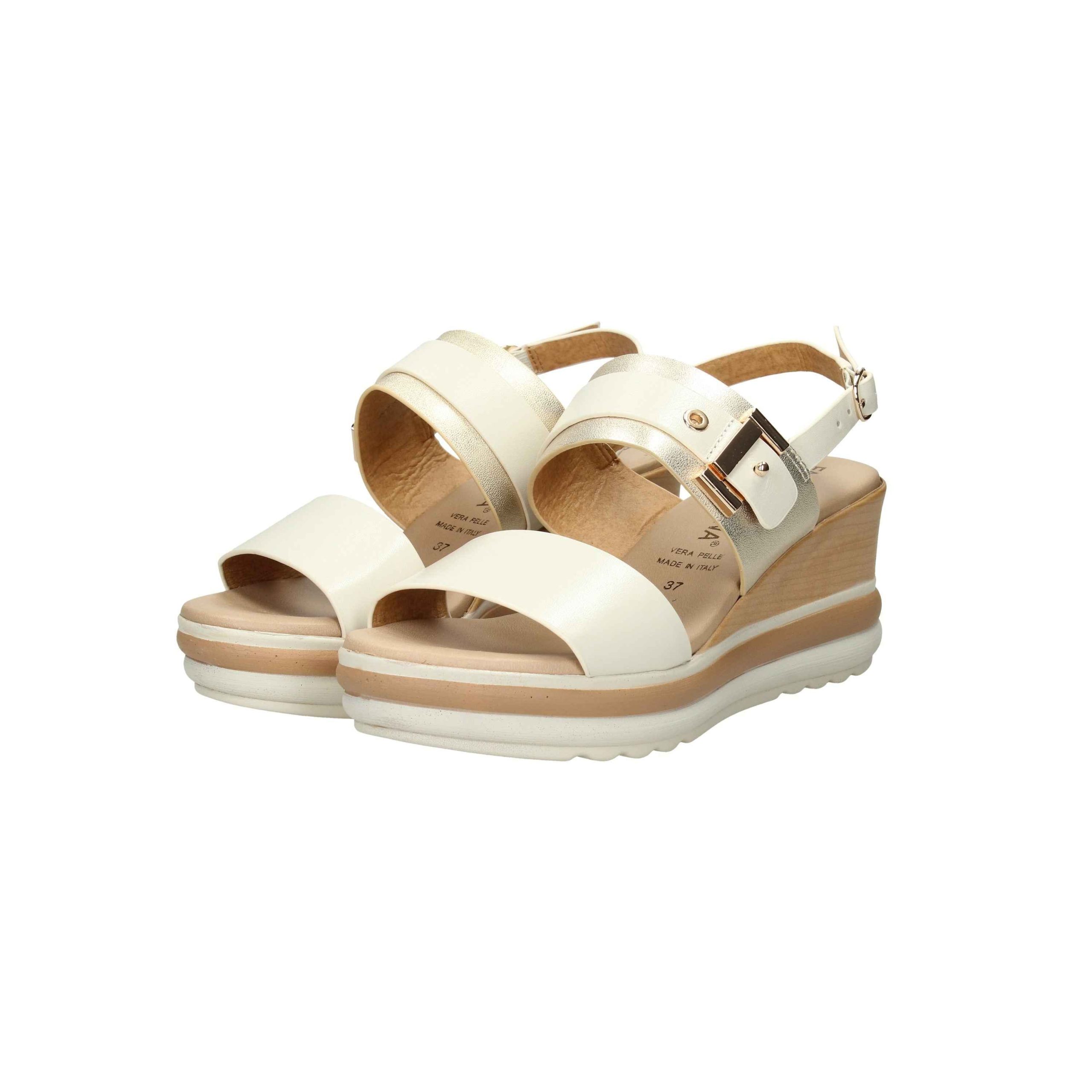 Presenta strisce sul davanti, cinturino sul tallone con chiusura fibbia regolabile, plantare in pelle.