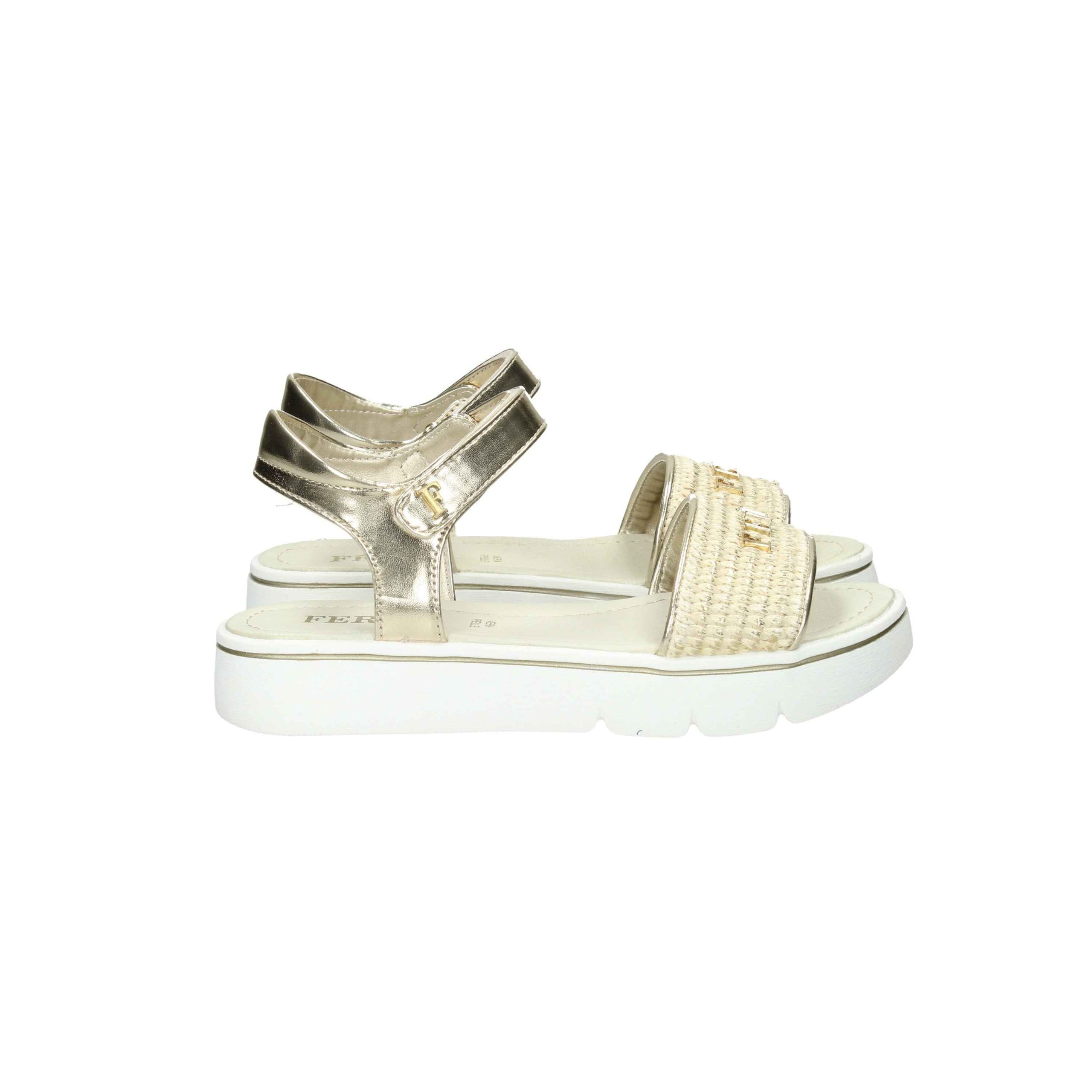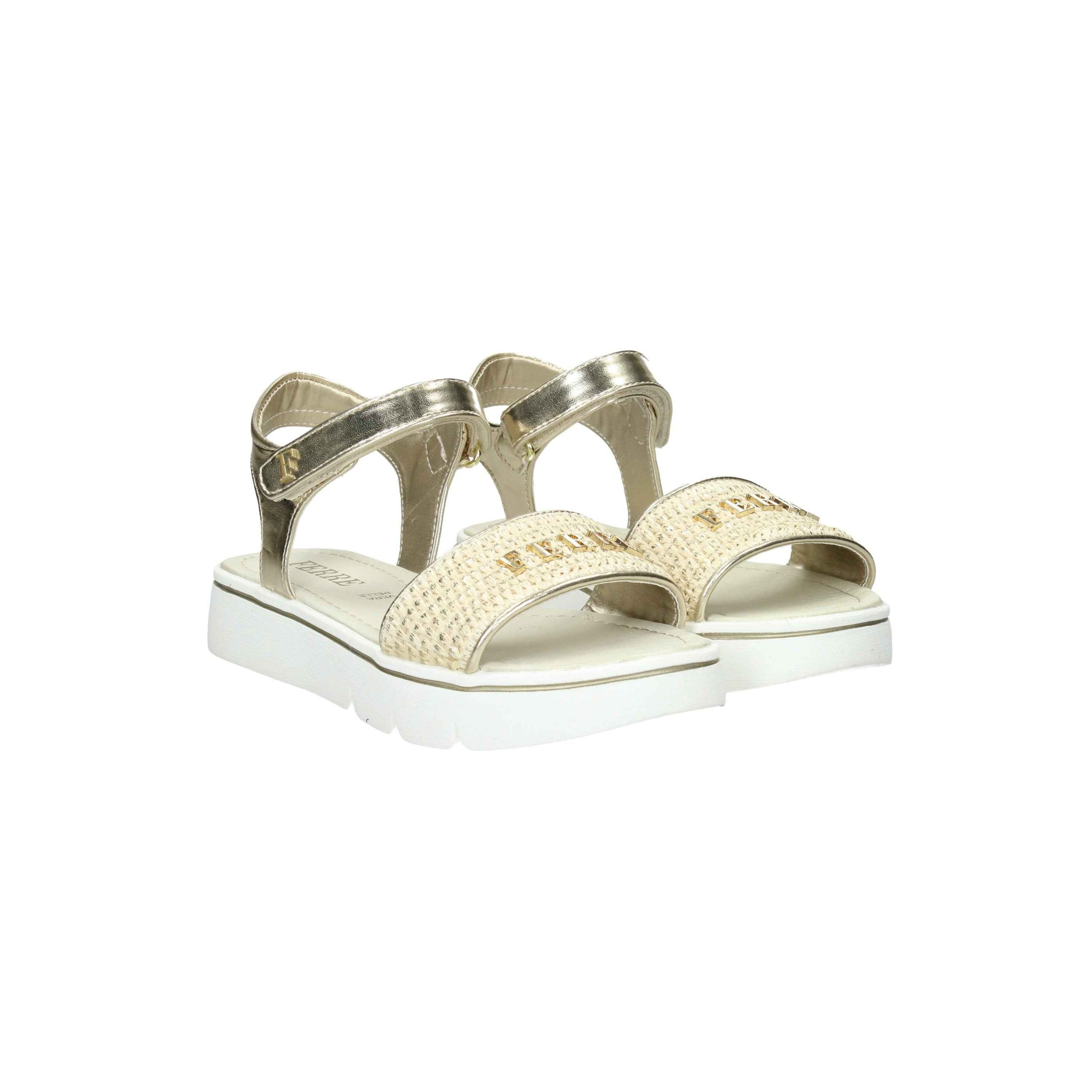 Il sandalo è realizzato in ecopelle laminata e raffia.