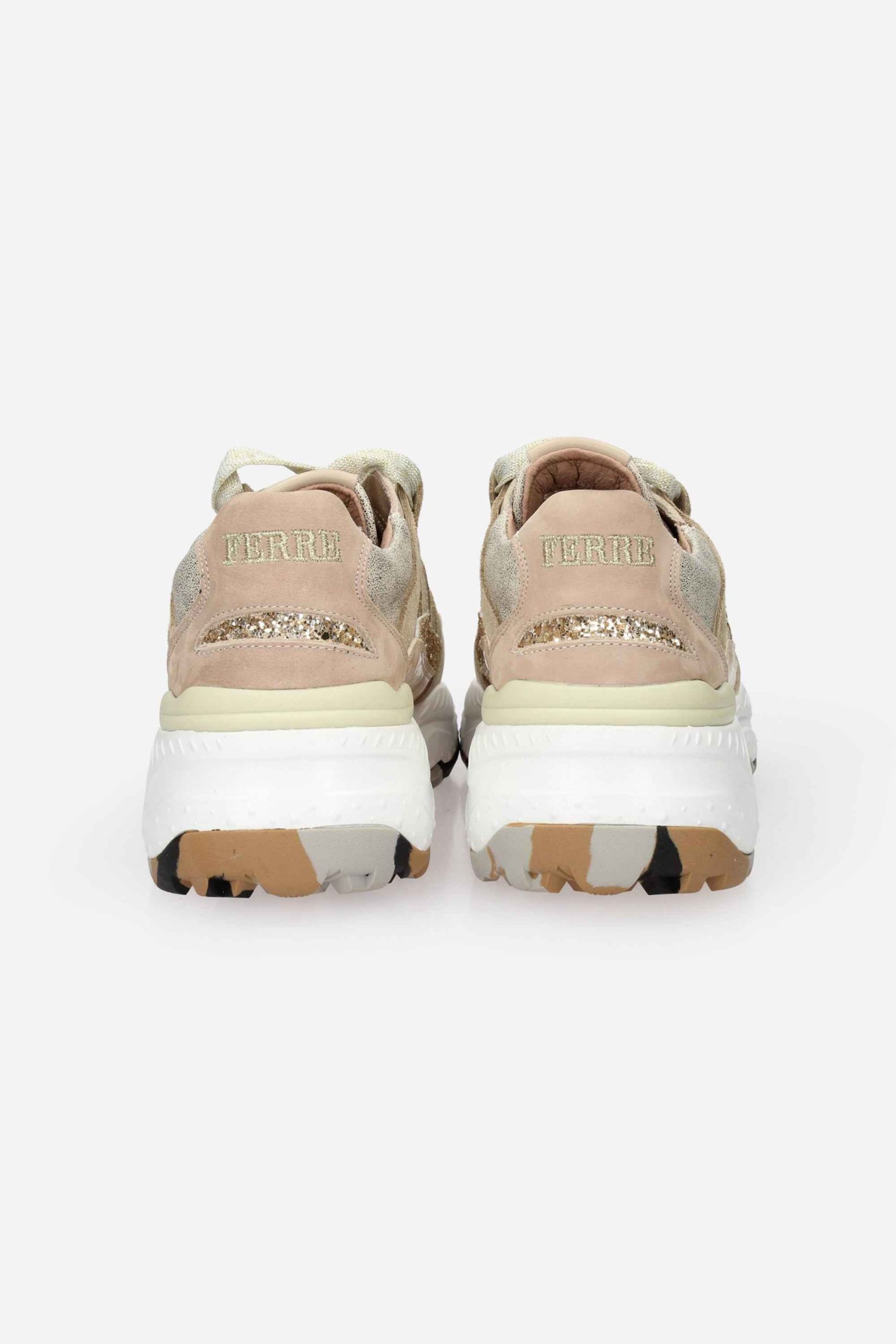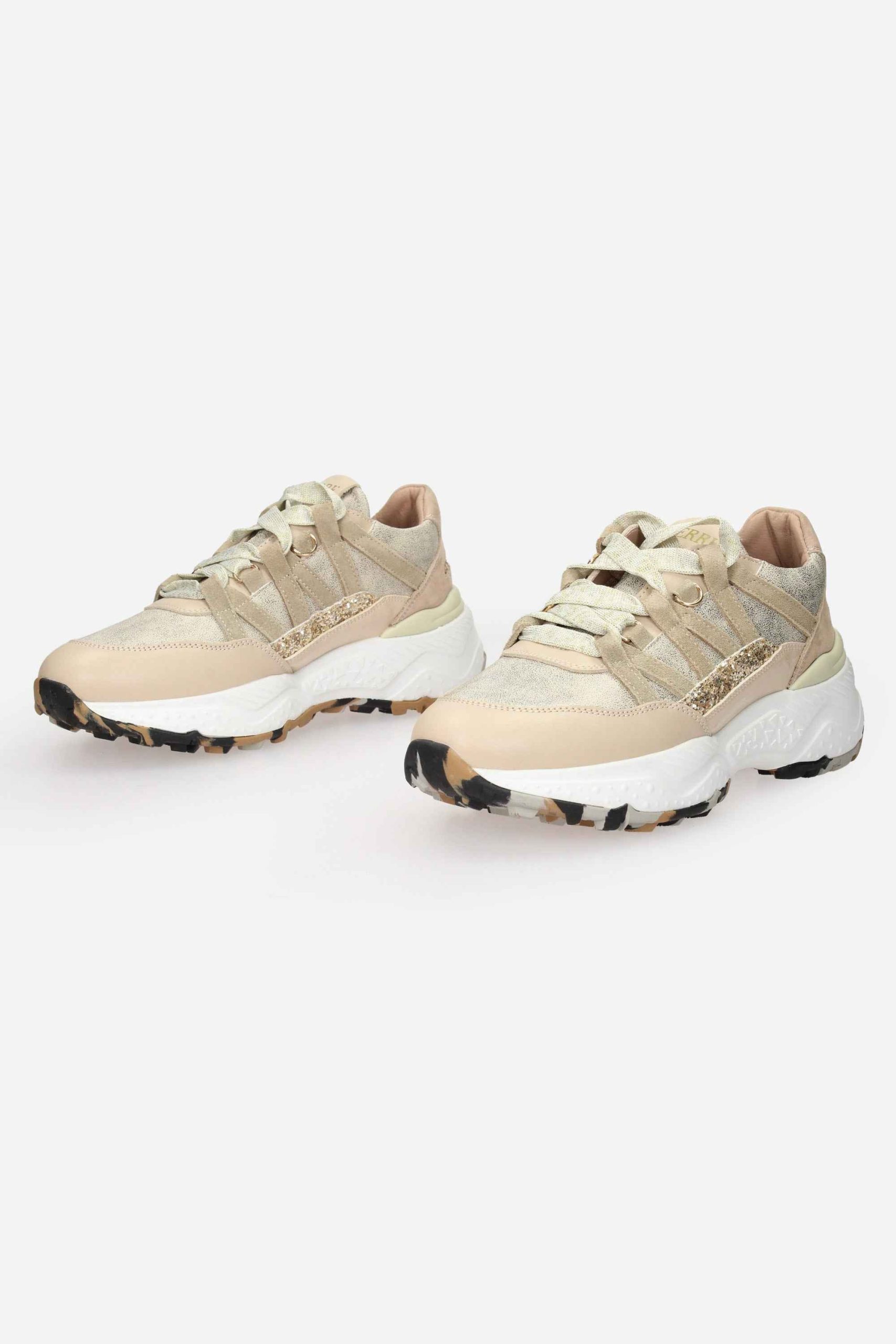 La sneakers è realizzata in pelle e pelle laminata con dettagli glitter.