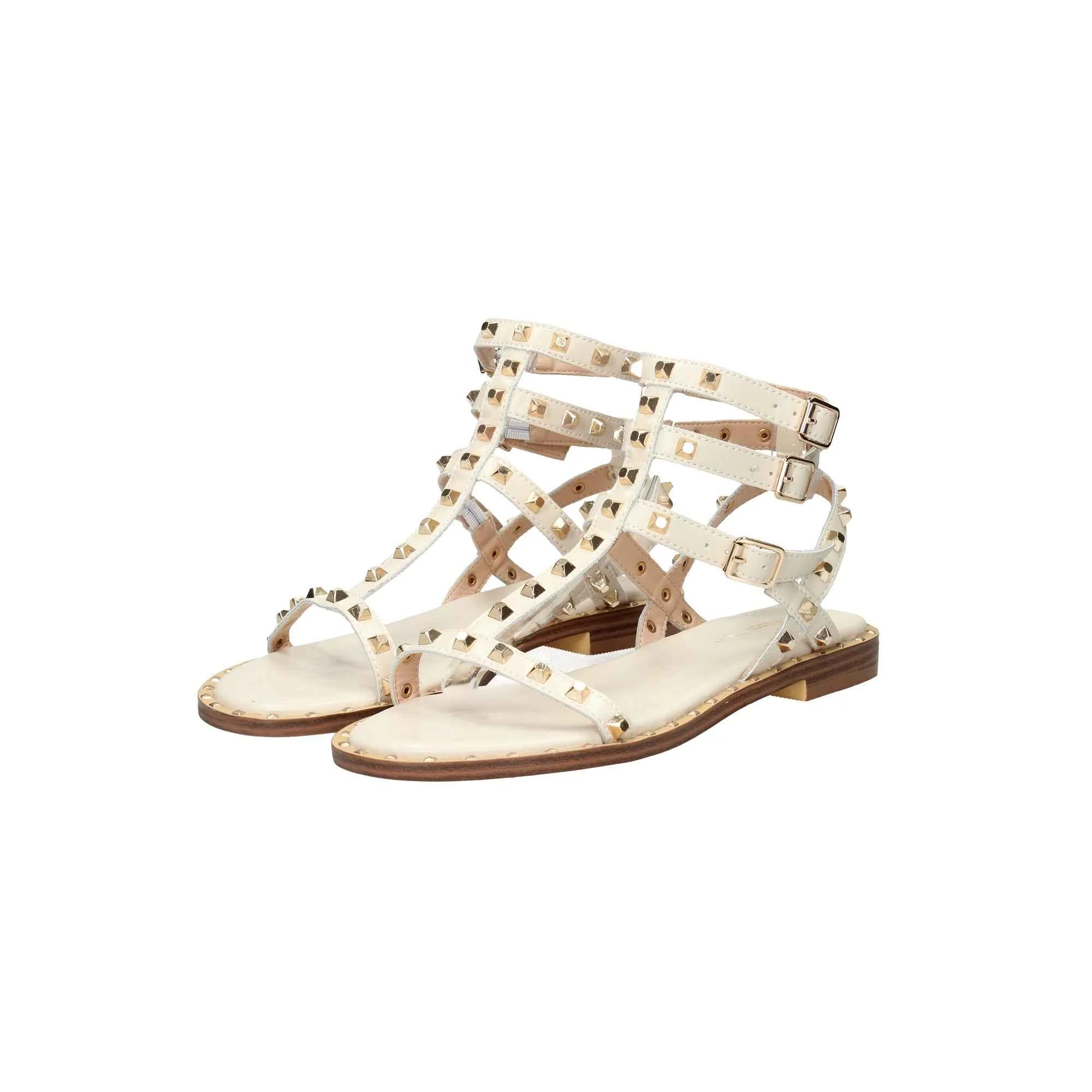 Presenta fasce sul davanti con borchie, cinturini alla caviglia con fibbia regolabile.