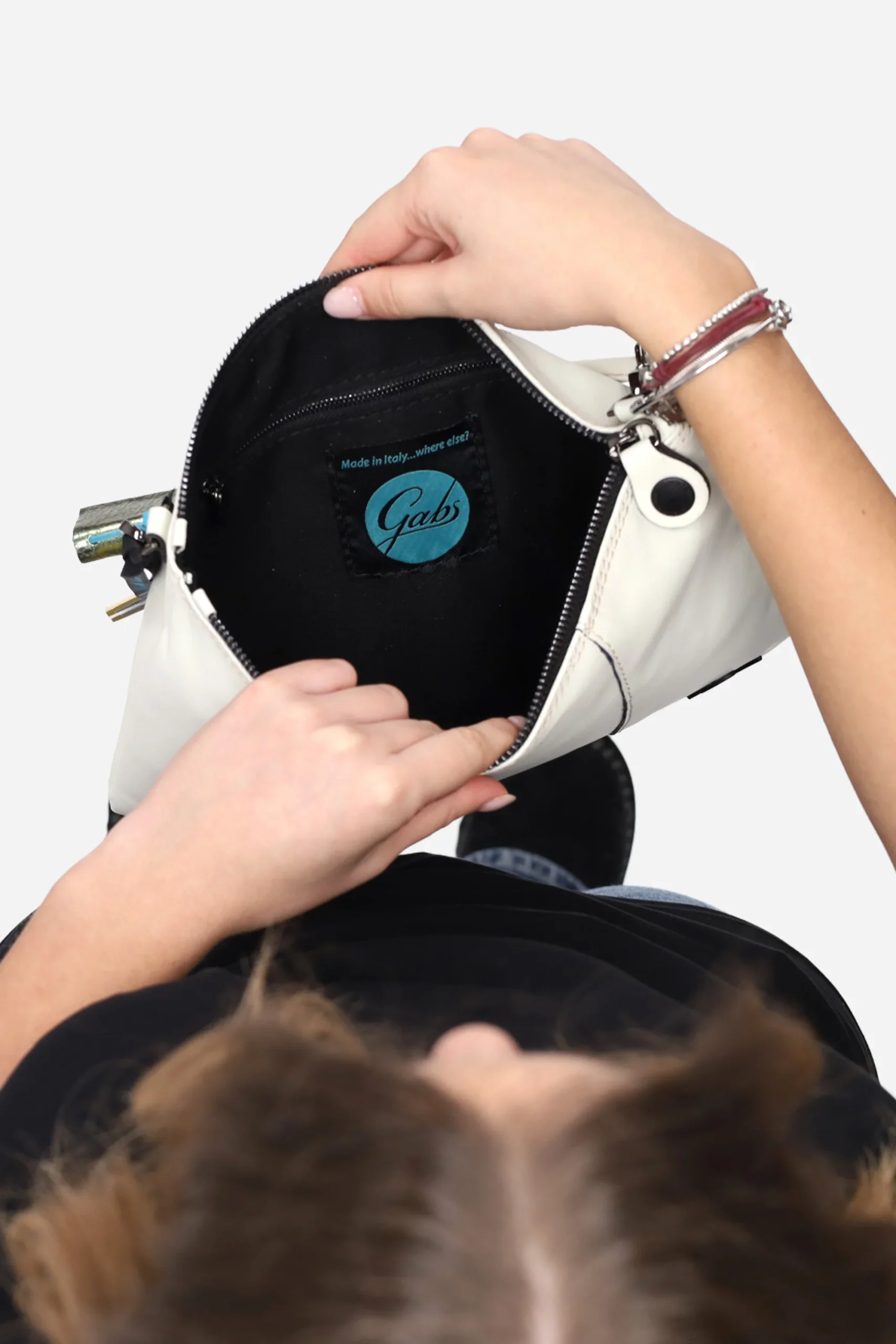 Presenta charms agendina rimovibile, chiusura con zip, tracolla regolabile e rimovibile.