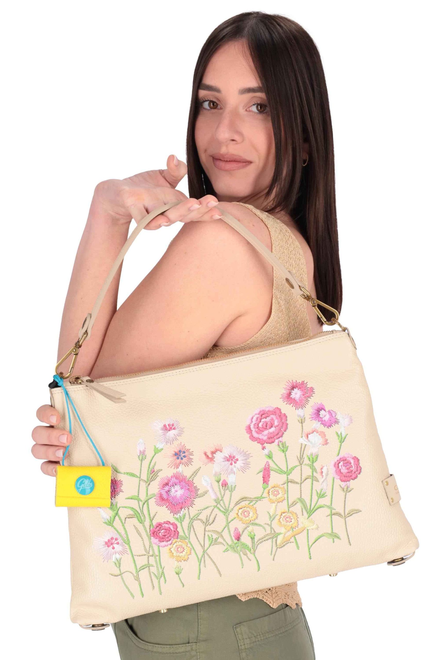 La borsa è realizzata in pelle con ricamo sul davanti e agendina come charms.
