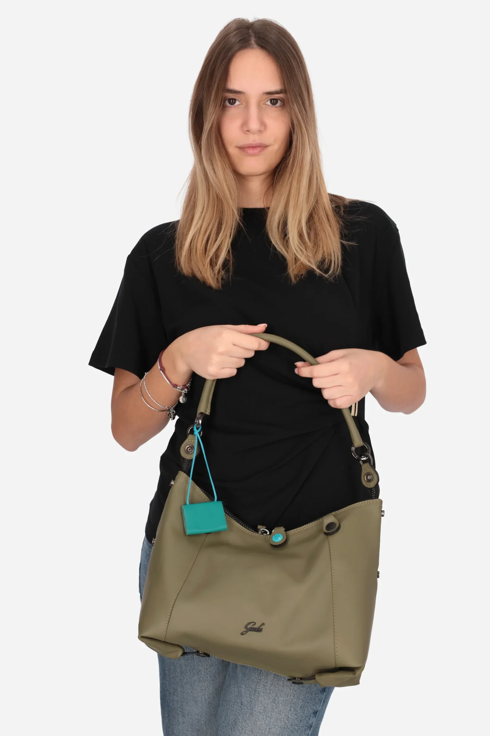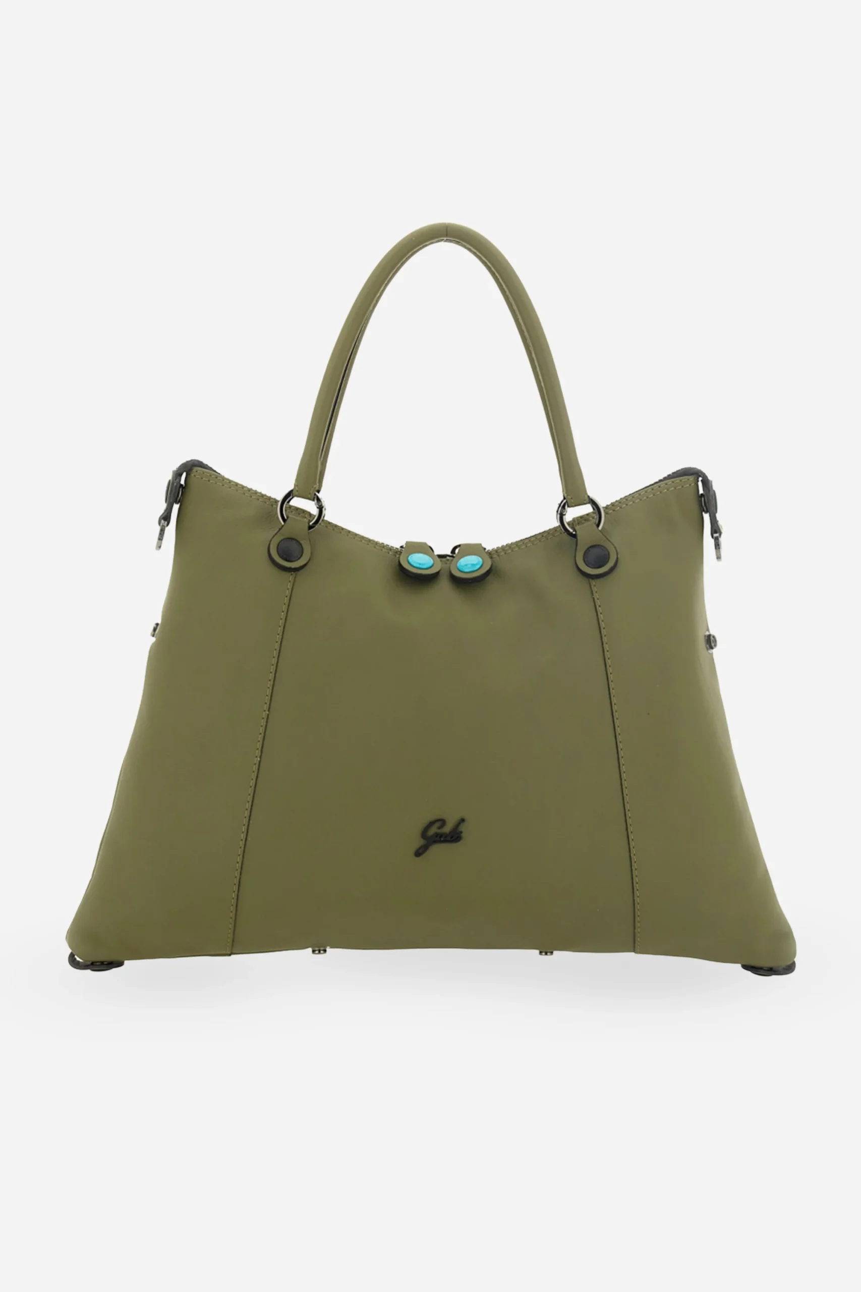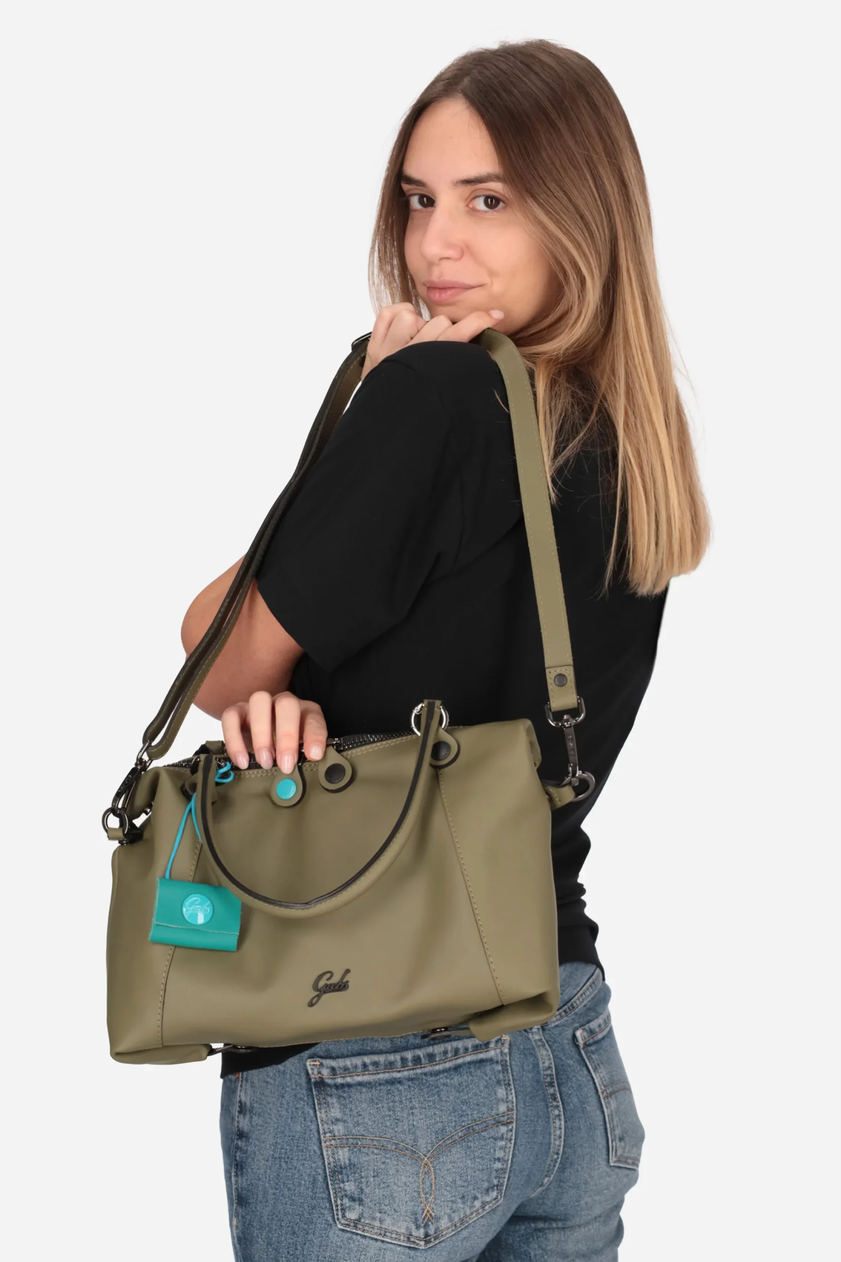 Presenta manici superiori, chiusura con zip doppio cursore, charms block notes rimovibile, tracolla regolabile e rimovibile, bottoni sul fondo e laterali per varie combinazioni.