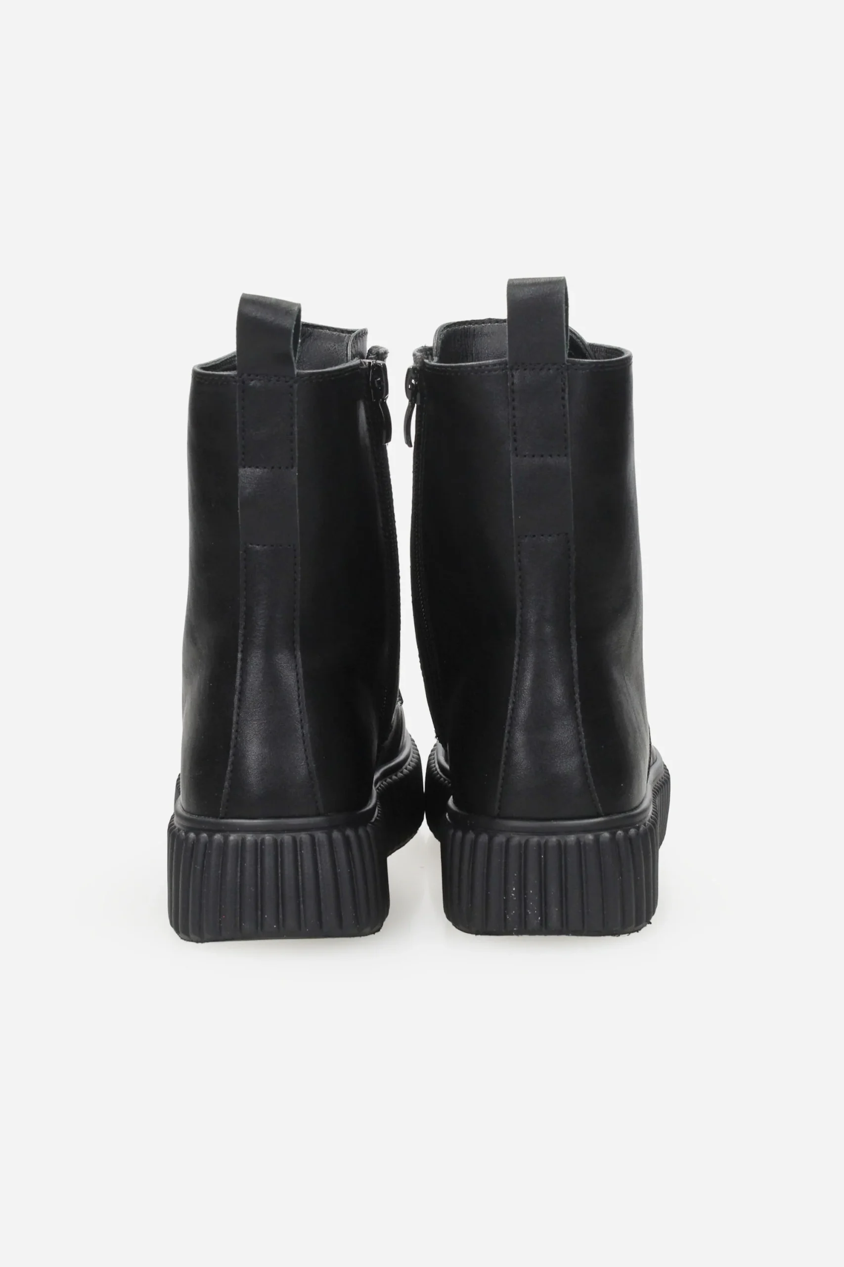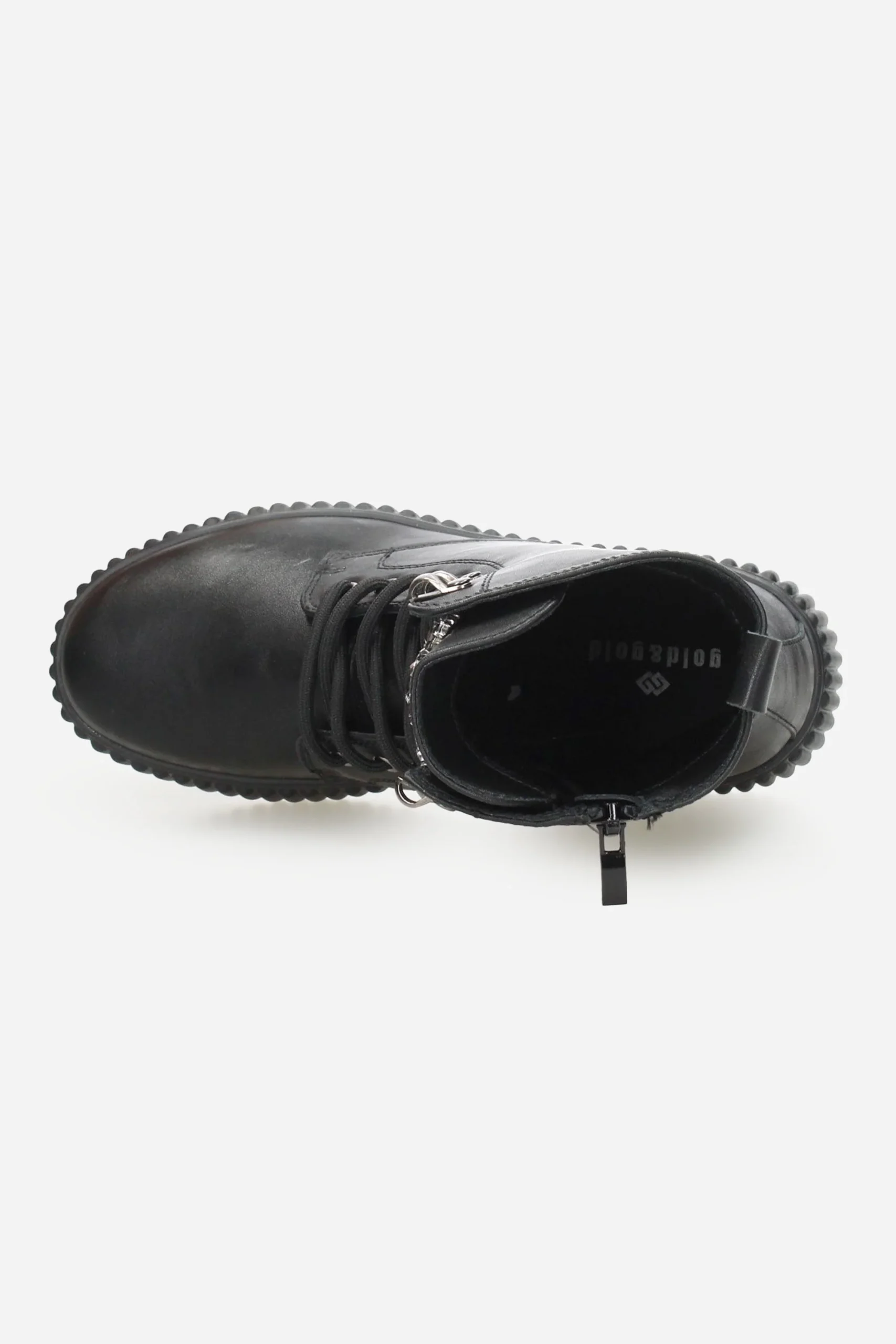 Presenta chiusura con zip sul lato interno, lacci sul davanti, tirante sul retro, interno foderato con plantare in pelle.
