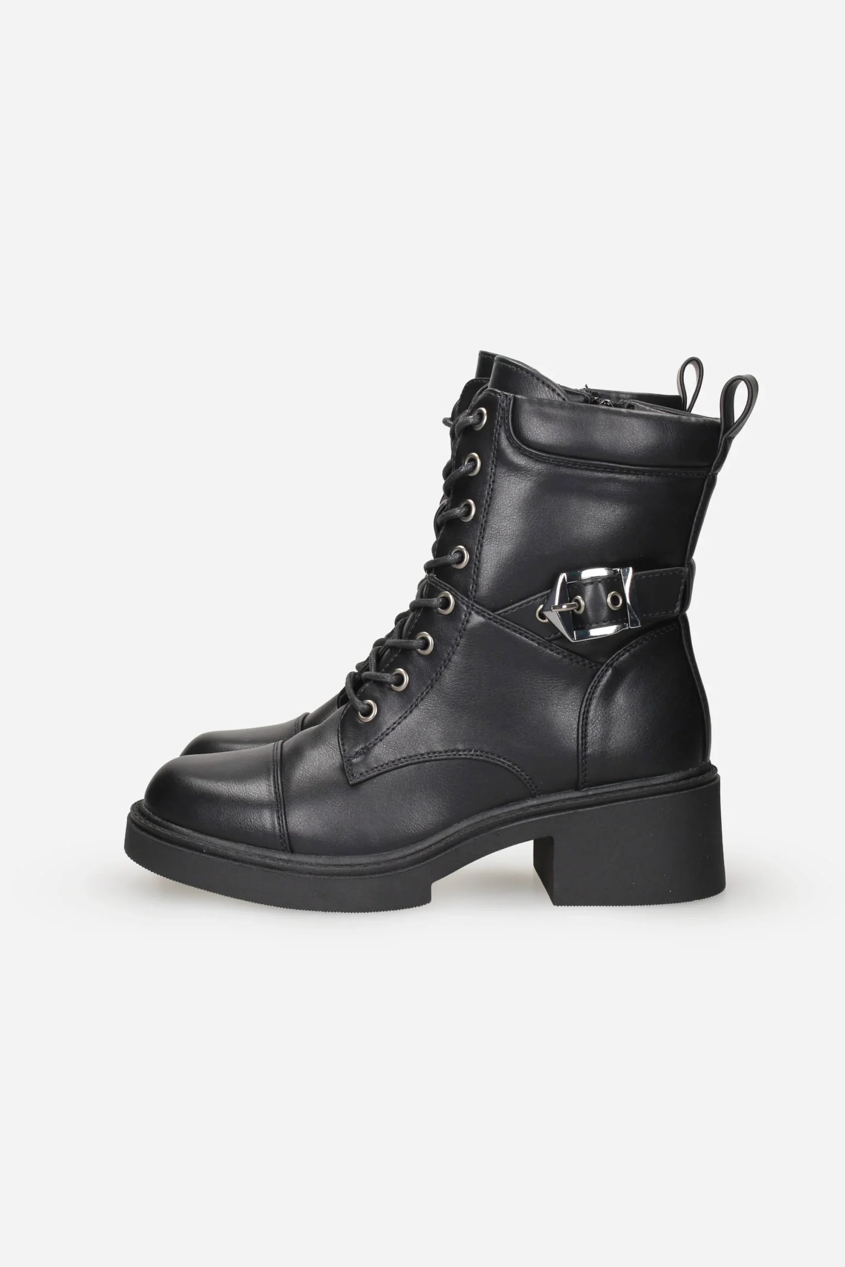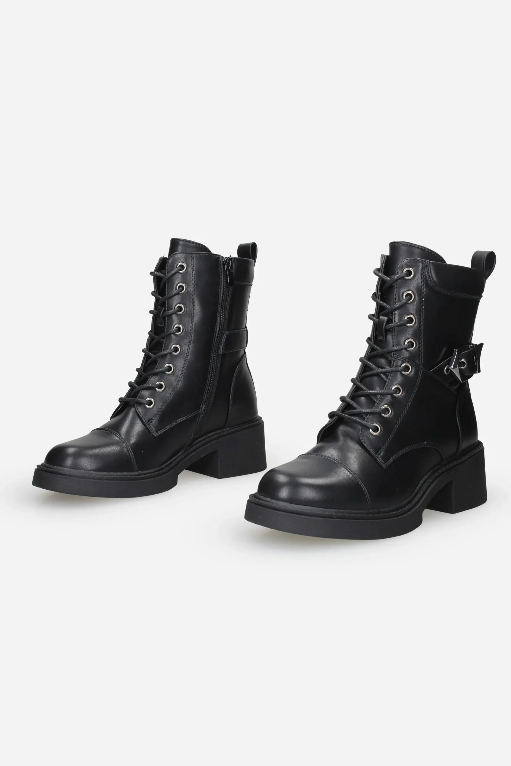 Presenta chiusura con lacci in cotone sul davanti, fibbia regolabile nella parte laterale esterna e cerniera nella parte interna della calzatura.