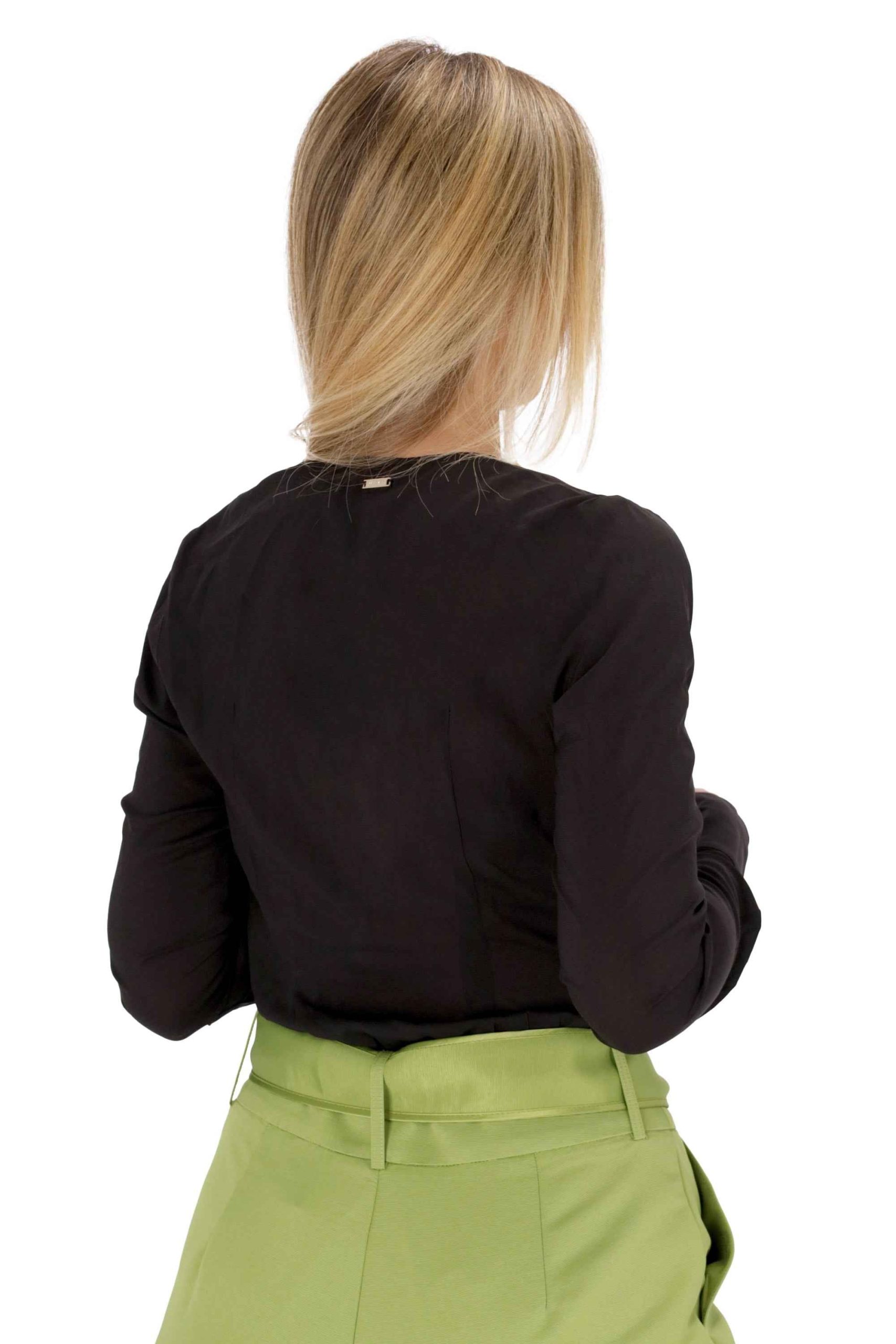 Presenta maniche lunghe con bottoni sui polsi e scollatura a V.