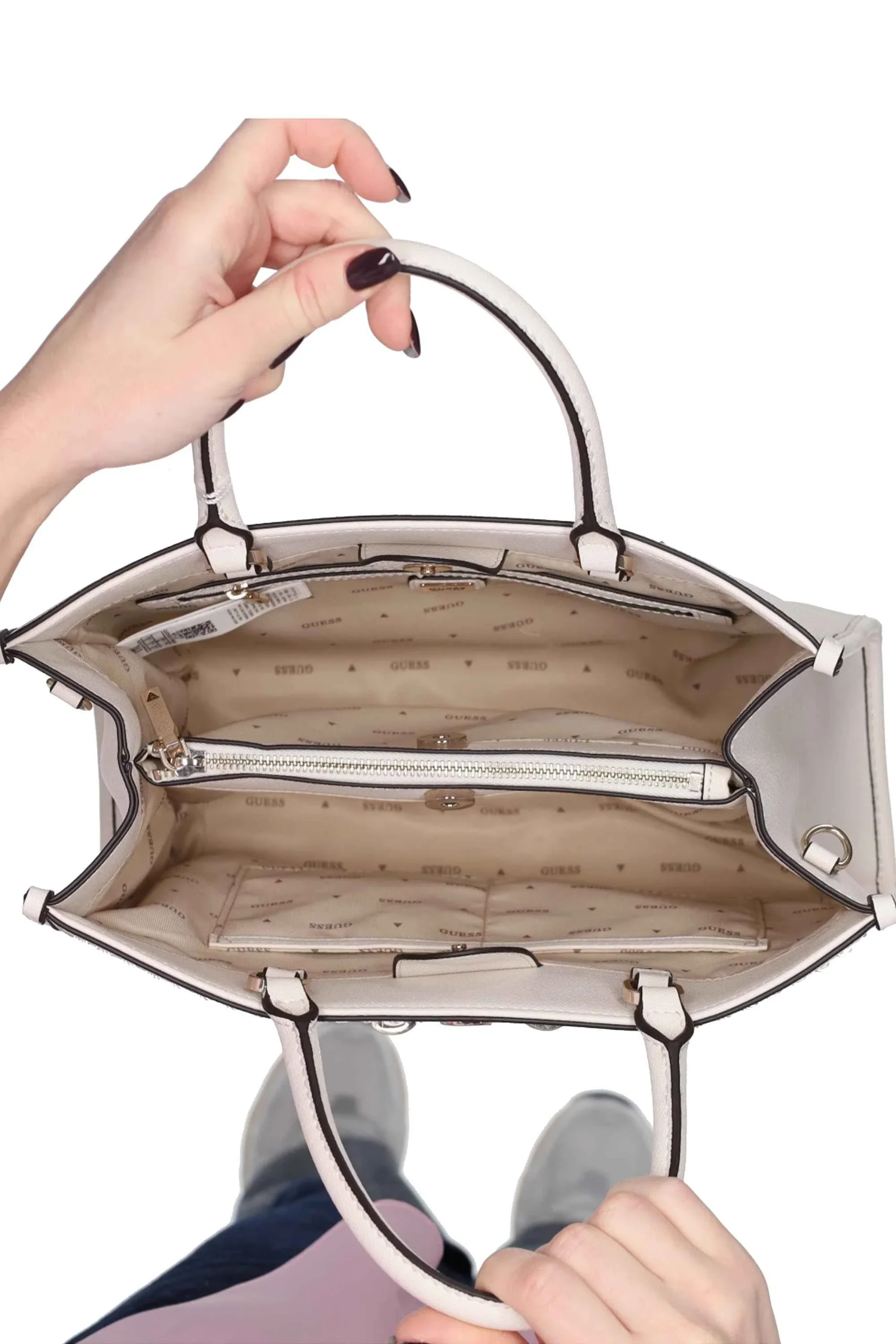 L’interno è foderata con tasca a parete con zip e tramezza con zip.